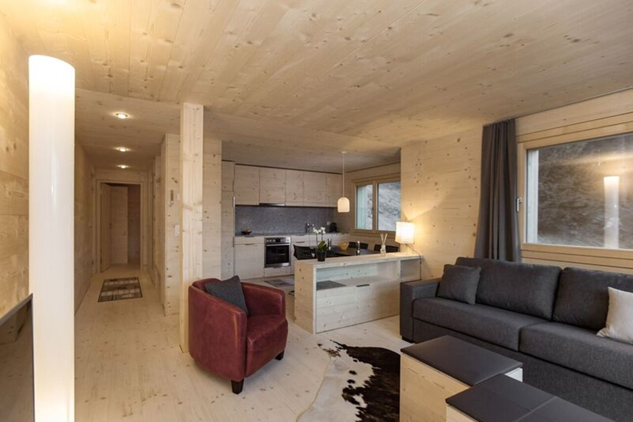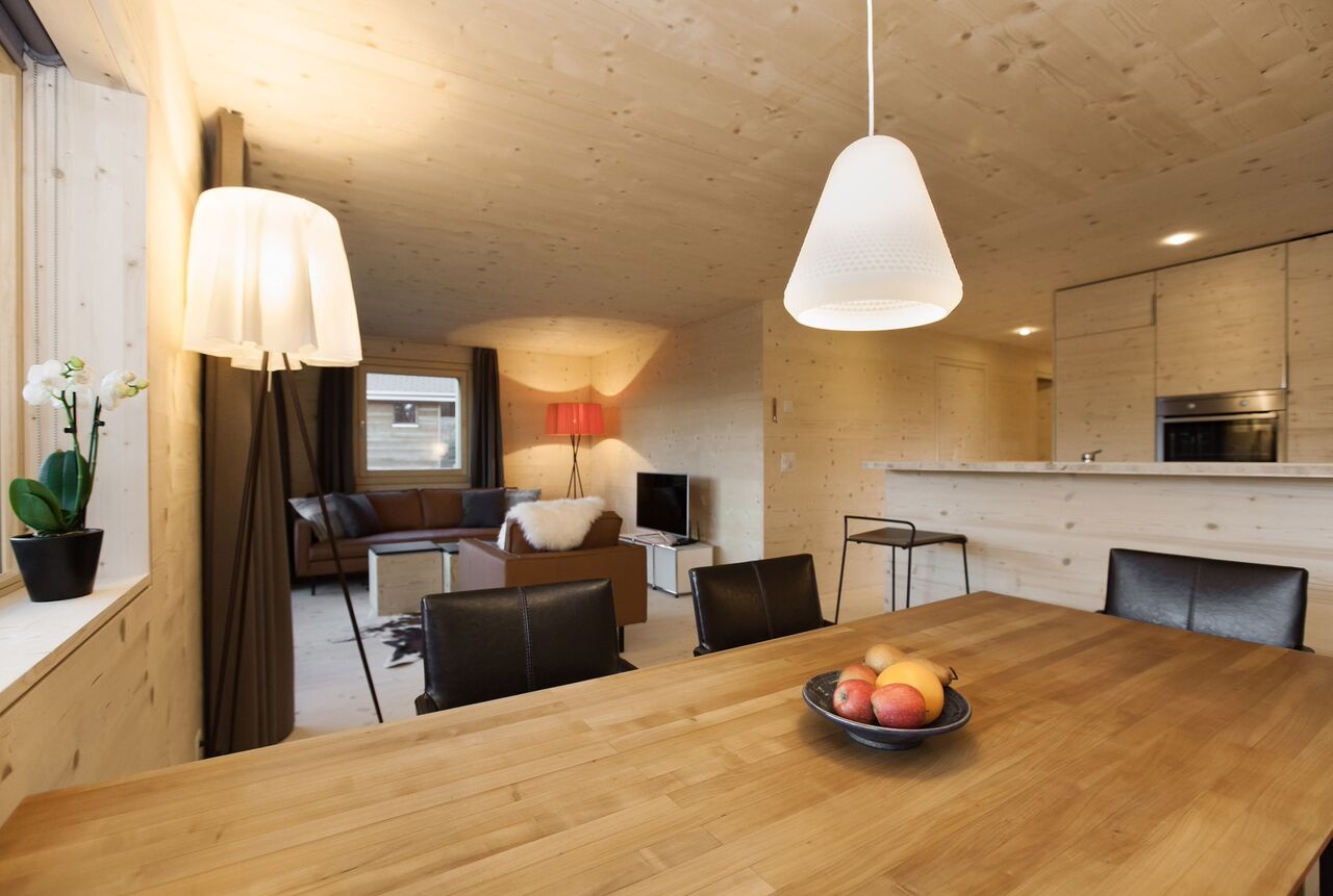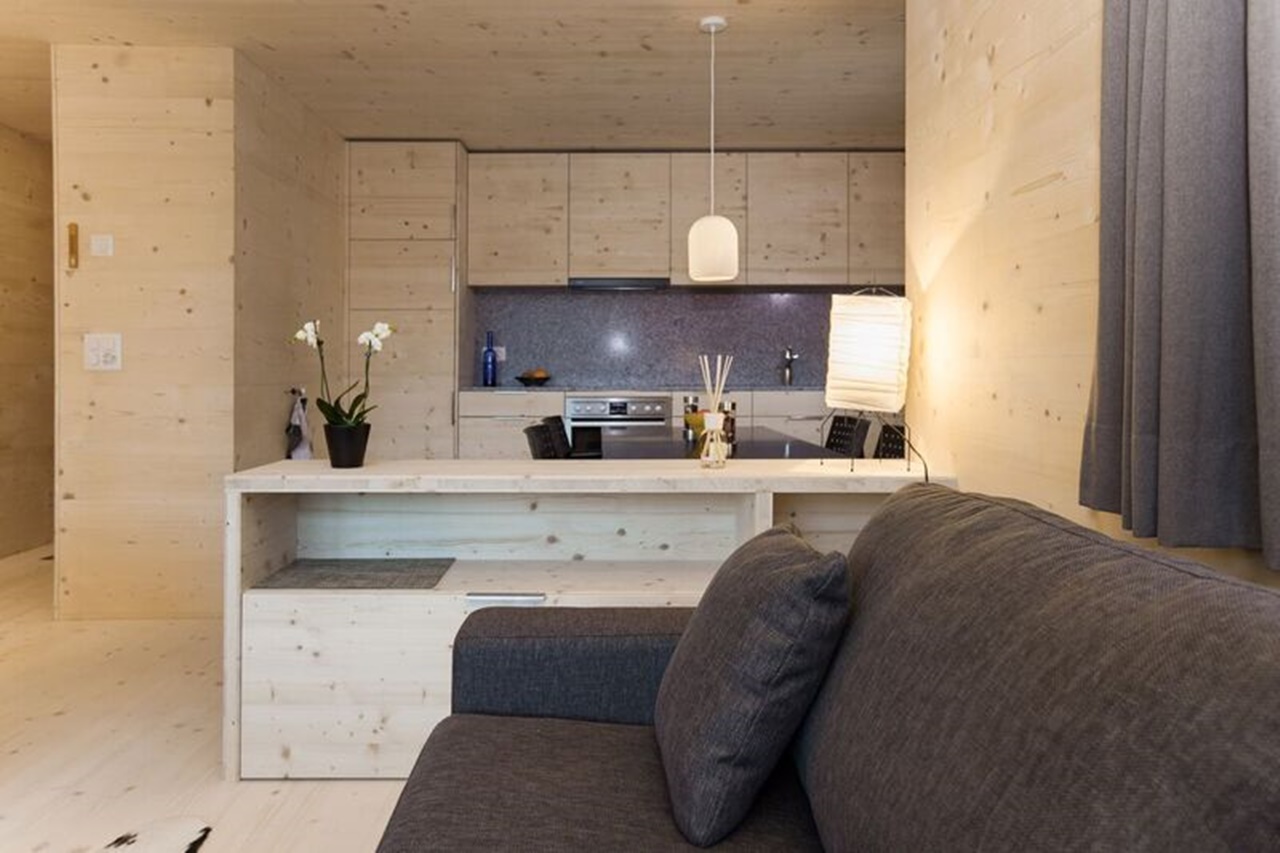 Der Ausbau der Wohnungen wurde in Fichtenholz, modern und komfortabel umgesetzt. Die Wohnungen sind mit Einbauten wie Garderobe und Schränken ausgestattet, sowie vollständig möbliert. Die Küchen bieten Kühl-/Gefrierschrank, Induktionsherd, Backofen, Geschirrspüler und Kaffeemaschine.Technische Einrichtung