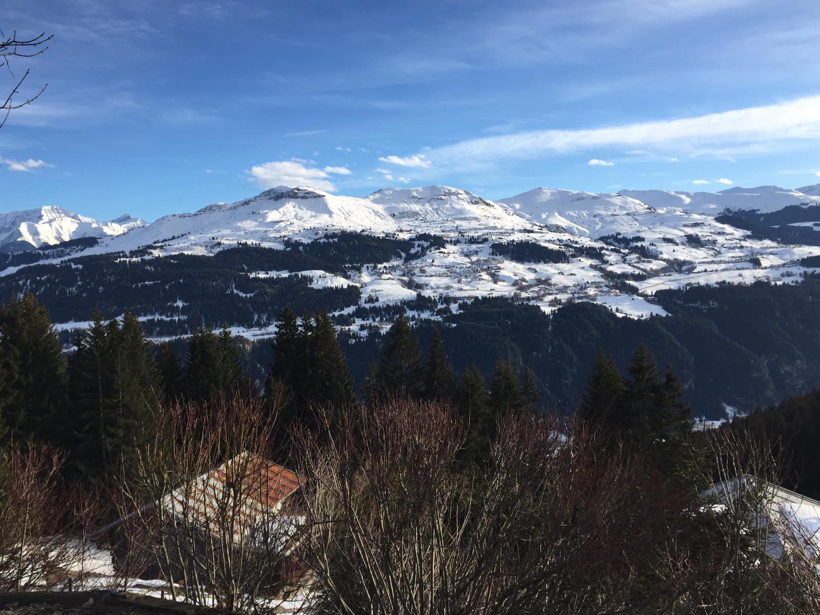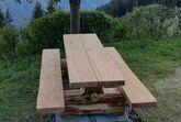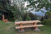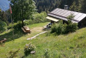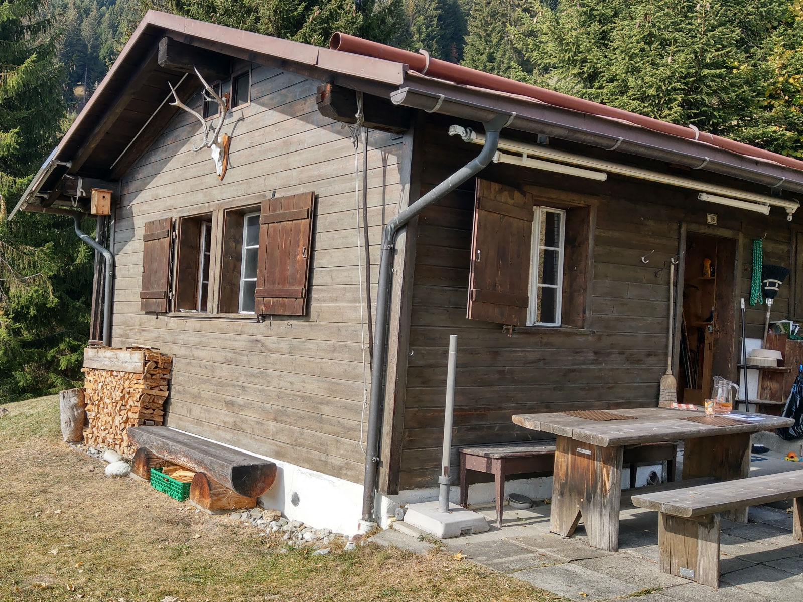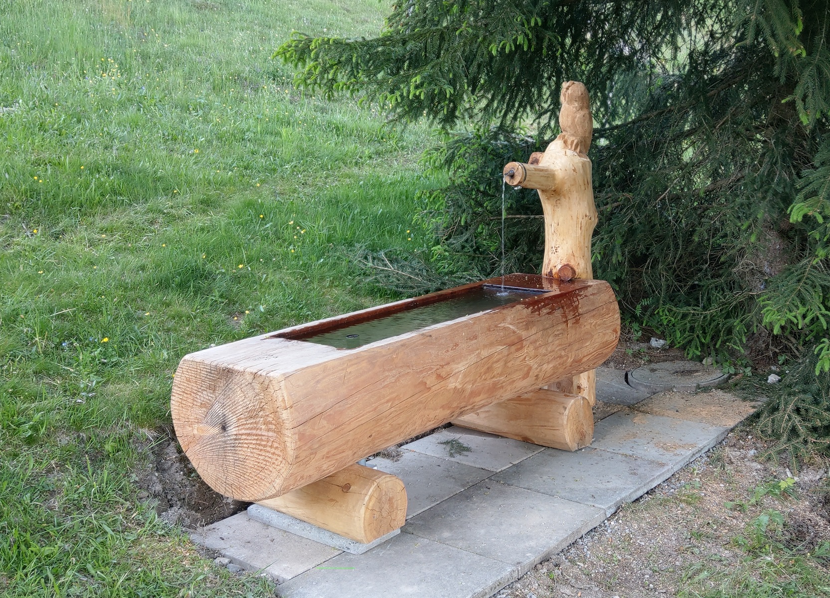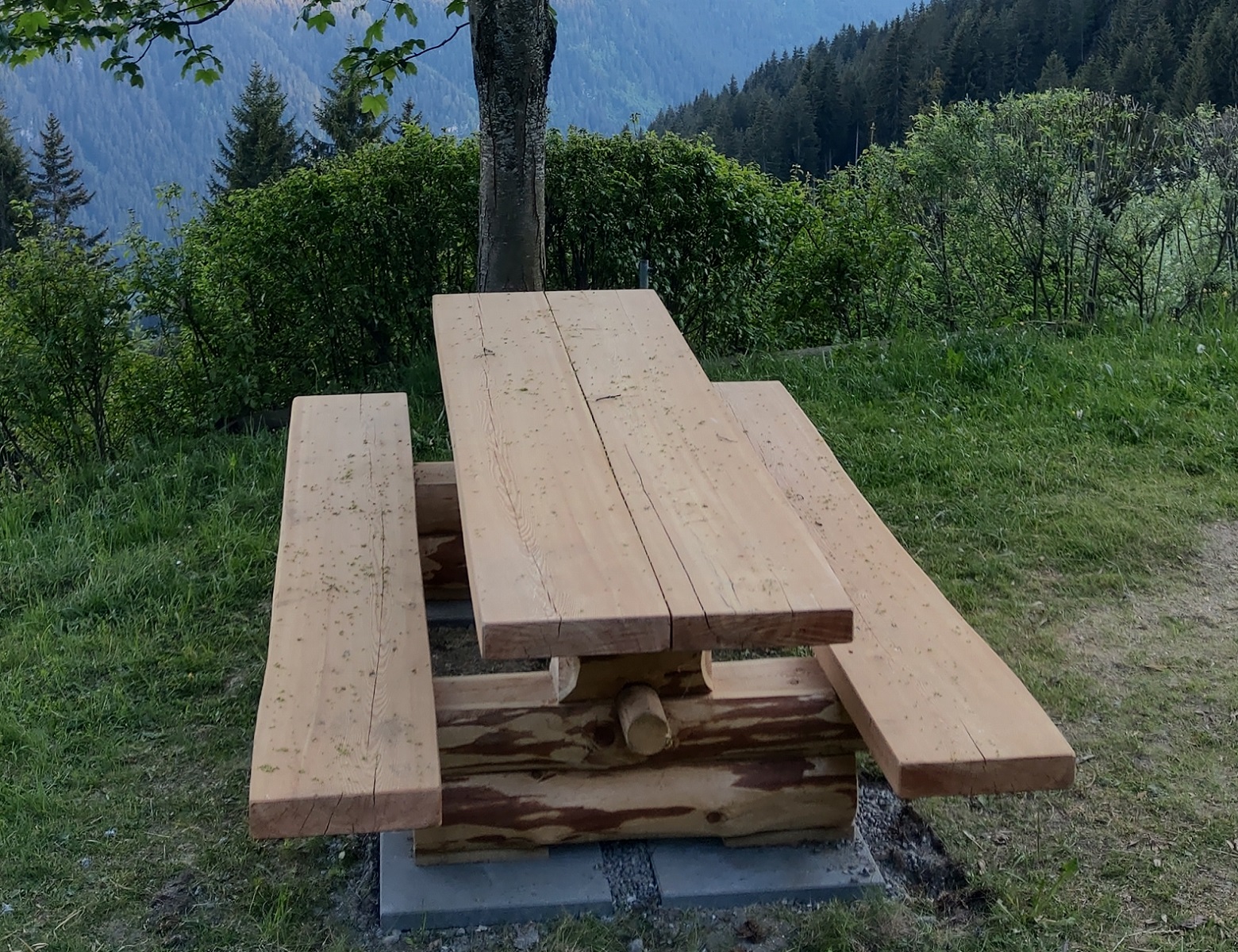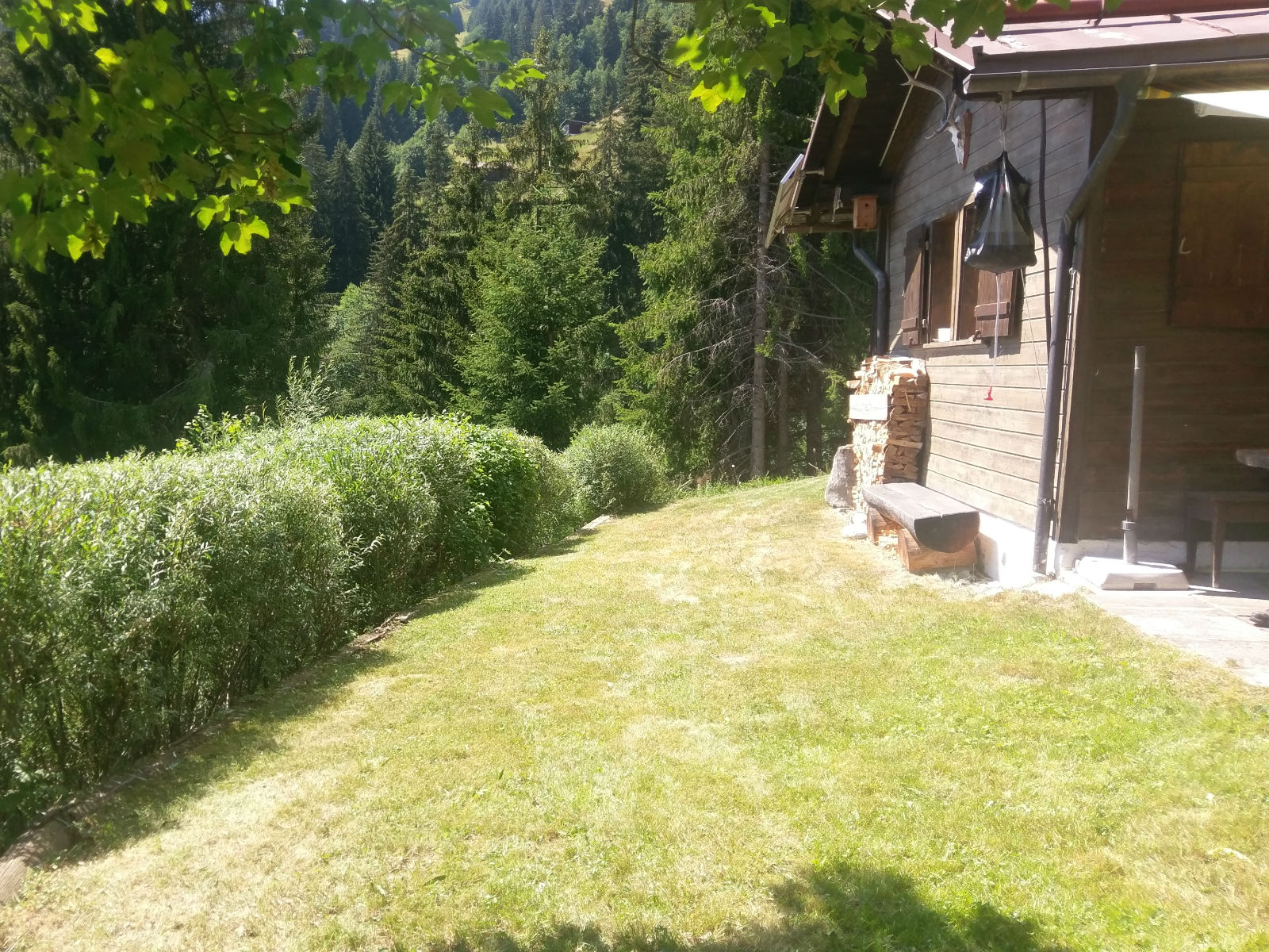 Draussen stehen verschiedene Liegestühle, Sitzmöglichkeiten, zwei grosse Tische mit Sitzbank, Sonnenstore, ein mobiler Sonnenschirm und ein Grill zur Verfügung. So können Sie die Ruhe, Sonne und Aussicht in vollen Zügen geniessen. Zur Abkühlung steht direkt vor dem Haus ein Holzbrunnen mit herrlichstem Bergquellwasser.