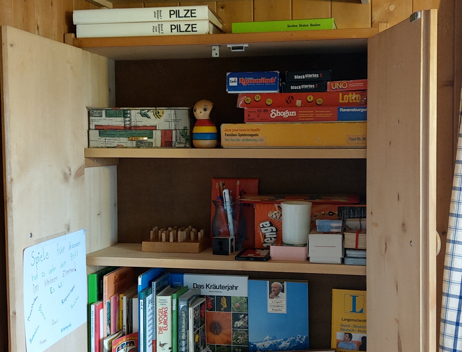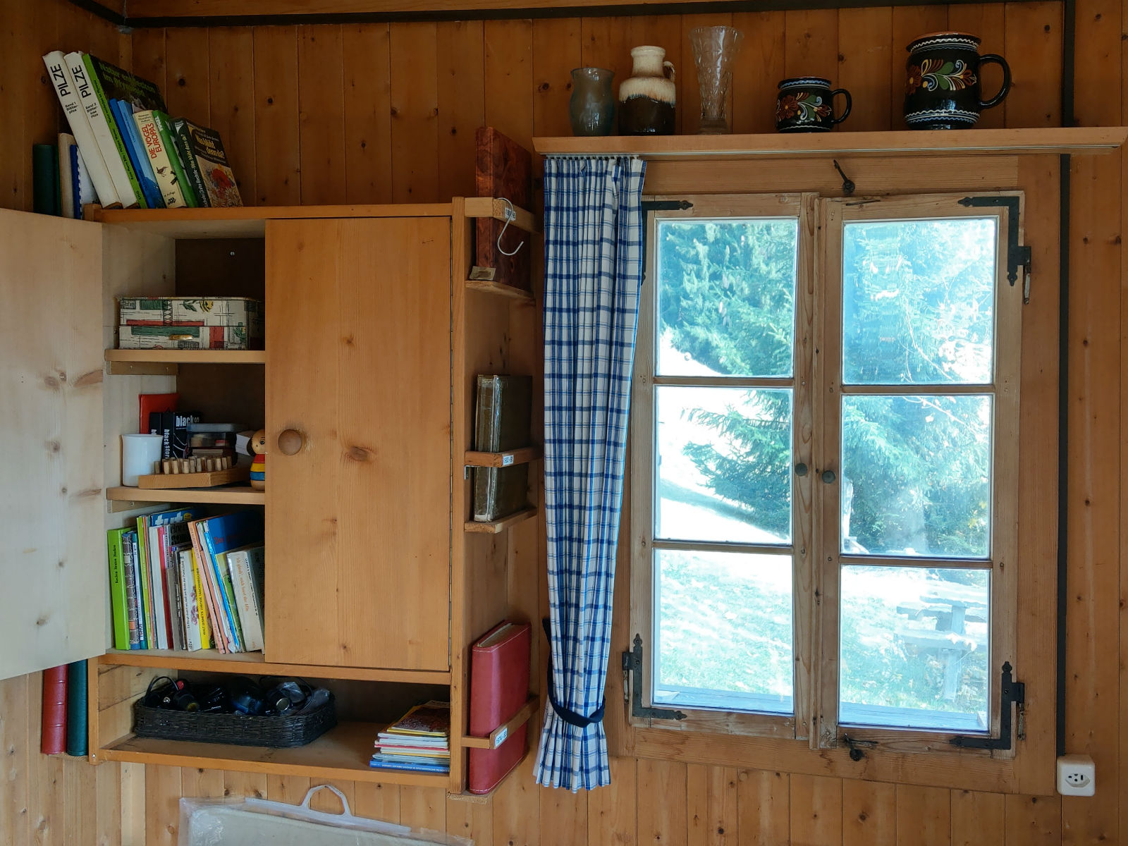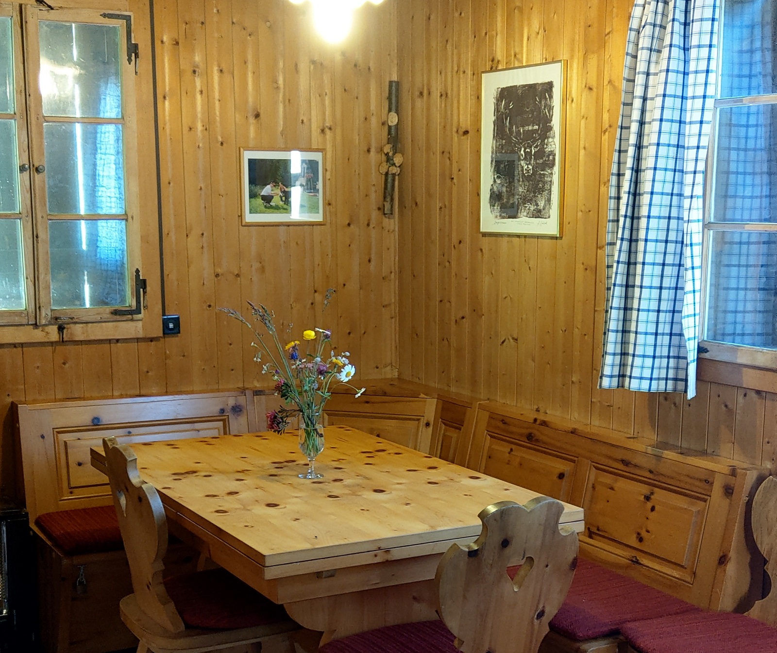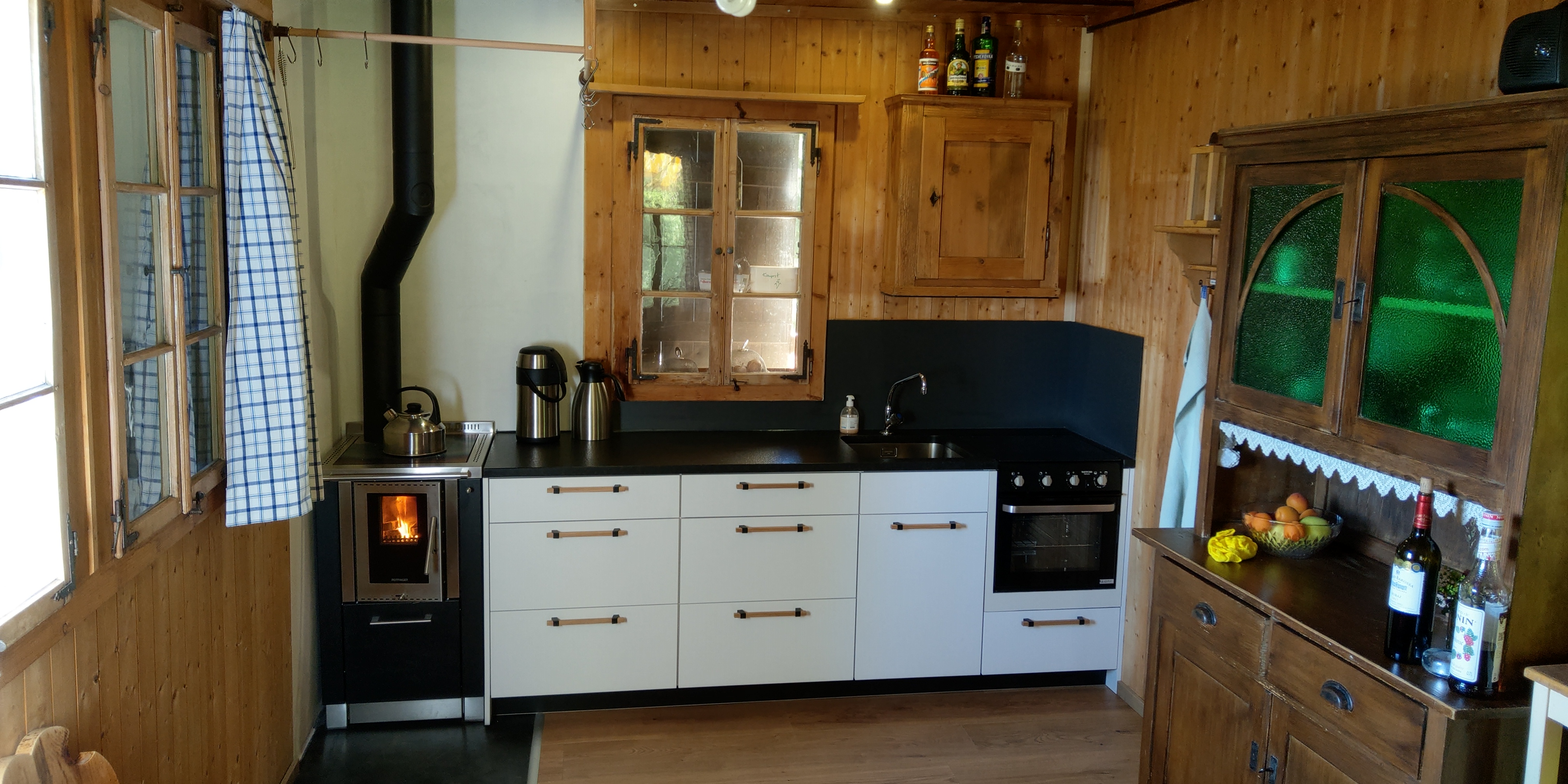 Gut eingerichtete Küche mit fliessendem kaltem Bergquellwasser, Gasherd, Backofen und Holzherd (Gas, Holz und Reinigungsmittel sind vorhanden und im Preis inbegriffen). Am ausziehbaren Tisch mit Eckbank und 3 Stühlen können bis zu 8 Personen gemütlich miteinander Zeit verbringen. Ein Naturkühlschrank, eine Edelstahlwanne, befindet sich im Boden des Wohnraums. Küchenwäsche vorhanden und im Preis inbegriffen. Es gibt verschiedene Bücher und Zeitschriften sowie Spiele für drinnen und draussen. Alles darf sorgfältig gelesen und gespielt werden. Badezimmer: