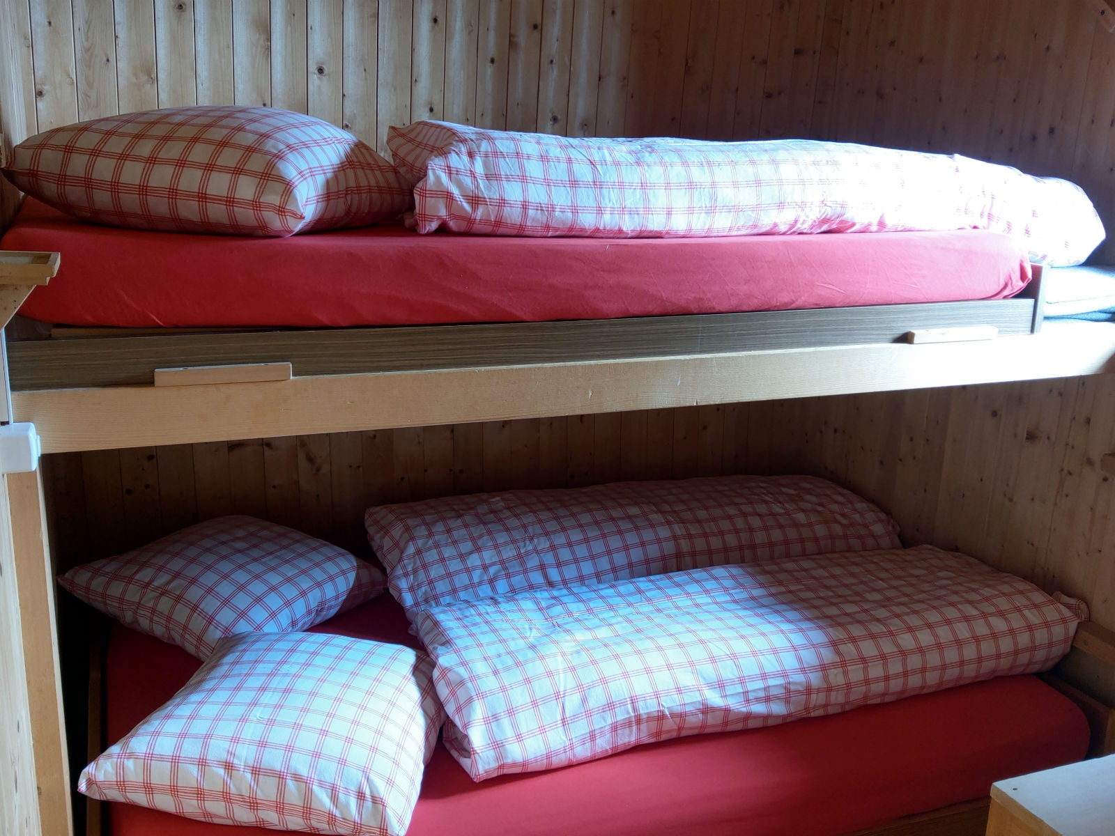 Zwei unbeheizte Schlafzimmer im hinteren Teil der Hütte mit je einem Doppel-Etagenbett (140 cm), Bettdecken und Kissen sind vorhanden. Bettwäsche vorhanden und im Preis inbegriffen. Es ist auch möglich den eigenen Schlafsack mitzunehmen, bitte bei der Buchung mitteilen. Küche / Wohnraum: