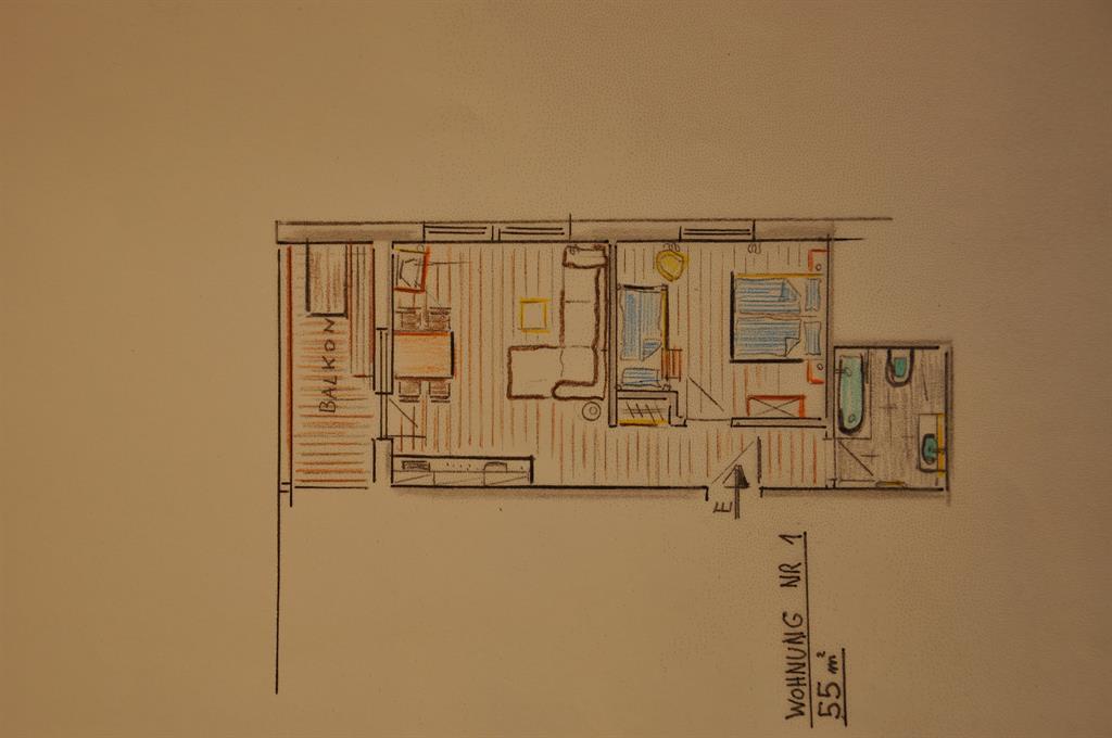 Das Appartement 1 in schlichtem Design und gemütlichen Ambiente hat 55 m² und ist für 2-4 Personen, es verfügt über einen großen Wohn - und Essraum mit Küche, ein getrennten Schlafzimmer, Bad und Balkon. Die großzügigen hellen Räume bestehen aus unbehandelten natürlichen Massivholz und schaffen ein gemütliches, gesundes wohnen.