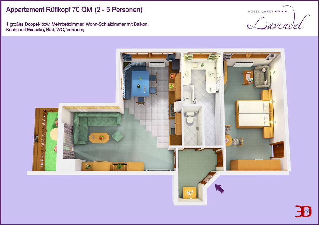 Gemütliche Ferienwohnung mit 70m² bestehend aus einem großen Schlafzimmer, ein Wohnschlafzimmer mit Balkon, einer Küche mit Essecke, Bad, WC, Telefon, Radio, TV, Wireless Internet und Safe. Frühstücksbuffet oder Brötchenservice ist möglich! Besuchen Sie unsere Hompage: www.lavendel.at