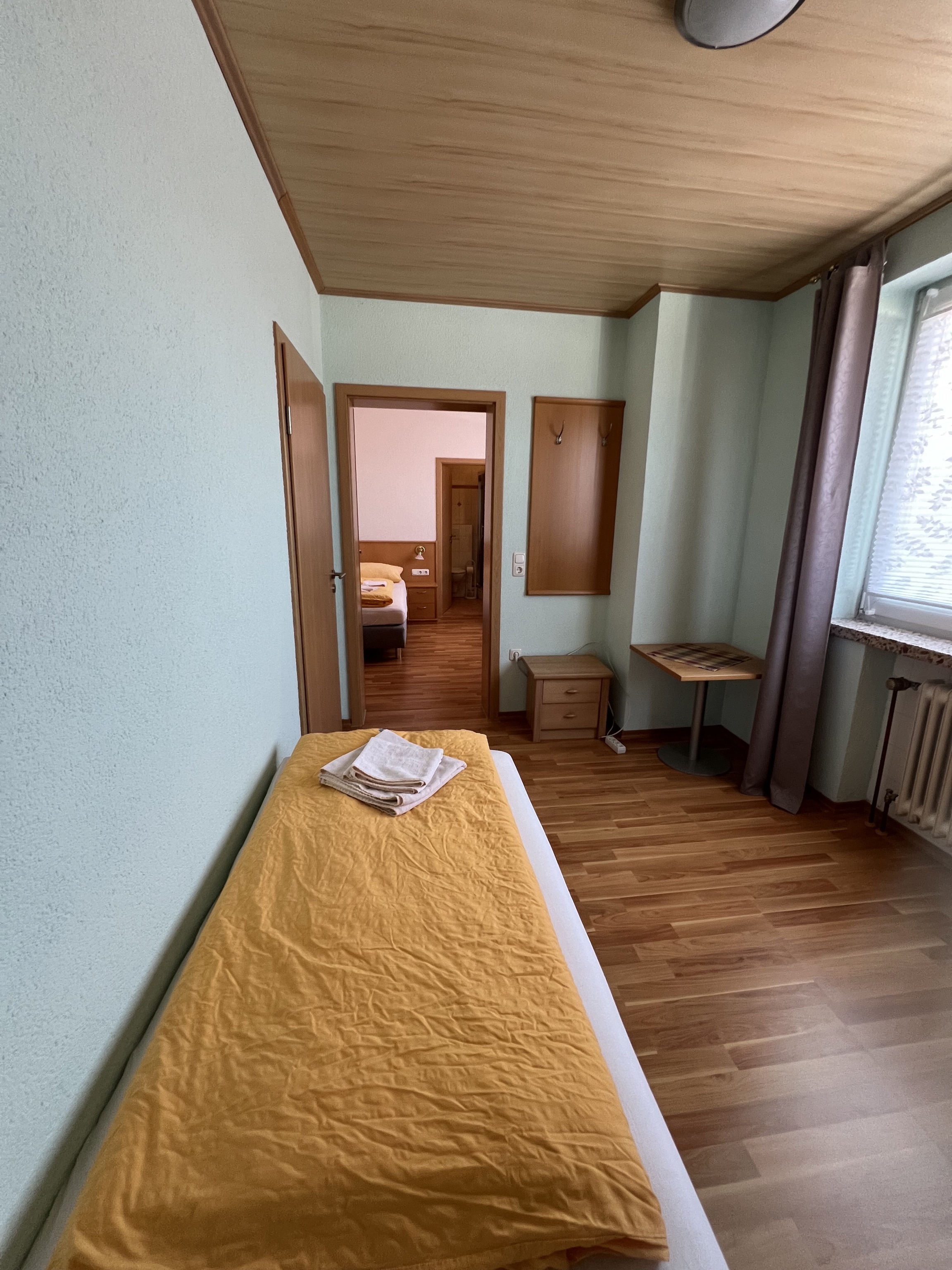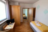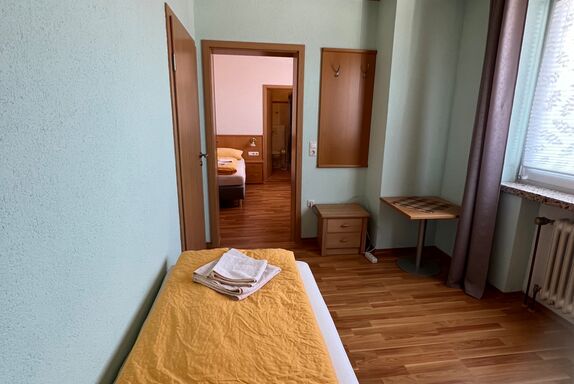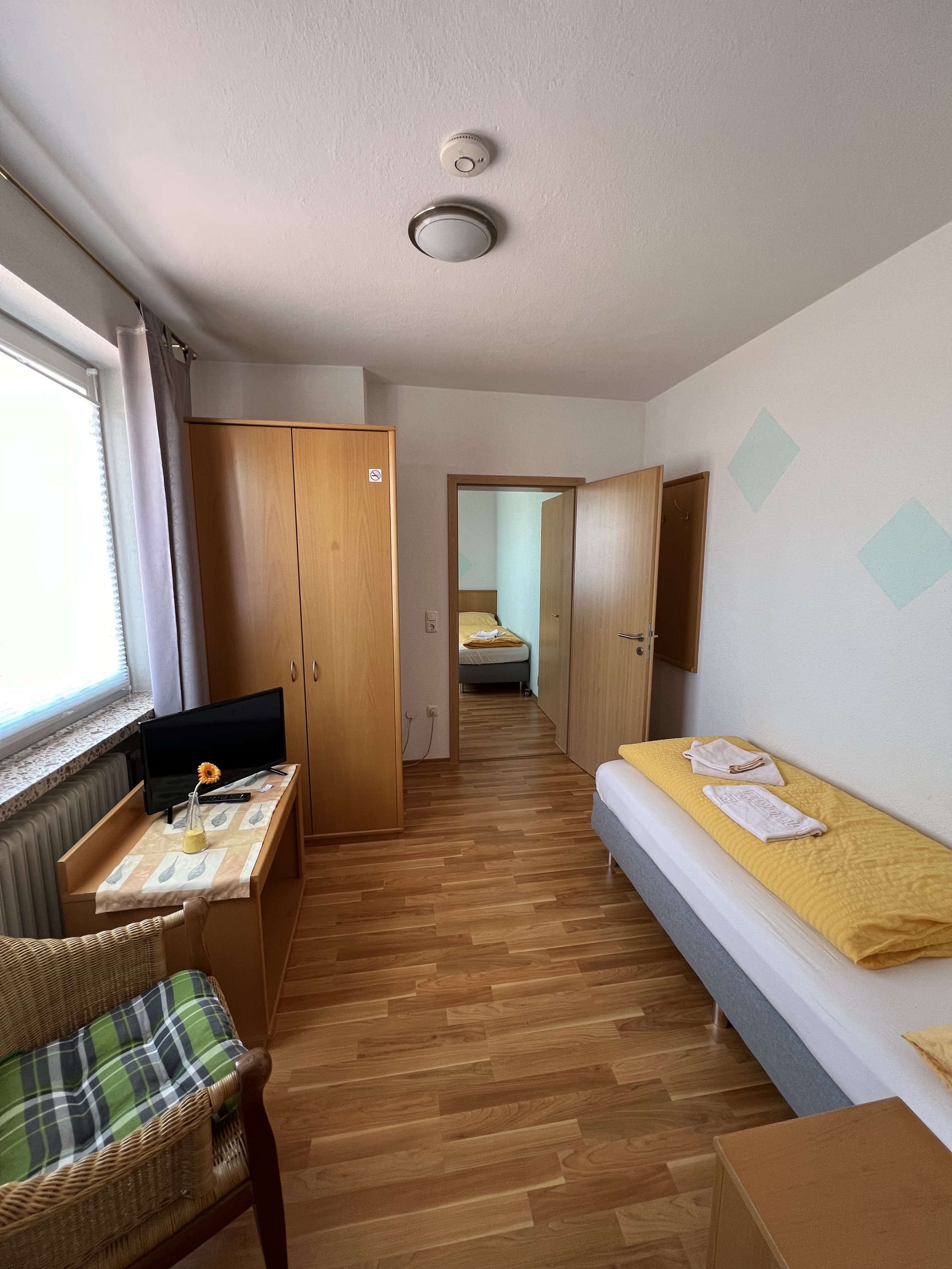 Das helle, freundliche Durchgangszimmer mit zusammen 18 qm verfügt über ein Schlafzimmer durch das ein weiteres Schlafzimmer erreichbar ist. Beide Zimmer verfügen über ein Einzel Boxspringbett und einen eigenen Flachbildfernseher sowie WLAN. Das Badezimmer befindet sich im Anschluss an eines der Zimmer und verfügt über Dusche und WC. Handtücher und Bettwäsche stehen zur Verfügung.