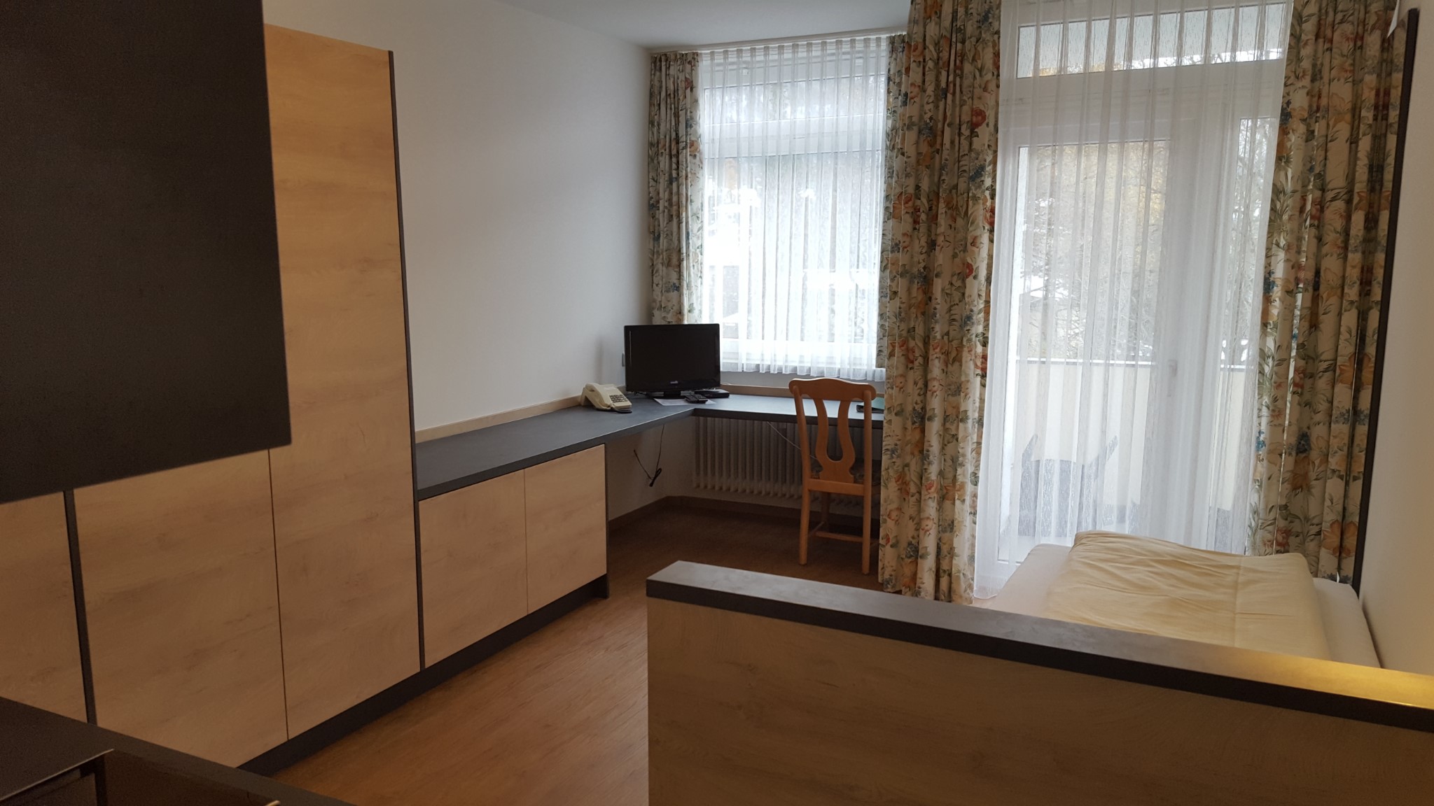 Das etwa 26 m² große 1-Zimmer-Apartment Junior 309 befindet sich im 3. Stock nach Südwesten zur Mozartstraße (mit Nachtfahrverbot) gelegen mit wunderschönem Blick auf den Predigtstuhl, das Lattengebirge sowie Staufen und Zwiesel. Die Wohnung wurde im Jahr 2024 komplett renoviert. Sie ist mit einem neuen PVC-Boden in Eichenoptik, Einzelbett (100 x 200 cm), einem großen Eckschreibtisch mit Flachbild-TV, einem großen Einbauschrank und Kommode, Stuhl sowie einem großen Spiegel ausgestattet. Steckdosen sind in großer Zahl und gut erreichbar in Bettnähe und beim Schreibtisch vorhanden. Die Wohnung hat einen kleinen überdachten Balkon. Die Einbauküche fügt sich perfekt in das Ensemble der restlichen Einbaumöbel ein. Sie ist mit einem 2-fach Induktionskochfeld, Backofen, großen Kühlschrank mit Gefrierfach, Wasserkocher, Kaffeemaschine sowie einer Grundausstattung an Töpfen, Geschirr, Besteck etc. ausgestattet. Das Bad ist komplett neu und verfügt über eine bodenebene Walk-in-Dusche mit Glaswand, WC, Waschbecken mit beleuchtetem Spiegel und großem Handtuchheizkörper. Ein Haartrockner ist vorhanden. Das Apartment 309 kann auf Anfrage mit dem benachbarten Einzelzimmer (310) zu einer ca. 52 m² großen Wohnung mit 2 Bädern verbunden werden.