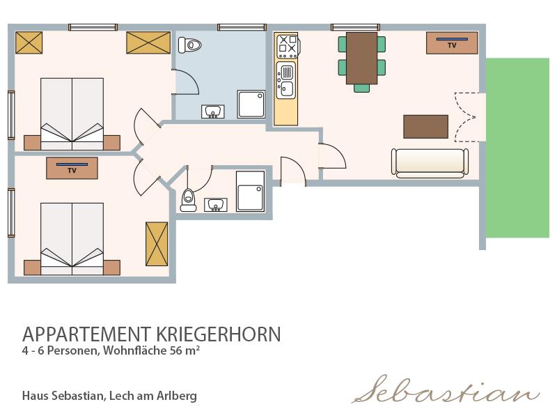 Die Ferienwohnung KRIEGERHORN für 4-5 Personen ist nach dem Berg Kriegerhorn mit seinen bekannten Skiabfahrten benannt. 2 Schlafzimmer, 1 Wohn-/Schlafzimmer mit Ausziehcouch, 1 Küchenzeile mit Esstisch, Vorraum, 2 Badezimmer ( 1 x mit Dampfdusche, 1 x mit Dusche), Waschbecken, Fön, kl. Balkon. Sitzecke, Kabel-TV, Radio,Safe wireless-Internet und Grander Wasser.