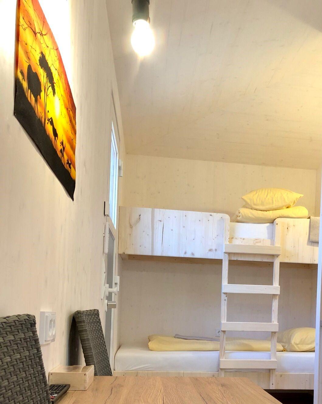 Das Baumhaus Afrika 2.2 ist für 2 bis 3 Personen ausgelegt, hat einen Zugang mit Lift und Stiegenaufgang und befindet sich direkt neben dem Dino-Rastaurant. Dieses Zimmer ist mit WC, Dusche, Waschbecken, TV, einer Sitzecke sowie einem Stockbett welches unten 120cm (theoretisch für 2 Personen) und oben 90cm breit ist, ausgestattet.