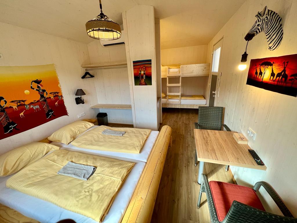 Unsere ebenerdigen Holuiday-Appartements (Cubes) befindet sich direkt neben unserer hauseigenen Poolanlage mit Salzwasserpool und Wasserrutsche. Diese Zimmer sind mit 2 getrennten Schlafzimmern (1x Doppelbett + 1x Stockbett) sowie einer Küche mit Essecke als auch einem Badezimmer mit WC, Dusche und Waschbecken sowie einer Außenterrasse ausgestattet.