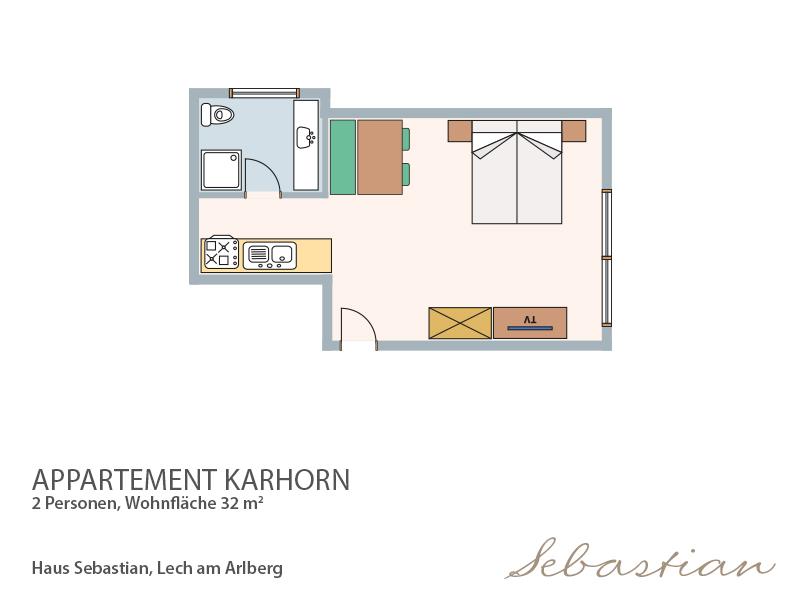 Die Ferienwohnung KARHORN für 2 Personen ist nach dem Berg Karhorn benannt. 1 Wohn-/Schlafzimmer mit Doppelbett, Küchenzeile, Essecke, Badezimmer mit Dusche, Waschbecken, Fön, Safe, Kabel-TV, Radio, wireless Internet und Grander Wasser. Die Wohnung Karhorn kann auch in Verbindung mit den größeren Wohnungen Omeshorn bzw. Kriegerhorn gebucht werden.