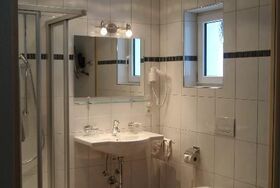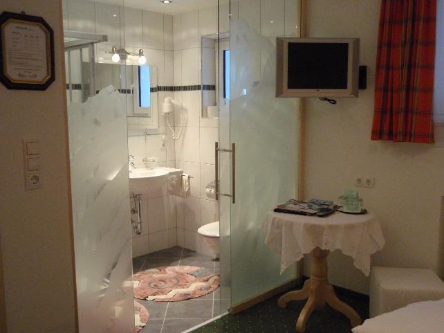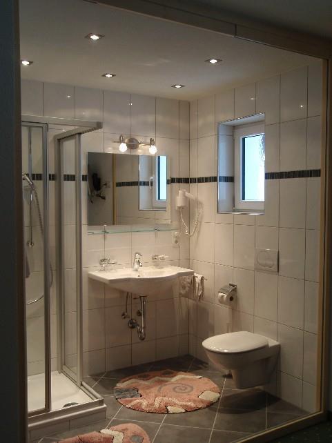 Badezimmer mit Dusche, Waschbecken, Haarfön, WC. Kabel-TV, Safe, Telefon, Kühlschrank und Radiowecker (im Zi. Nr. 6).Beide Zimmer in Ahornmöbeln.