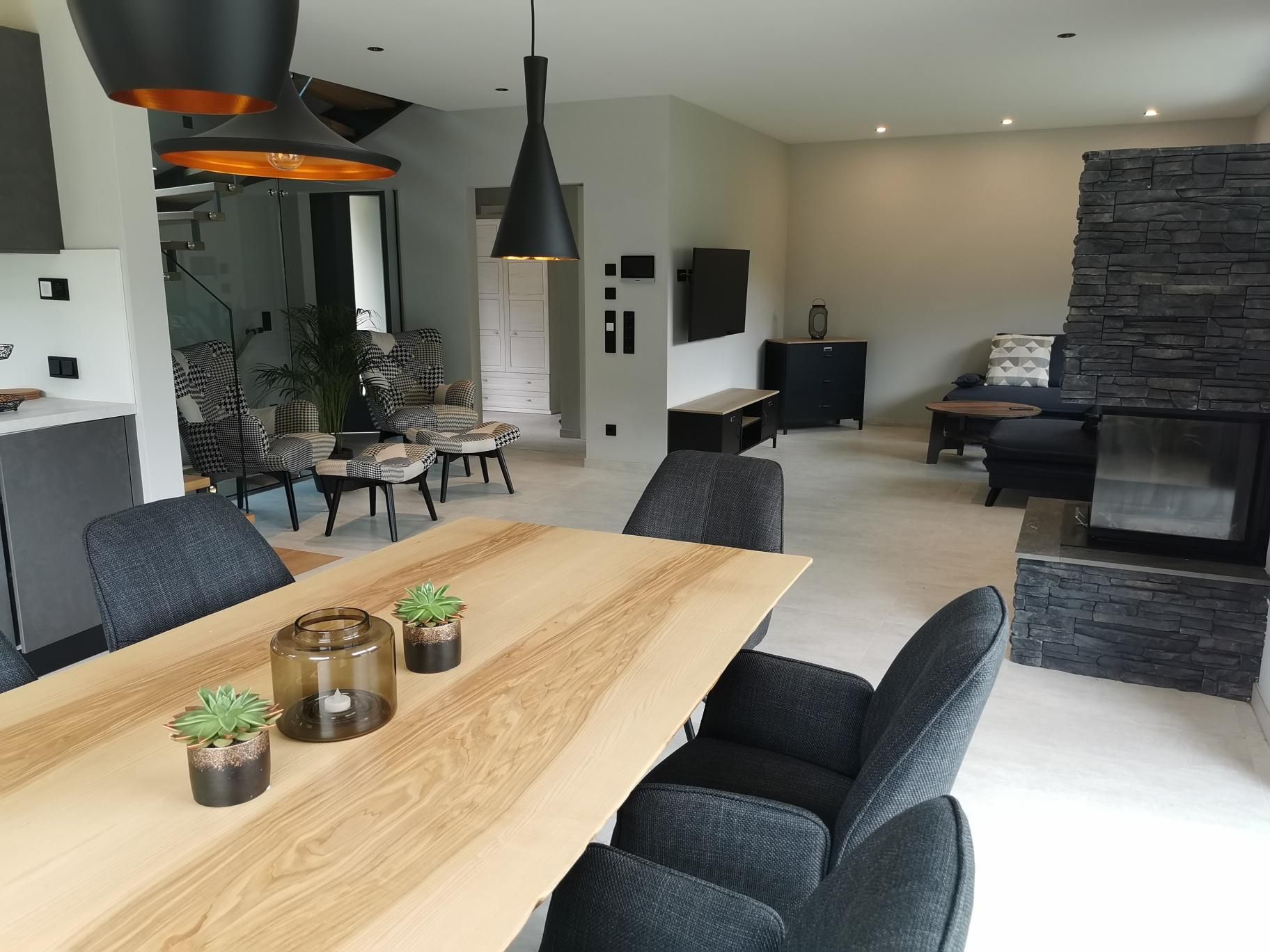 Ferienhaus bis zu 9 Personen, Küche, Esstisch, großer Wohn-Schlafraum mit offenen Kamin, Couch, drei Schlafräume, drei Bäder, ein WC extra, Gardarobe, Grosse Terrasse Sonnenliegen Grillplatz, und eigener Garten mit Spielplatz.