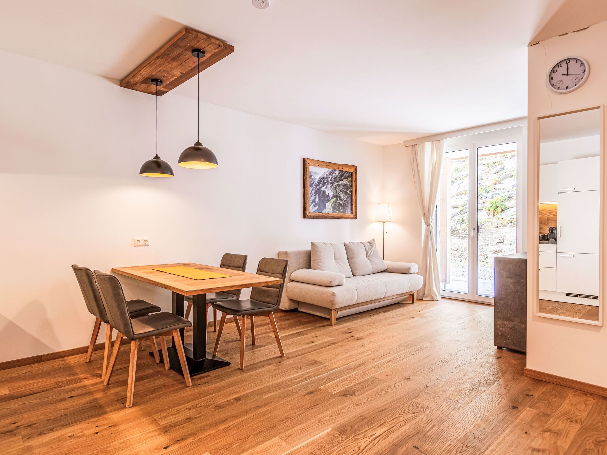 für 2 Erwachsene und 2 Kinder, 2-Zimmer-Wohnung 44 m2. Objekt geeignet für 2 Erwachsene + 2 Kinder. Hell, komfortabel und geschmackvoll eingerichtet: Wohn-/Schlafzimmer mit 1 Doppeldiwanbett, Esstisch und Sat-TV (Flachbildschirm). 1 Doppelzimmer. Offene Küche (Backofen, Geschirrspüler, 4 Glaskeramikplatten, Toaster, Wasserkocher, Mikrowelle, elektrische Kaffeemaschine). Dusche/WC. Terrasse. Terrassenmöbel. Schöne Sicht auf die Berge und die Landschaft. Zur Verfügung: Haartrockner. Internet (Wireless LAN, gratis). Bitte beachten: Nichtraucher-Unterkunft.
