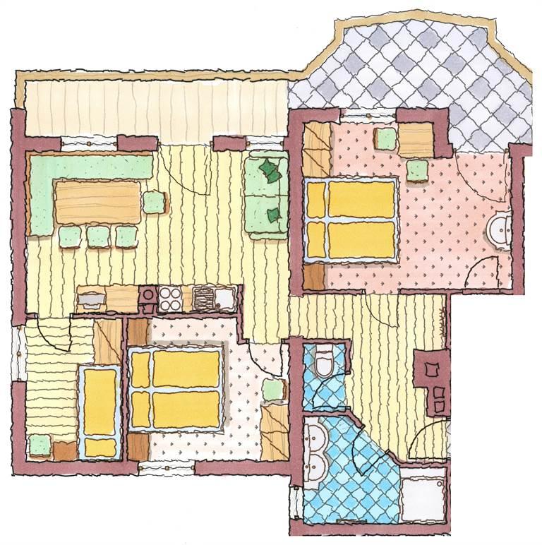 Variante A für max. 6 Personen (75 m²) - 3 Schlafzimmer & 1 Badezimmer: 1 großer Wohnraum mit Küchenwand inkl. Geschirrspüler und Sitzecke, 3 Schlafzimmer (2 x mit Doppelbett, 1 x mit Stockbett), 1 großes Badezimmer mit Dusche und Doppelwaschbecken, dem WC extra, Vorraum und großer, sonniger Balkon.