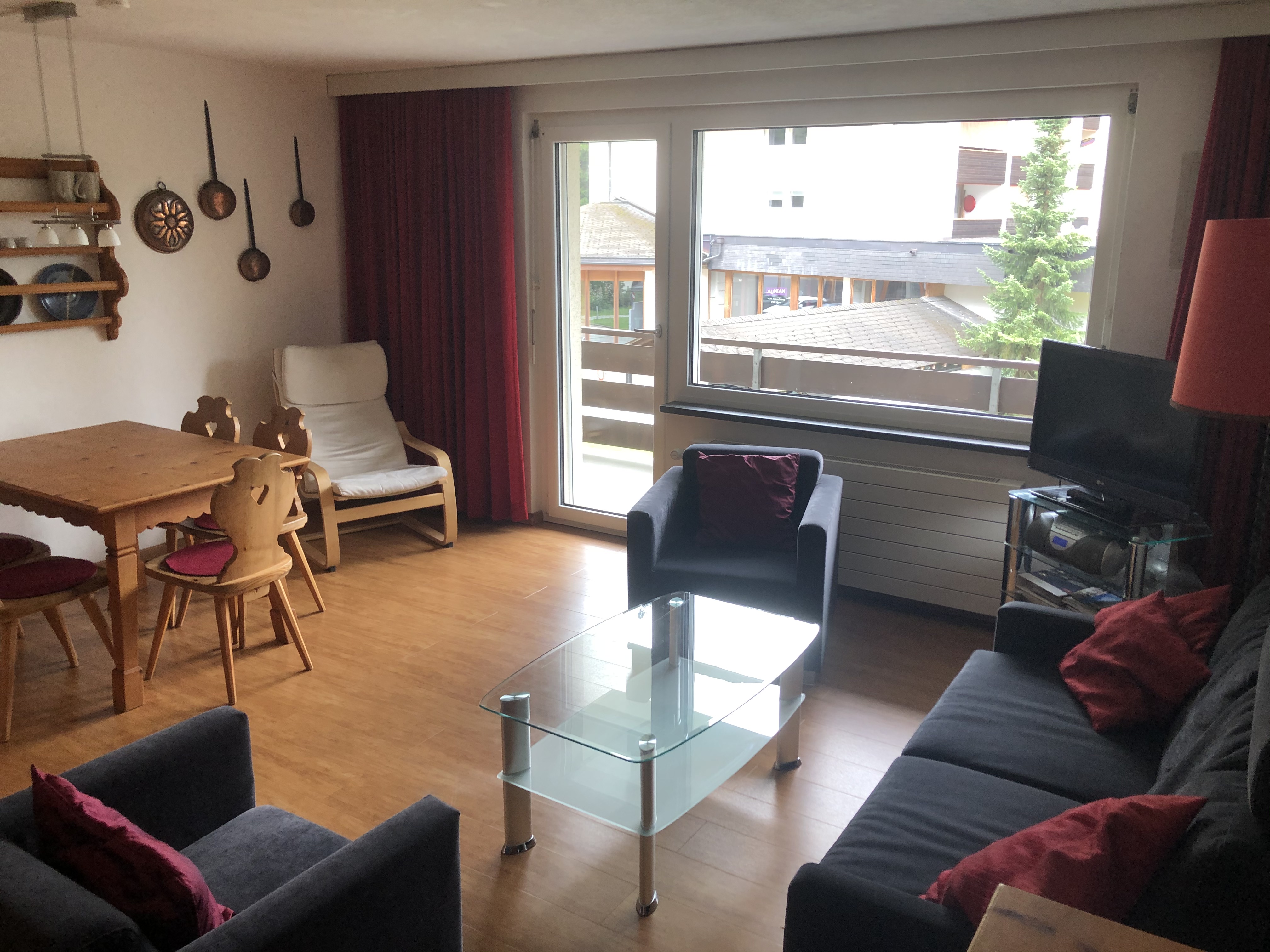 Die Wohnung hat ein Wohnzimmer mit 2 Schrankbetten, sowie ein Schlafzimmer mit einem Bett und ein Schlafzimmer mit zwei Einzelbetten und einer extra Waschgelegenheit. Esstisch und Sitzgruppe, TV, Radio/CD. Neue Küche mit Backofen, Filterkaffeemaschine, Racletteofen, Glaskeramikherd und Geschirrspüler, gut ausgerüstet. Bad/WC. Nichtraucherwohnung.