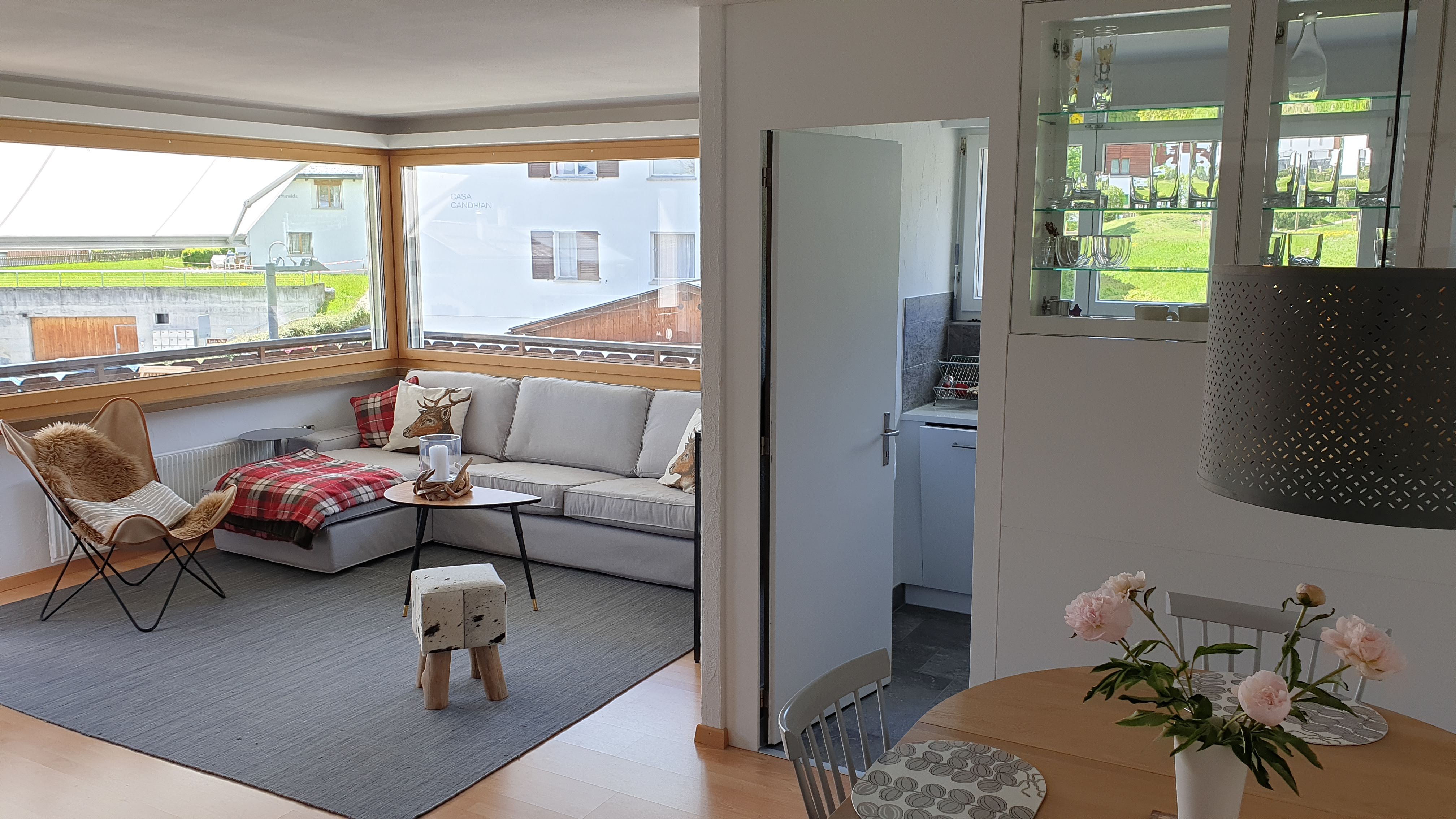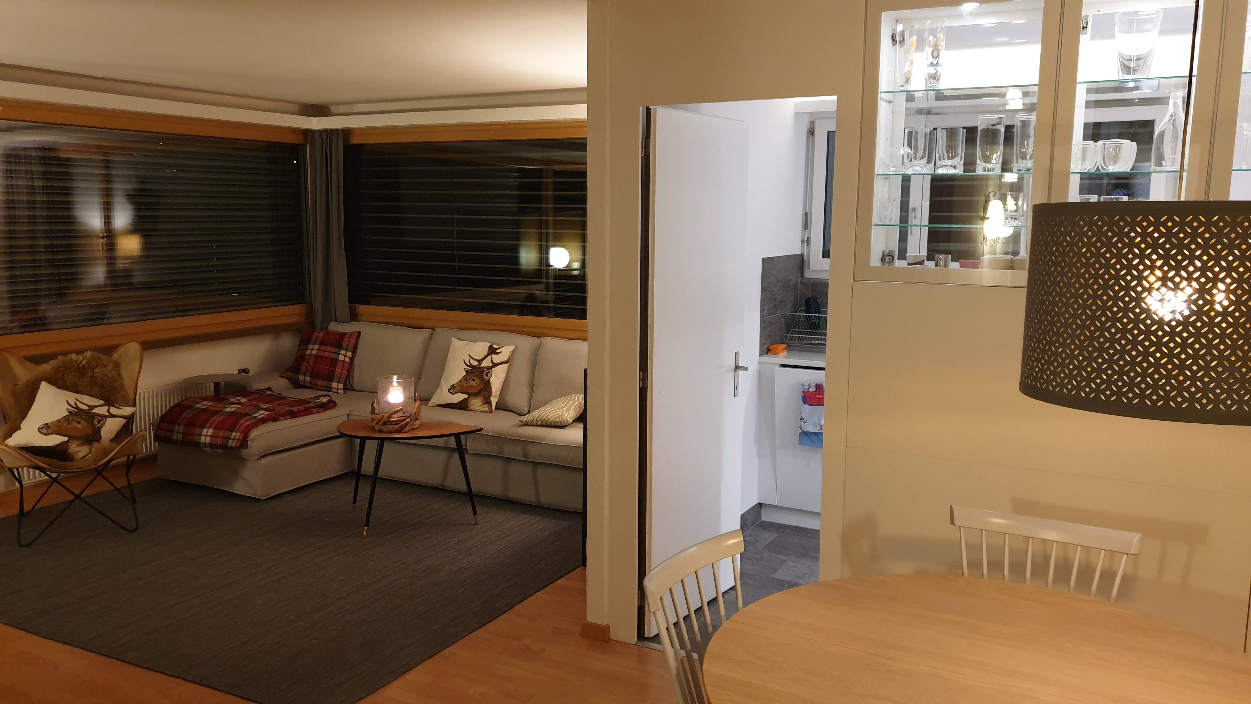 Die zentral gelegene, stilvoll eingerichtete 4.5 Zimmer-Wohnung ist nur 5 Gehminuten von den Bergbahnen und dem Einkauscenter Stenna in Flims entfernt. Die helle Wohnung bietet auf 92m2 Platz für maximal 8 Gäste. Sie verfügt über ein geräumiges Wohnzimmer mit Cheminée und Balkon, zwei Schlafzimmer mit Doppelbetten und Ensuite-Bad und einem Kinderschlafzimmer mit 2 Etagenbetten. In den zwei Ensuite-Bäder befindet sich jeweils ein Waschbecken und eine Dusche, im Familienbad ist eine Badewanne, ein Waschbecken und eine Toilette vorzufinden. Zudem gibt es noch eine separate Gäste-Toilette mit Waschbecken. Die Küche ist mit einem Glaskeramikherd, Backofen, Kühlschrank, Spülmaschine und vielen weiteren Küchenutensilien ausgestattet.
