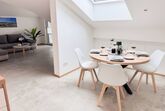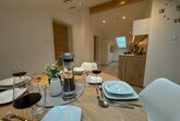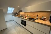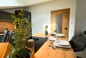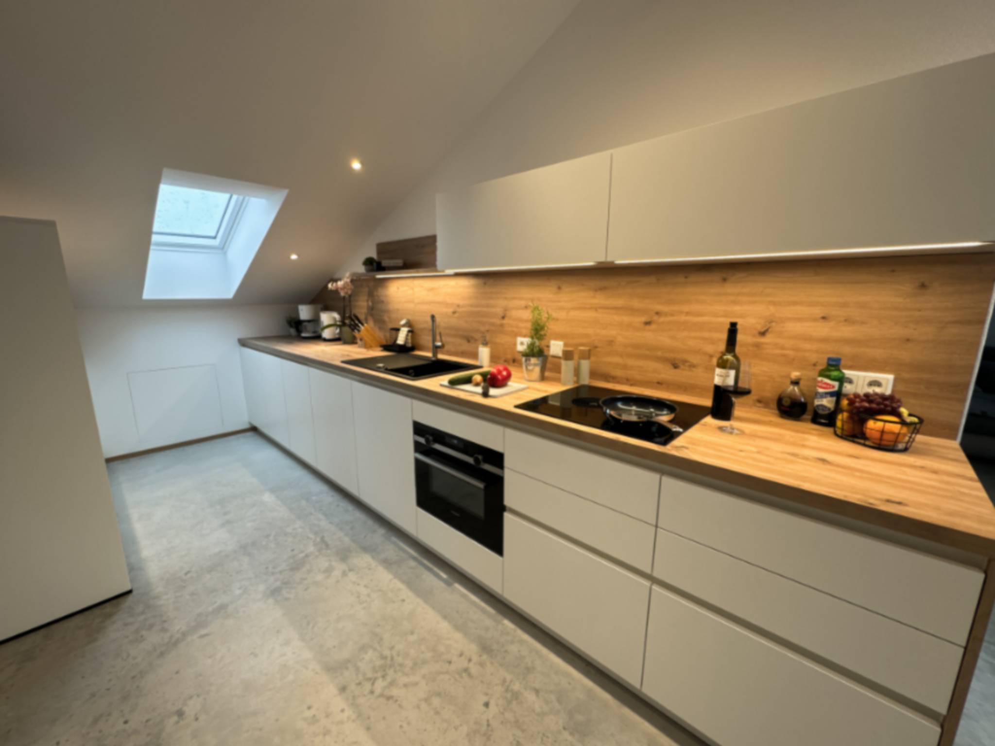 Küche mit Spülmaschine, Mikrowelle, Kaffeemaschine, Toaster, Wasserkocher, Bora Induktionsherd, Geschirr, Besteck, Kochgeschirr, Kühlschrank mit Gefrierfach
