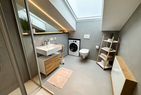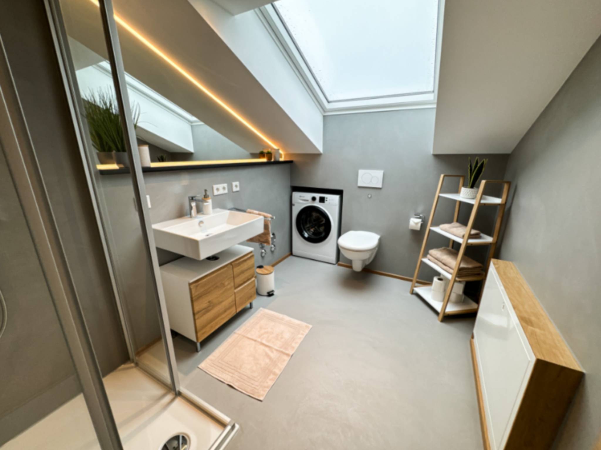 Modernes Badezimmer: Unser Badezimmer verfügt über eine Dusche, Waschbecken und WC sowie alle notwendigen Annehmlichkeiten für Ihren Komfort.