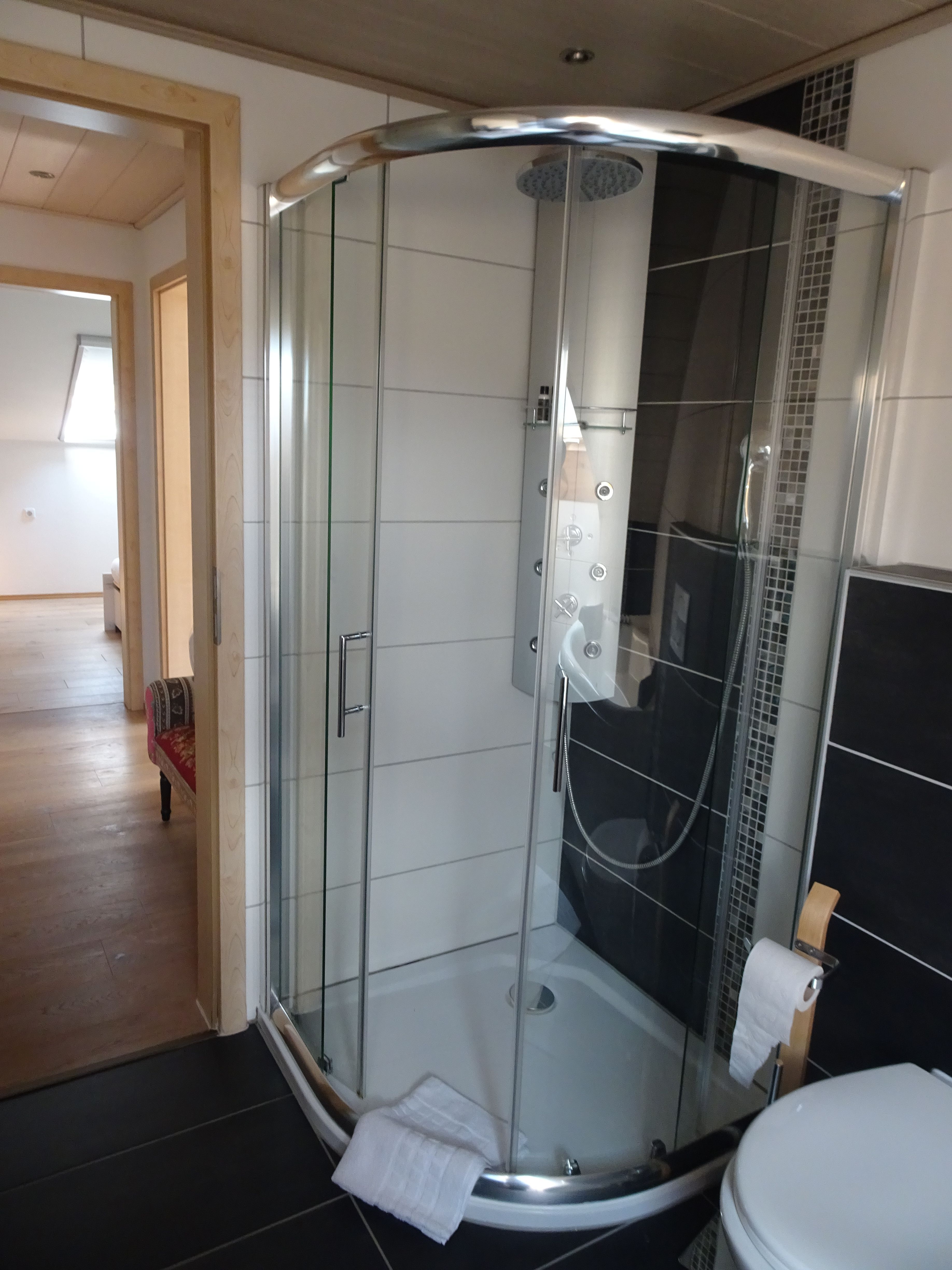 Das moderne Bad ist eine Wellnessoase mit Badewannenwhirlpool und Regendusche. Handtücher und Fön sind vorhanden.