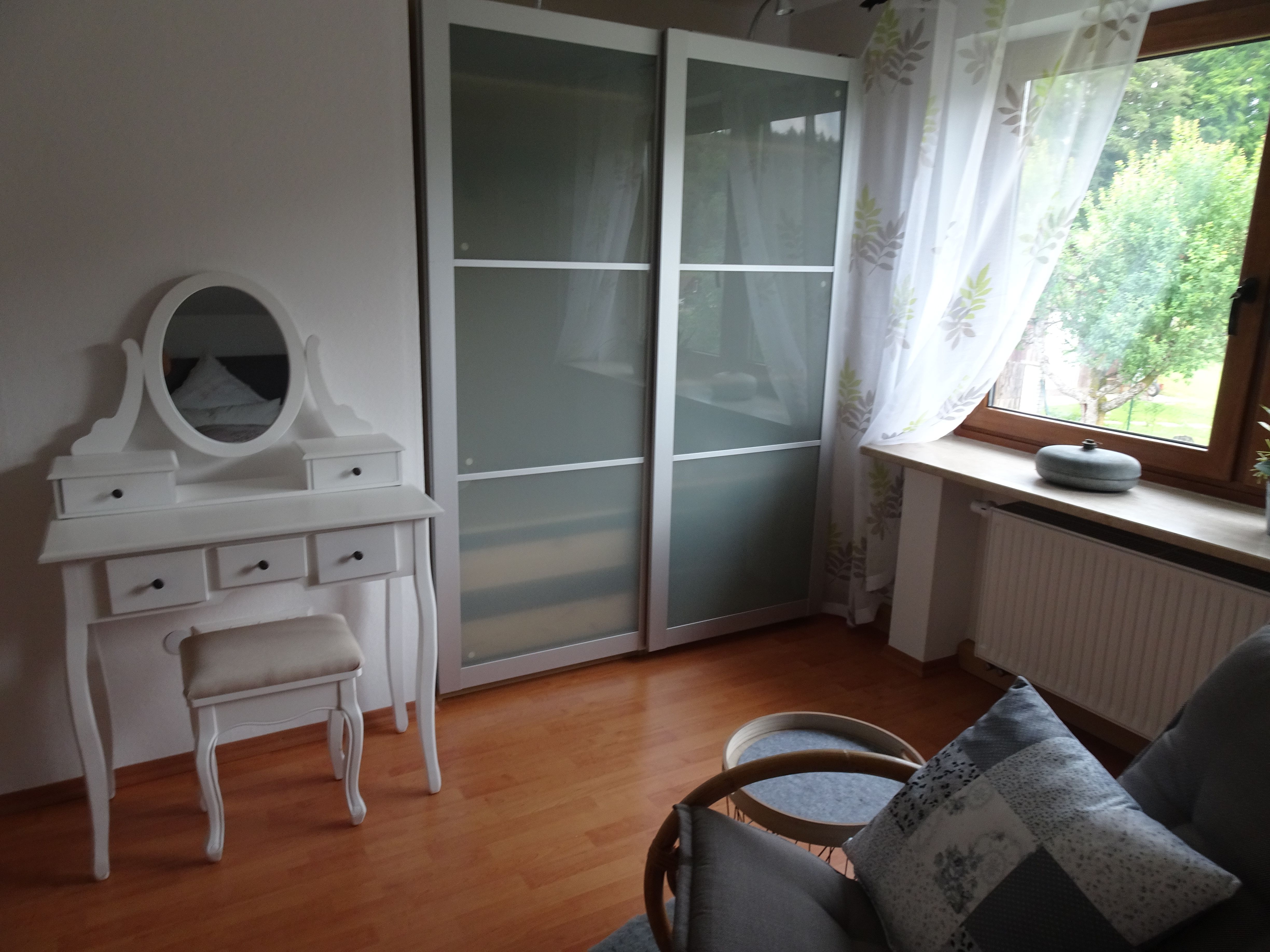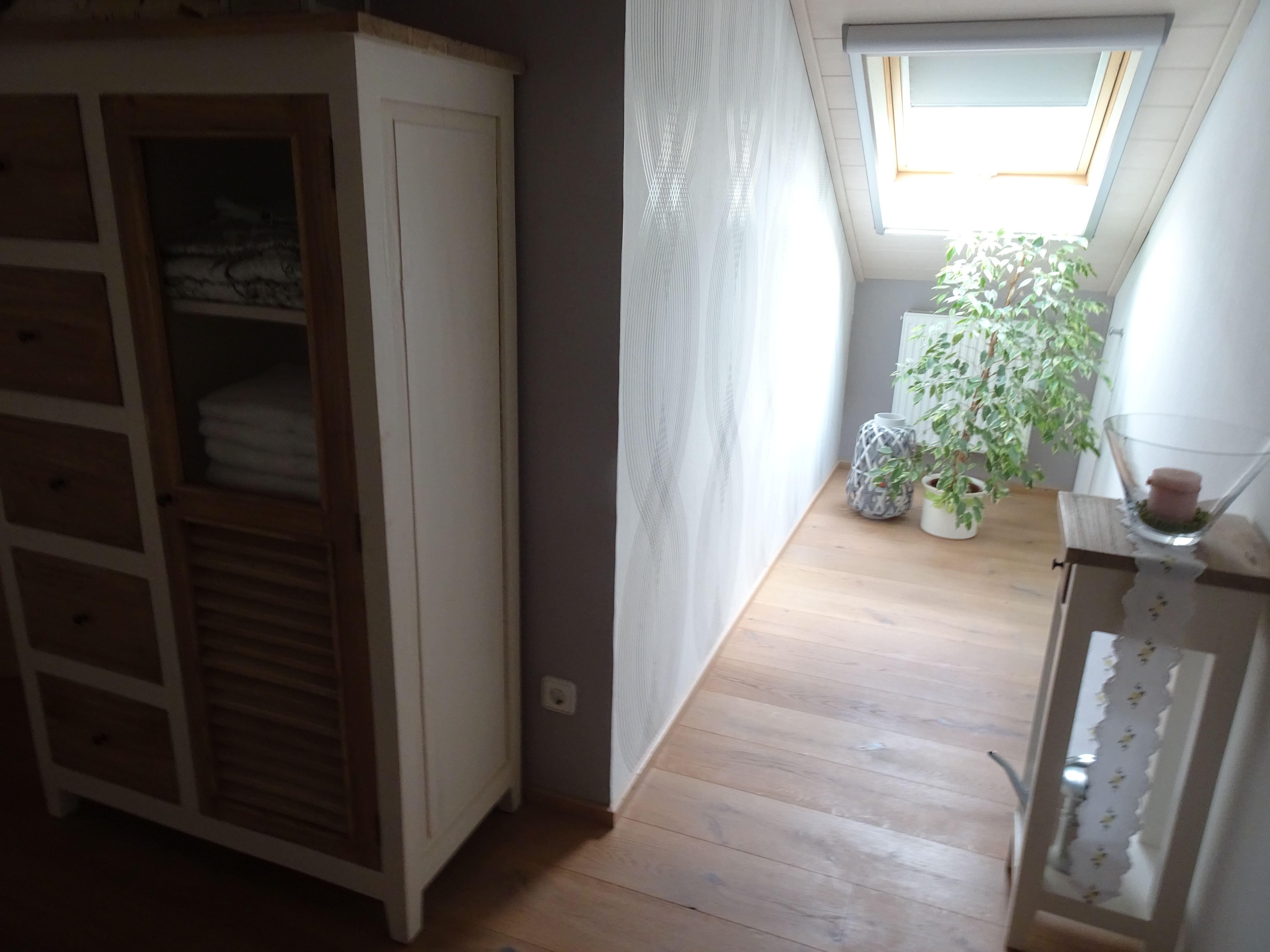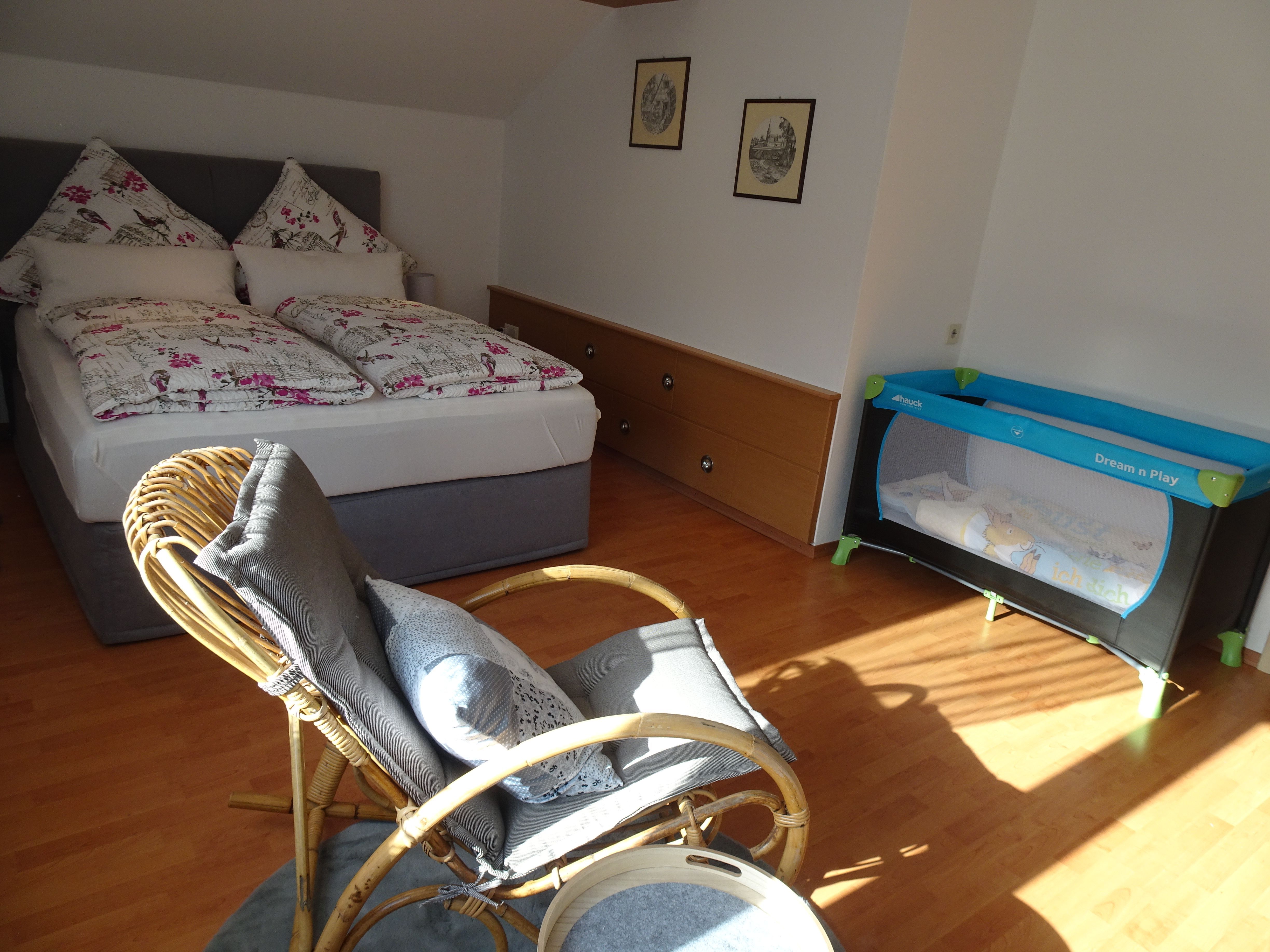 Im großzügig geschnittenen Schlafzimmer 1 finden Sie ein komfortables Boxspringbett, einen großen Kleiderschrank, eine Leseecke mit Schaukelstuhl, sowie ein nettes Frisiertischchen zum Schickmachen. Auf Wunsch kann ein Kinderreisebettchen (für Kinder bis 15kg geeignet) dazugestellt werden. Auch Hundekörbe aus Kunstleder können ausgeliehen werden.