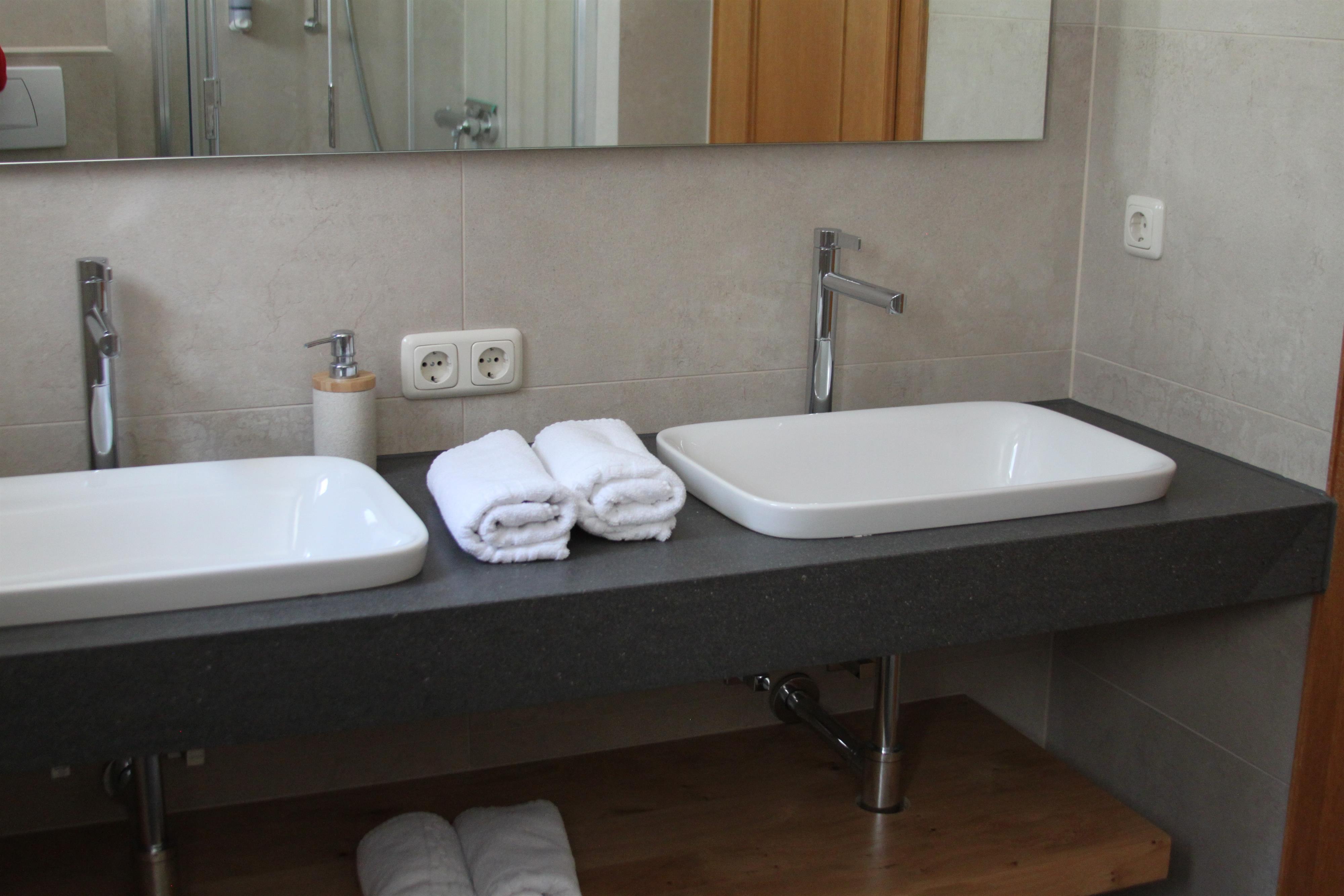 Die Ferienwohnung (ca. 59m²) ist in zwei Schlafzimmern, eines davon mit Zusatzbett und Waschbecken, Wohnküche mit gemütlicher Essecke und Bettsofa, Dusche/WC, extra W/C eingeteilt und hat Zugang zum Balkon. Die Ferienwohnung ist ausgestattet mit Bettwäsche, Handtücher, Föhn, Telefon, Kabel TV mit Radio,Safe, gratis W-Lan und auf Wunsch gibt es täglich Brötchenservice. Nichtraucher Ferienwohnung. Die Küche ist komplett eingerichtet mit Herdplatte ohne Backrohr Mikrowelle Kühlschrank Geschirrspüler mit Tabs Töpfe und Geschirr Geschirrtücher und Spülmittel Kaffeemaschine inklusive Filter