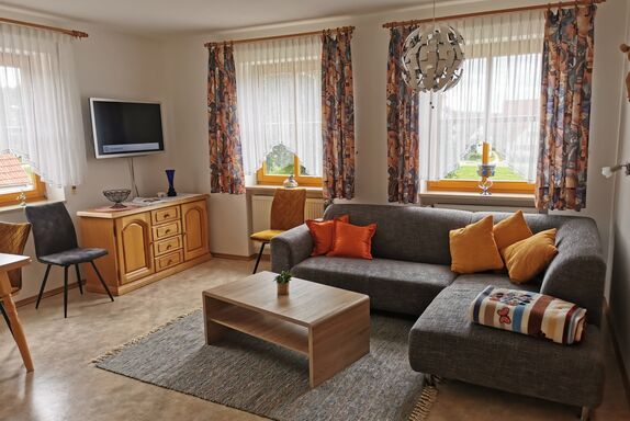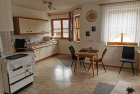 Unsere großzügige Ferienwohnung im ländlichen Stil mit 80 m² Wohnfläche befindet sich im 1. Obergeschoss und bietet Platz für 1-5 Personen. Die komplett ausgestattete Wohnküche mit Herd, Backofen, Kühl-/ Gefrierkombination, Wasserkocher, Mikrowelle, Toaster sowie einer Kaffeemaschine lässt keine Wünsche offen. Im Wohn- und Essbereich befinden sich eine Essgruppe mit Blick ins Grüne und eine gemütliche Couch mit TV. Über eine große Flügeltür gelangen Sie in das Schlafzimmer mit Doppelbett. Es sind zwei weitere Schlafzimmer mit 3 Einzelbetten vorhanden. Es steht ein Badezimmer mit Dusche/Badewanne und ein separates WC zur Verfügung. Vor allem im Sommer können Sie entspannte Abende auf der großen Terrasse ausklingen lassen.