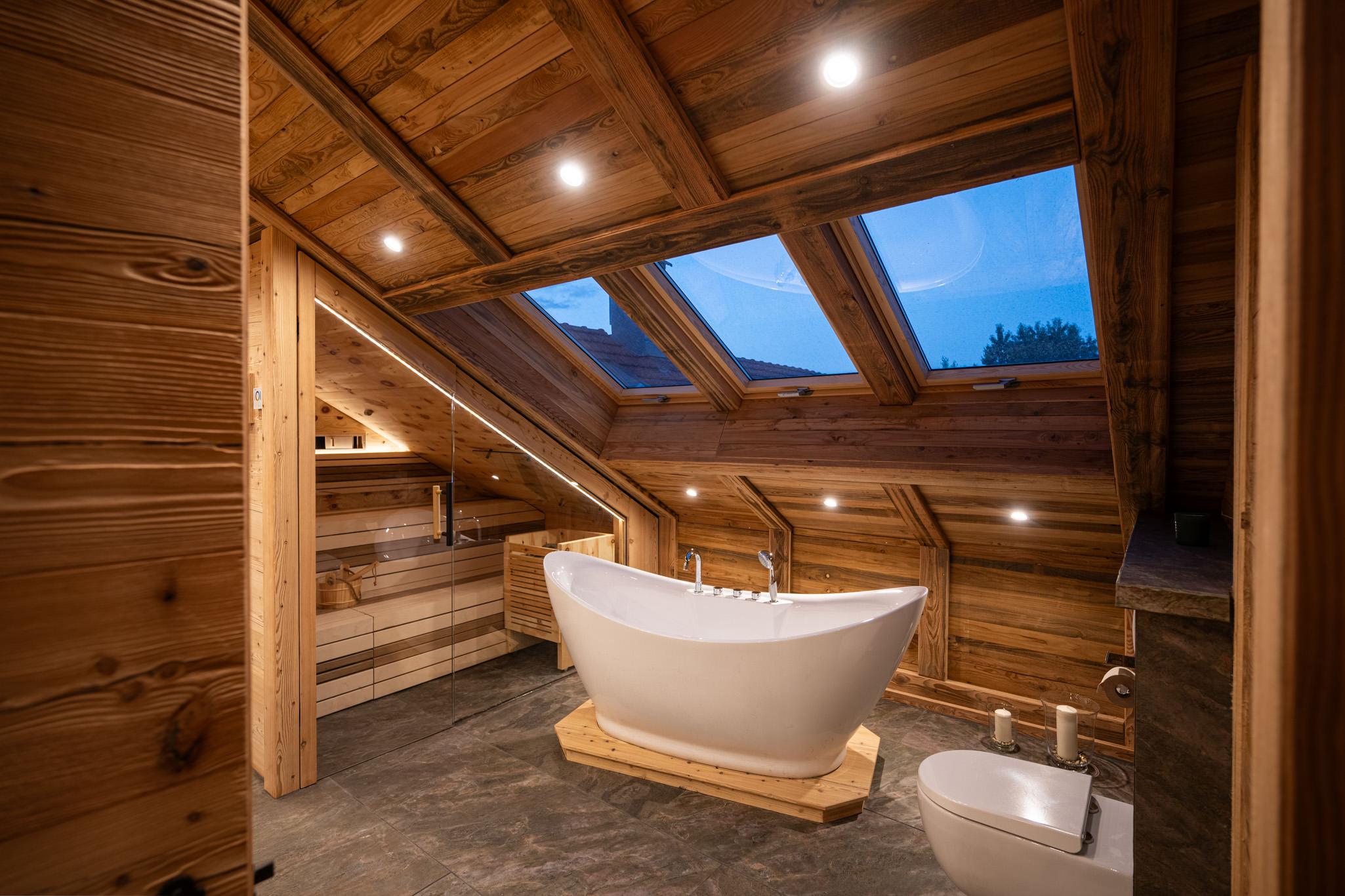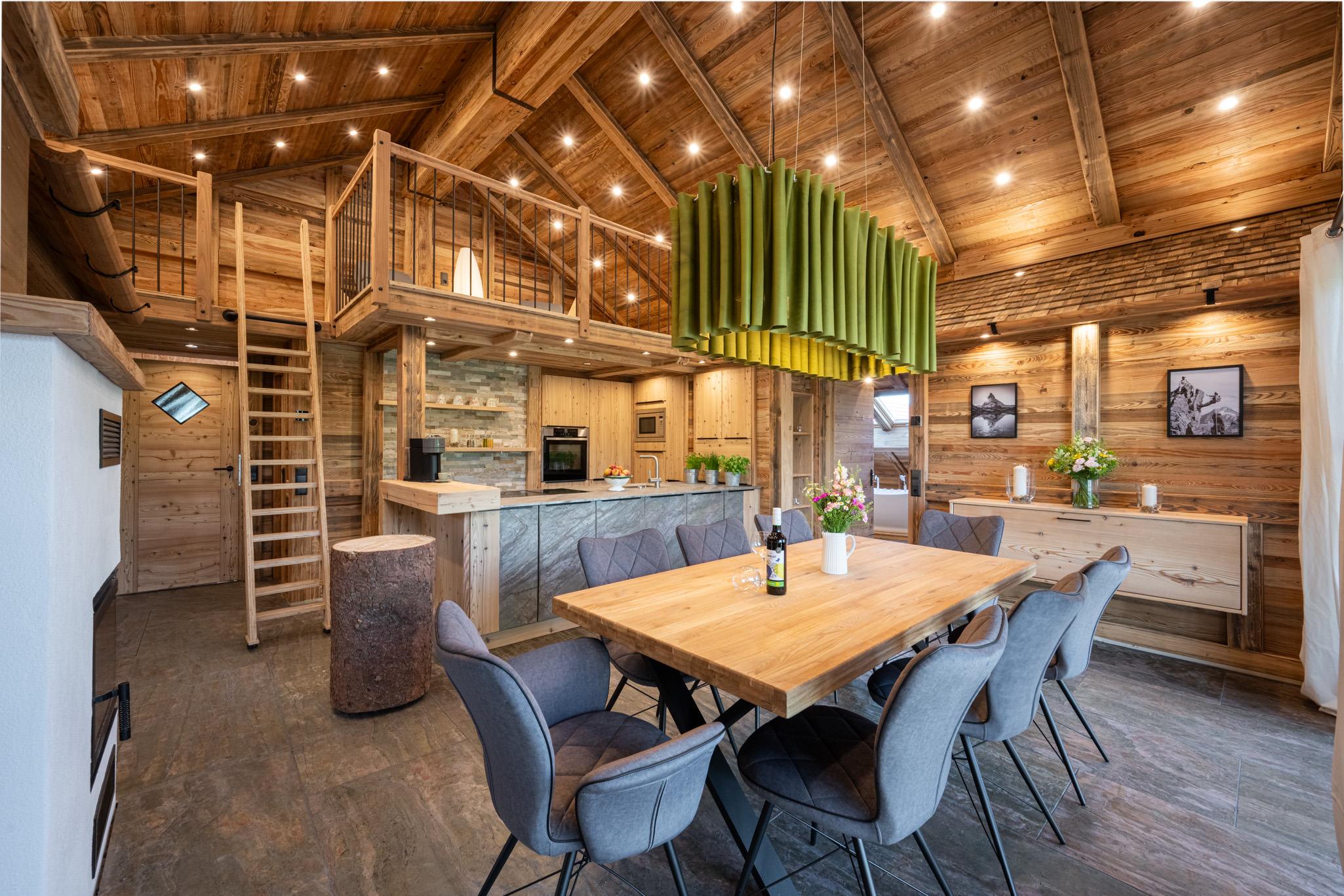 Unsere Chalets sind mit hochwertigen Materialien ausgestattet, die eine warme und einladende Atmosphäre schaffen. Für Ihren Komfort können die Räume klimatisiert werden. Die Schlafzimmer sind mit Zirbenholz ausgestattet, das für seine beruhigende und gesundheitsfördernde Wirkung bekannt ist. Ein gemütlicher Kachelofen sorgt für wohlige Wärme und schafft eine romantische Atmosphäre, besonders in den kälteren Monaten. In der komplett ausgestatteten Küche finden Sie alles, was Sie für die Zubereitung Ihrer Lieblingsgerichte benötigen. Genießen Sie die wohltuende Wärme und den angenehmen Duft der Zirbenholzsauna. Der Panoramabalkon bietet einen atemberaubenden Blick auf die Umgebung und ist der perfekte Ort, um die frische Bergluft zu genießen.