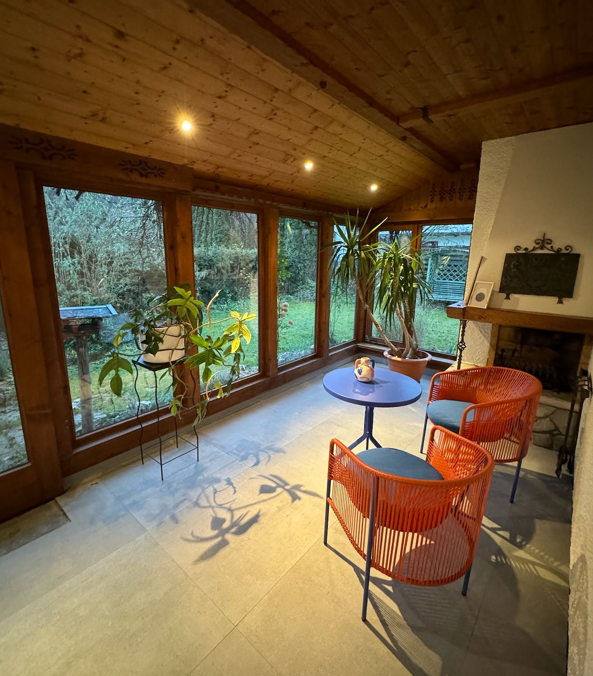 Geräumiger Wintergarten: Genießen Sie die Aussicht in unserem großzügigen Wintergarten, der mit einem gemütlichen Kamin ausgestattet ist – ideal für entspannte Abende.