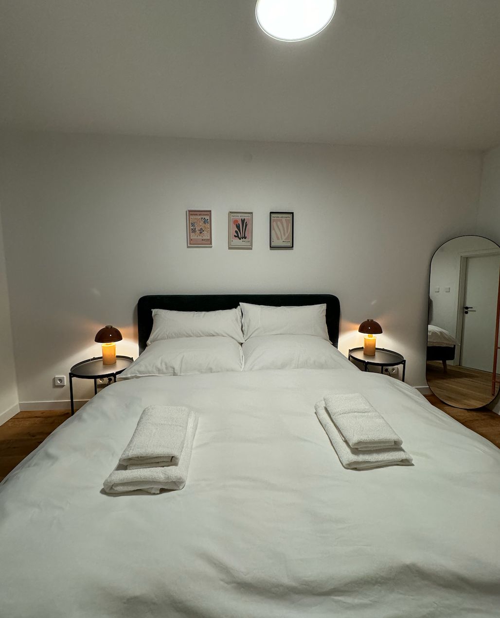 Schlafzimmer: Jedes Schlafzimmer ist mit einem Schrank ausgestattet, damit Sie sich wie zu Hause fühlen und ausreichend Stauraum haben.