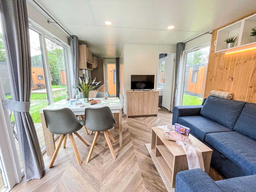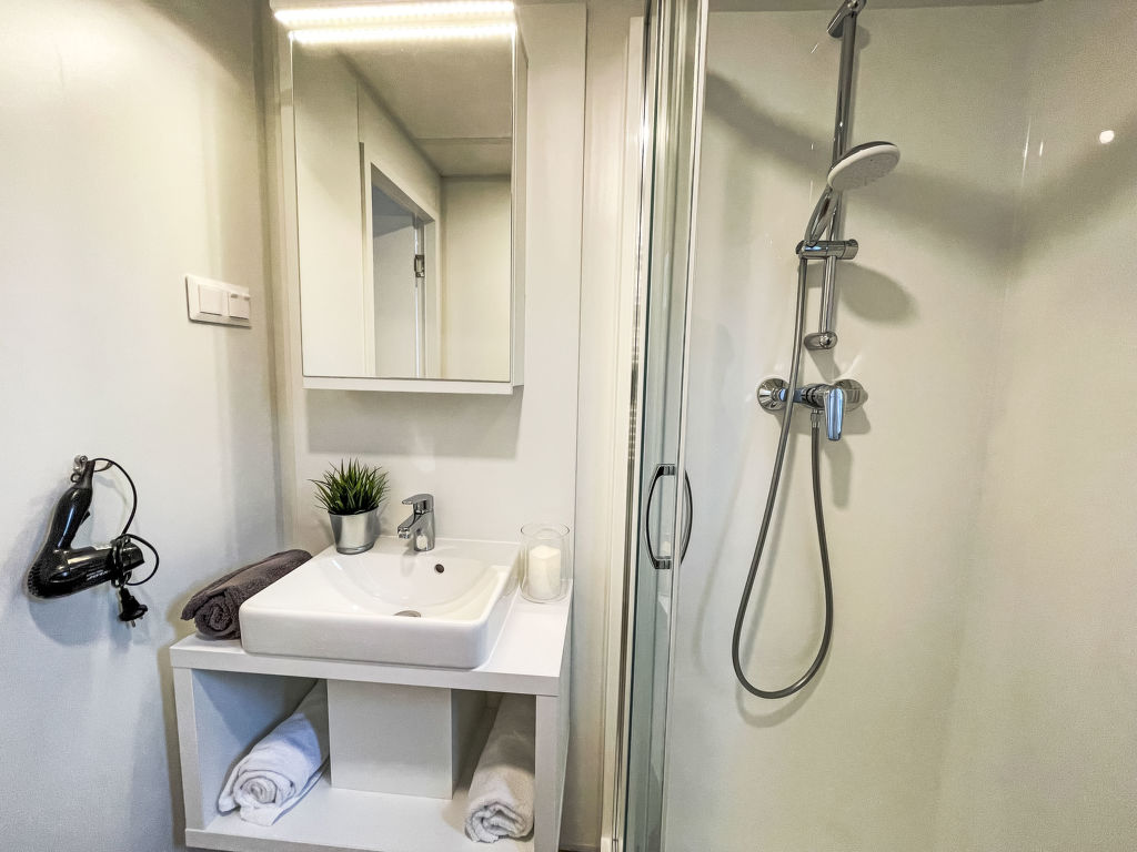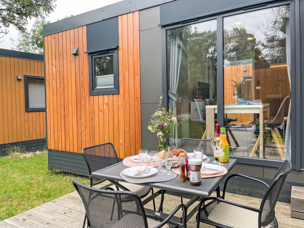 Tiny Haus Weltenburg, 3-Zimmer-Mobilheim 32 m2. Gemütlich eingerichtet: Wohnzimmer mit Sat-TV (Flachbildschirm). Ausgang zur Terrasse. 1 Zimmer mit 1 franz. Bett (140 cm, Länge 190 cm). 1 Zimmer mit 2 Betten (70 cm, Länge 190 cm). Kochnische (Geschirrspüler, 4 Glaskeramikplatten, Wasserkocher, elektrische Kaffeemaschine). Dusche/WC. E-Heizung. Kleine Terrasse. Terrassenmöbel. Parkplatz in 50 m. Bitte beachten: Nichtraucher-Haus. Maximal 2 Haustiere/Hunde erlaubt.