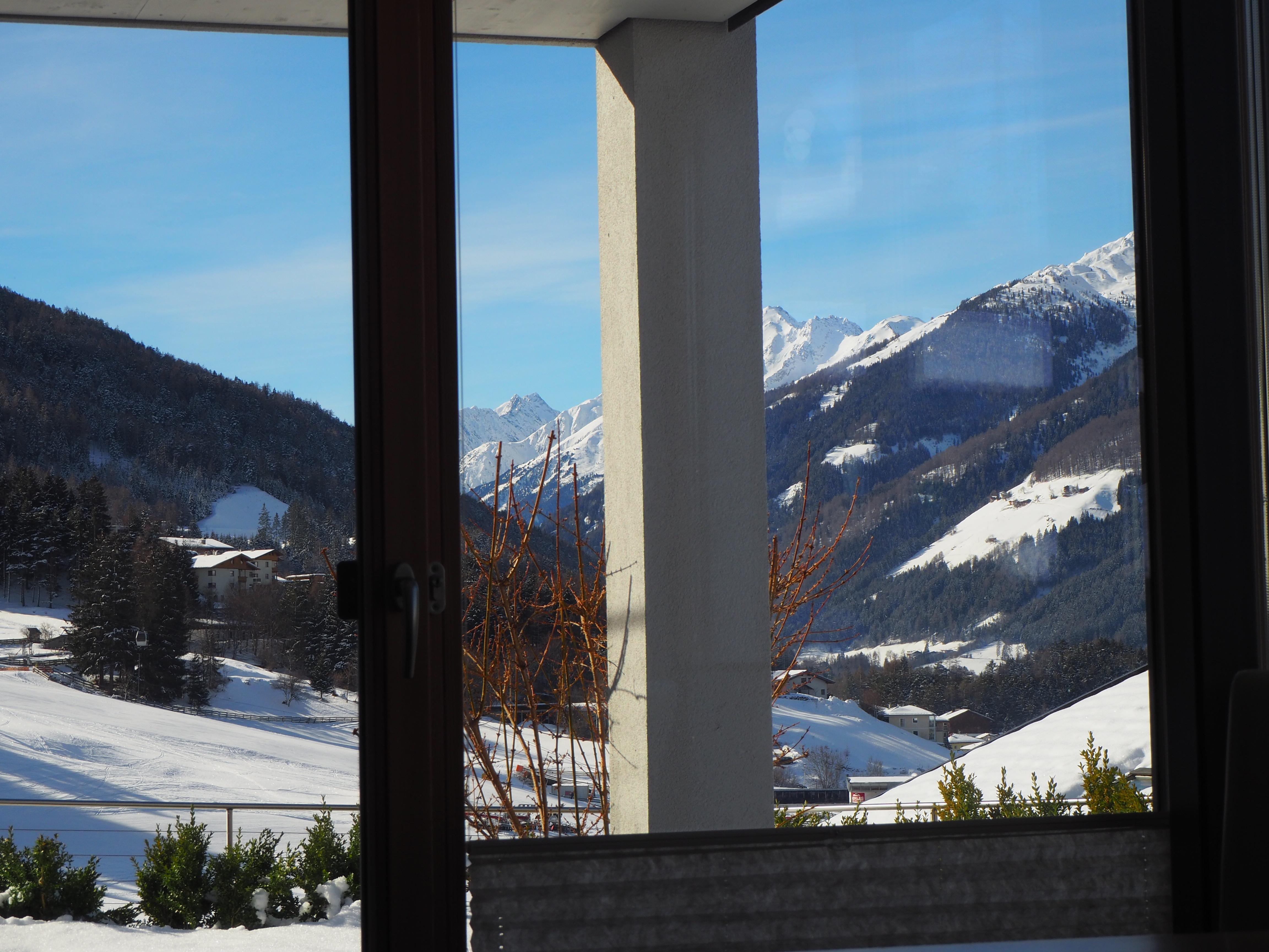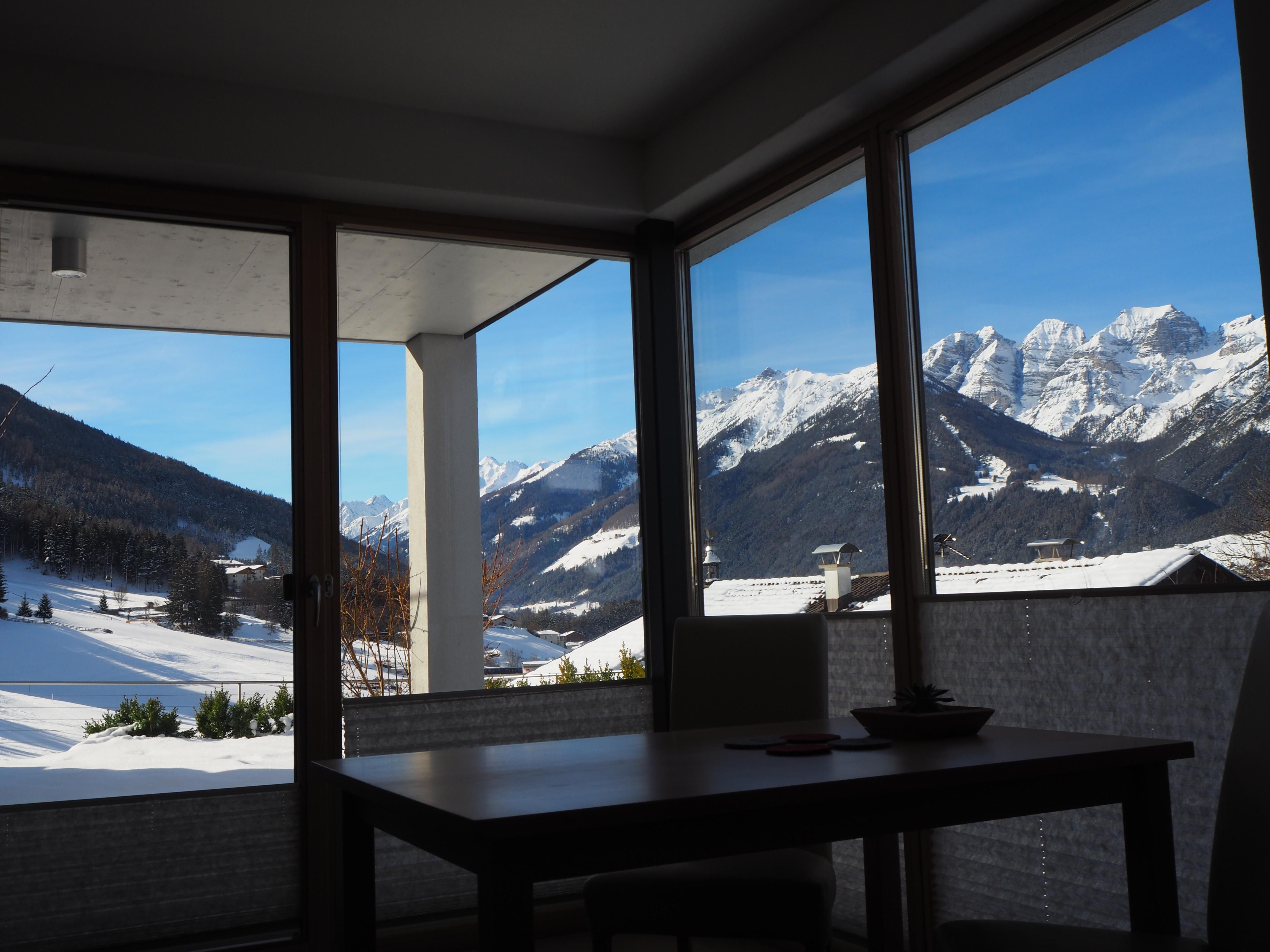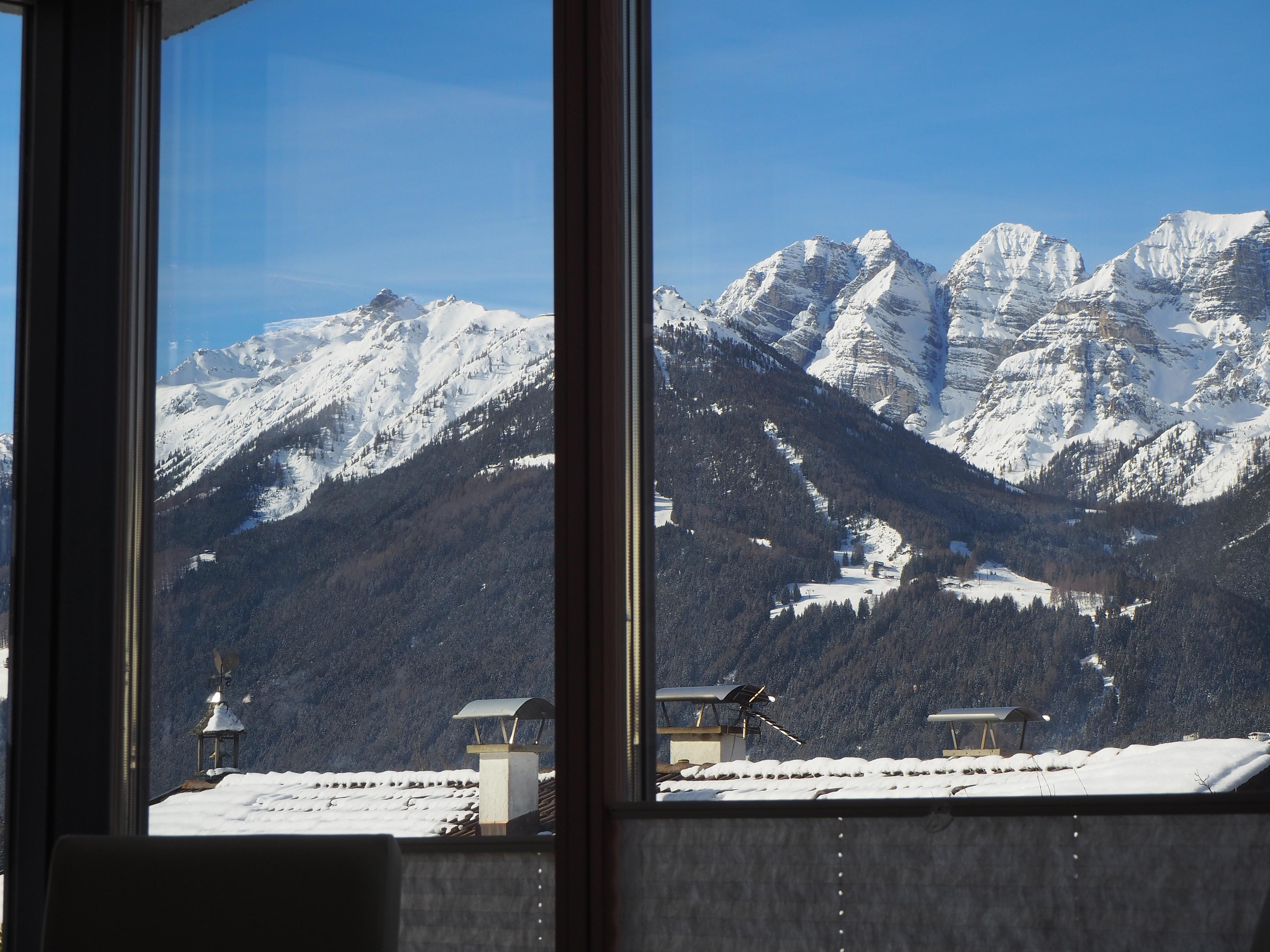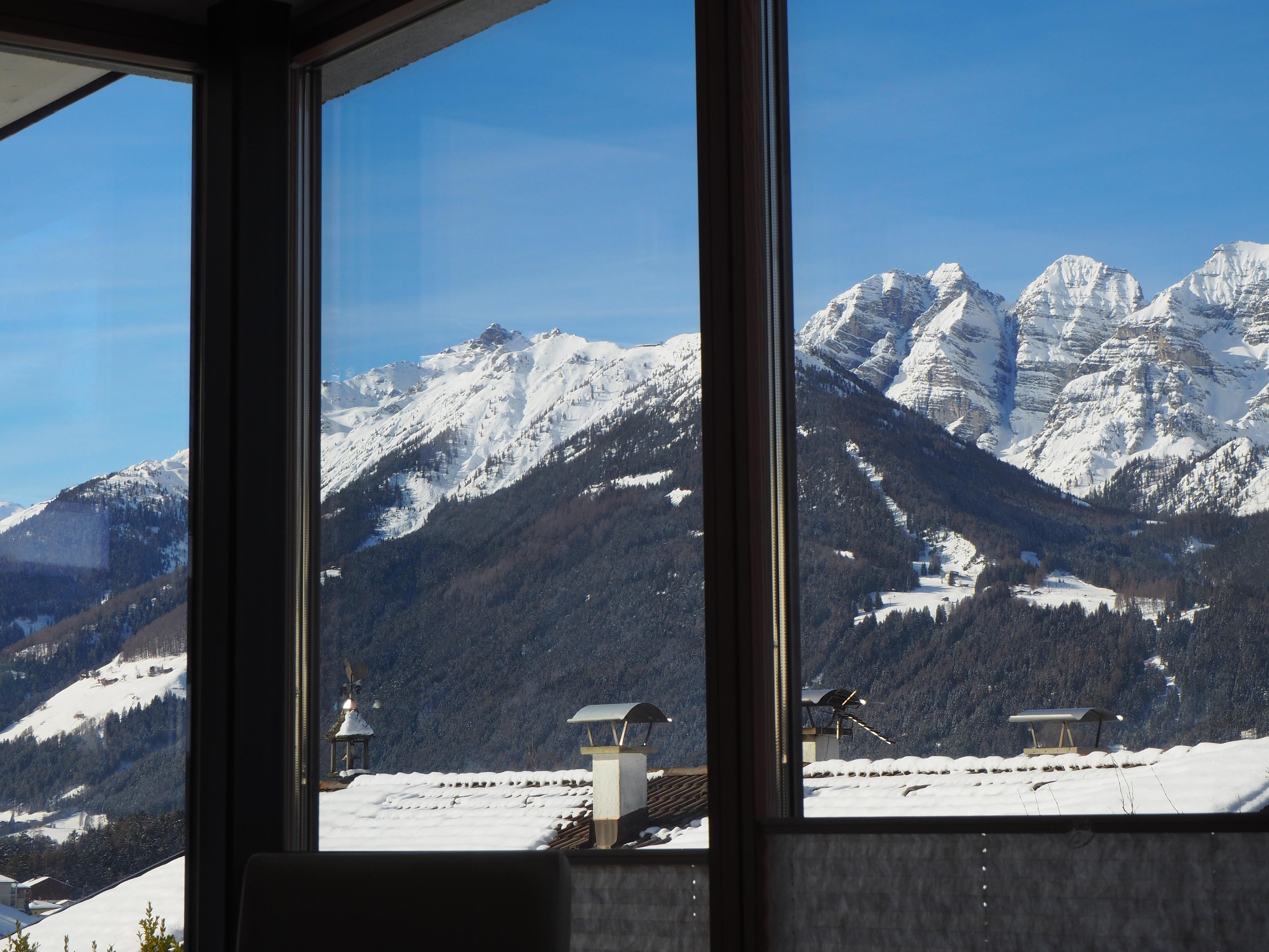 Vom Wohnzimmer aus genießt du einen herrlichen Ausblick auf die Kalkkögel und die Stubaier Berge.