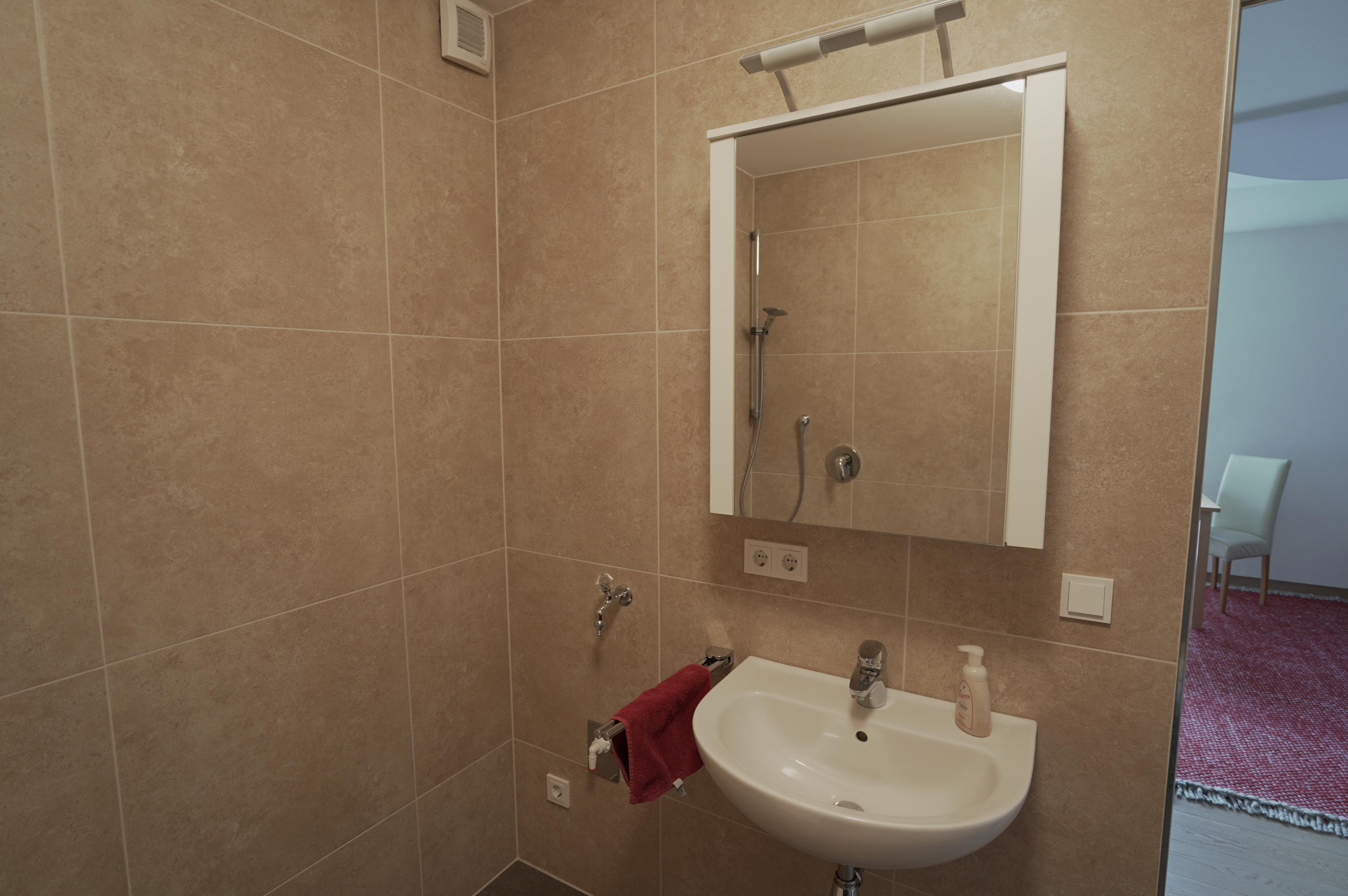 Das Badezimmer ist barrierefrei mit einer übergroßen Duschtasse und kräftigem Wasserstrahl.
