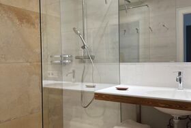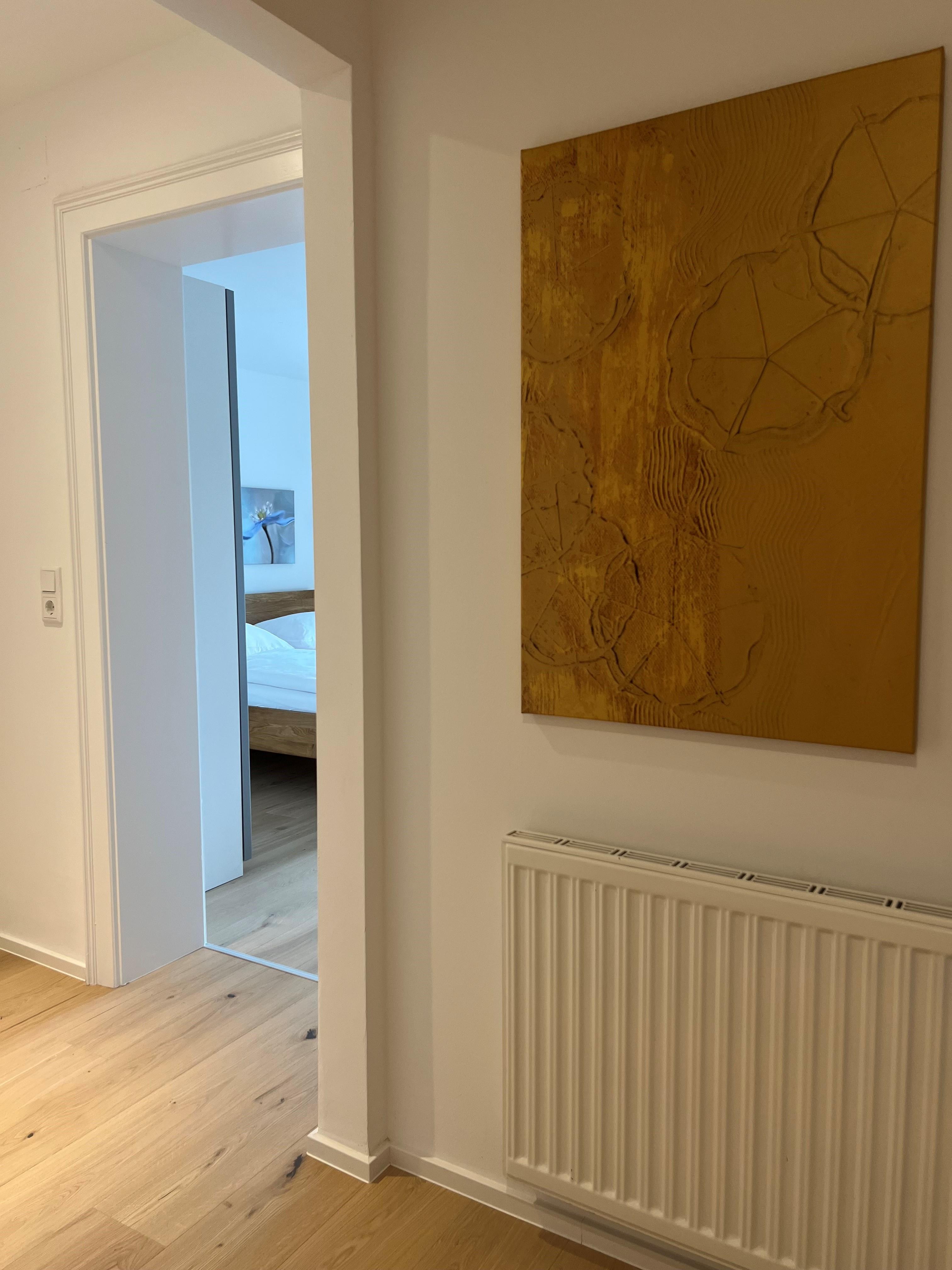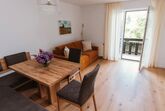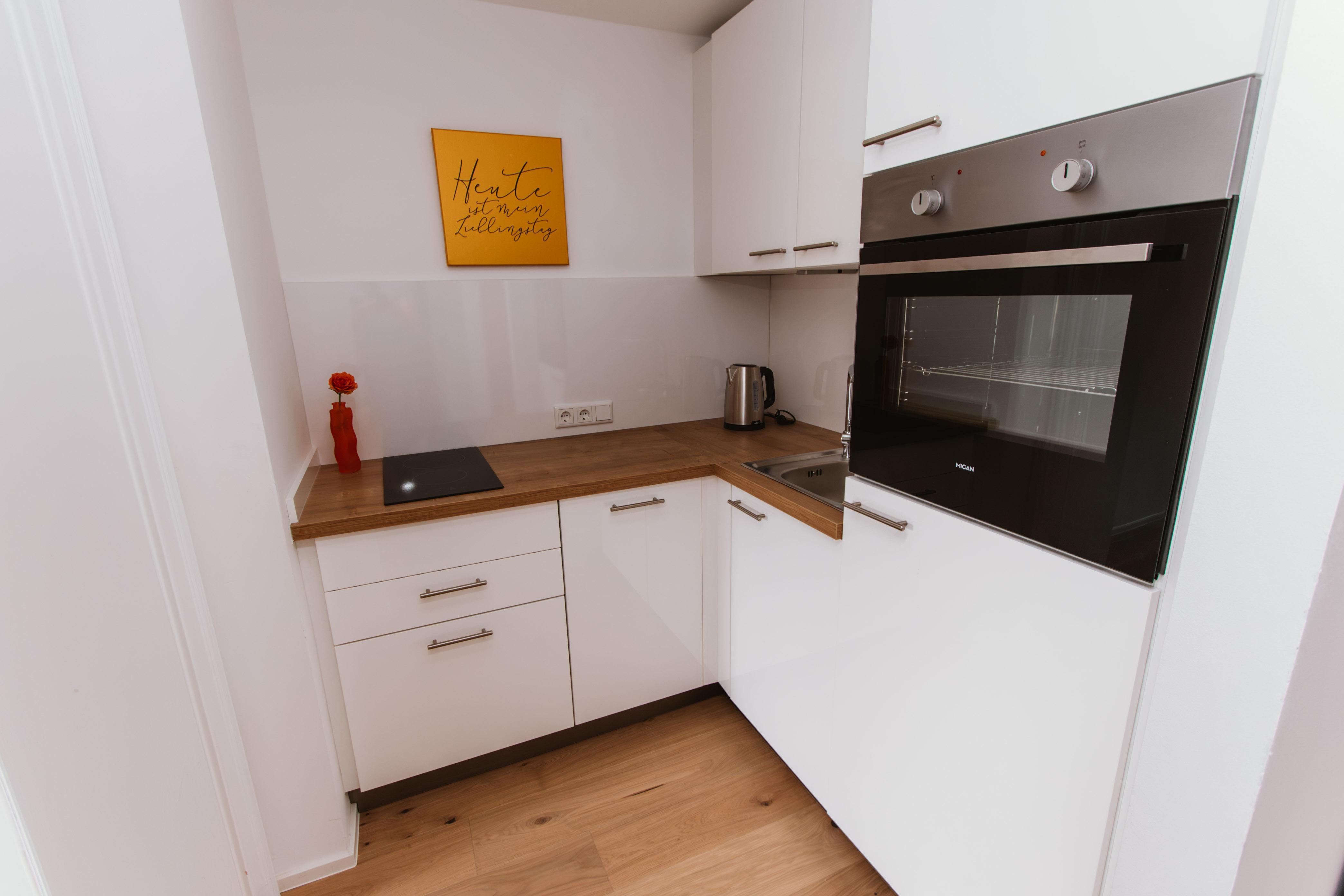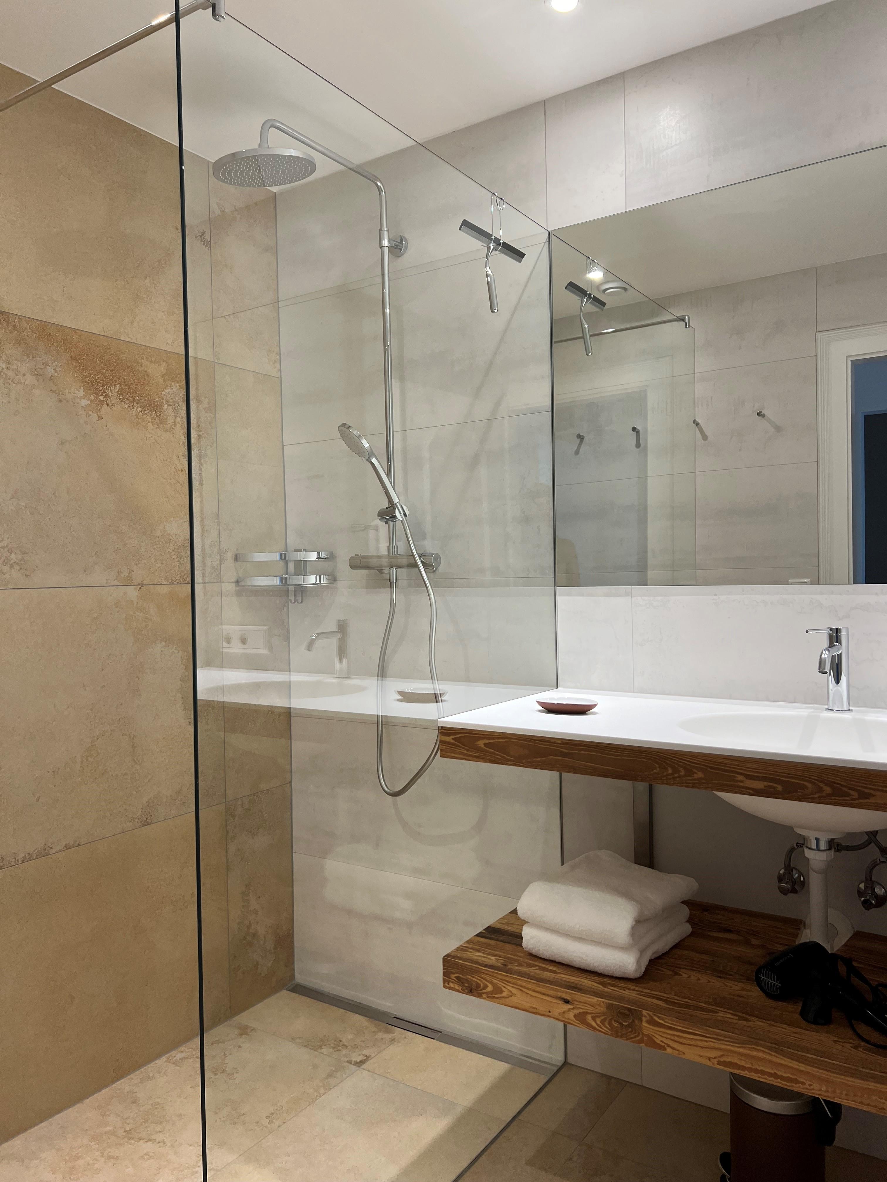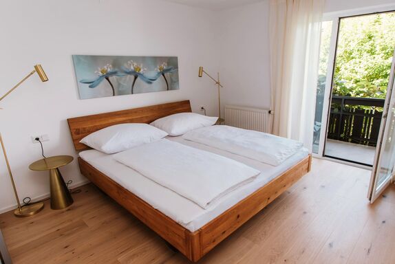 Appartement/Fewo, Vorraum, Badezimmer mit Dusche, separates WC, ein Schlafzimmer, Küche, Geschirrspüler, Backofen, Wasserkocher, Kaffeemaschine, Geschirrspültabs, Geschirrspülmittel, Geschirrtuch, Schwammtuch, Küchenrolle, Wohnbereich mit ausziehbarem Sofa (für 2 Personen), Flachbildfernseher, großer Balkon mit Gartenblick, Hand- und Duschtücher, Toilettenpapier, Bettwäsche