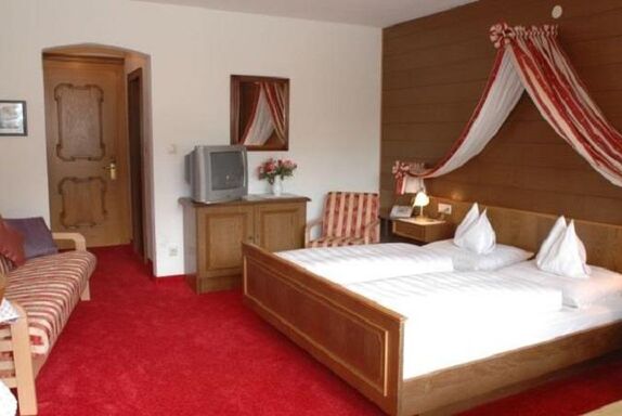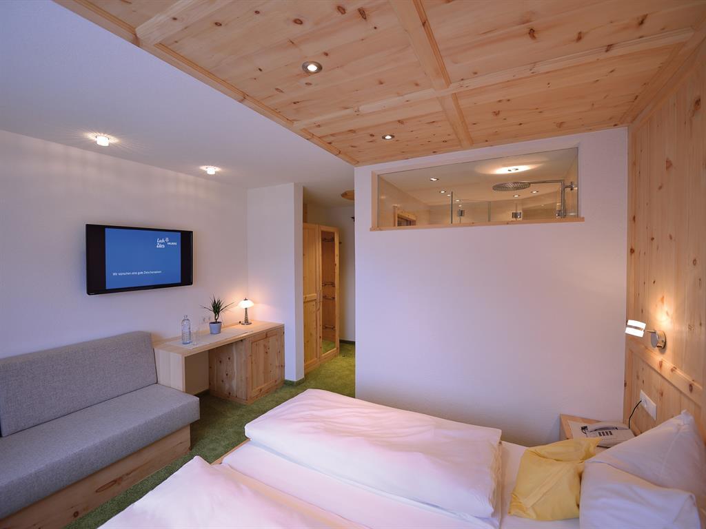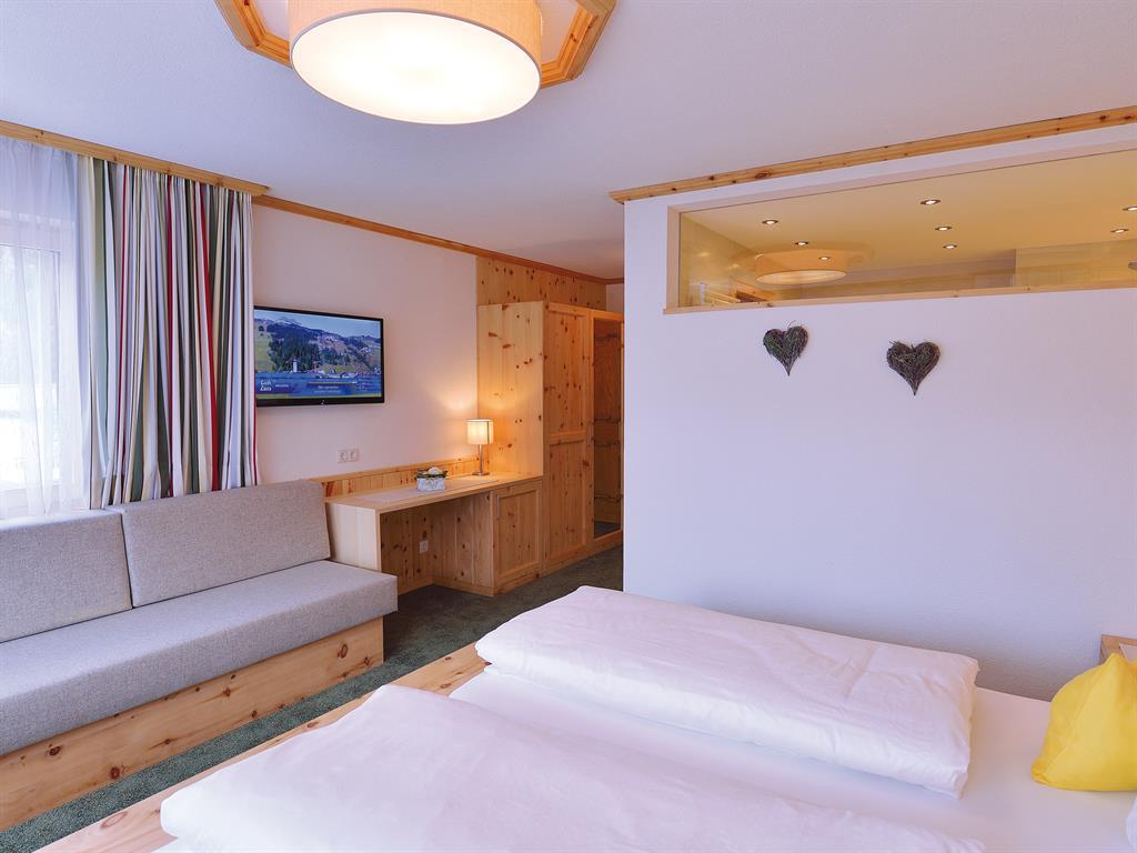 Doppelzimmer mit ca. 20 m² für 2-3 Personen mit Balkon. Vorraum mit Garderobe. 1 Doppelbett und 1 Liegecouch. Telefon, Kabel-TV, Radio, Wireless-Lan. Badezimmer mit Badewanne/Dusche, WC, Haarfön.