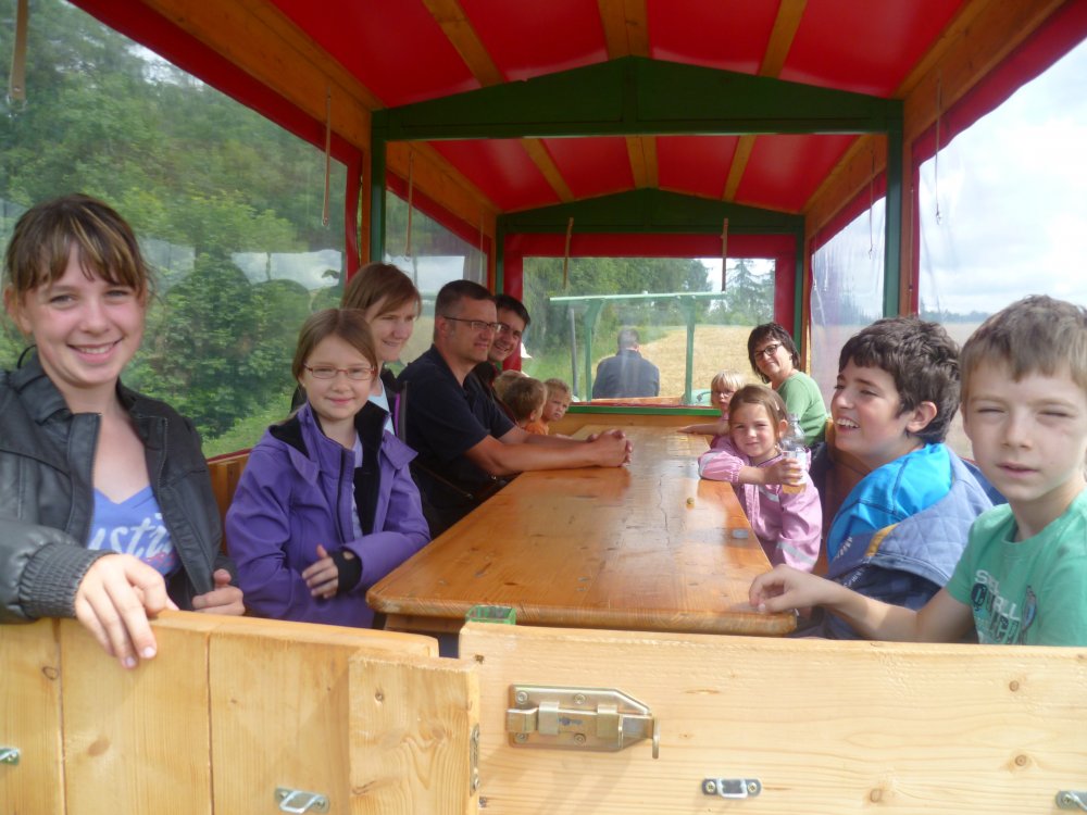 Bei einer Traktor- und Planwagenfahrt mit Bauer Willi geht es hinaus in Feld und Flur. Mit dem Güldner-Oldtimer kann man sogar Karusell fahren.