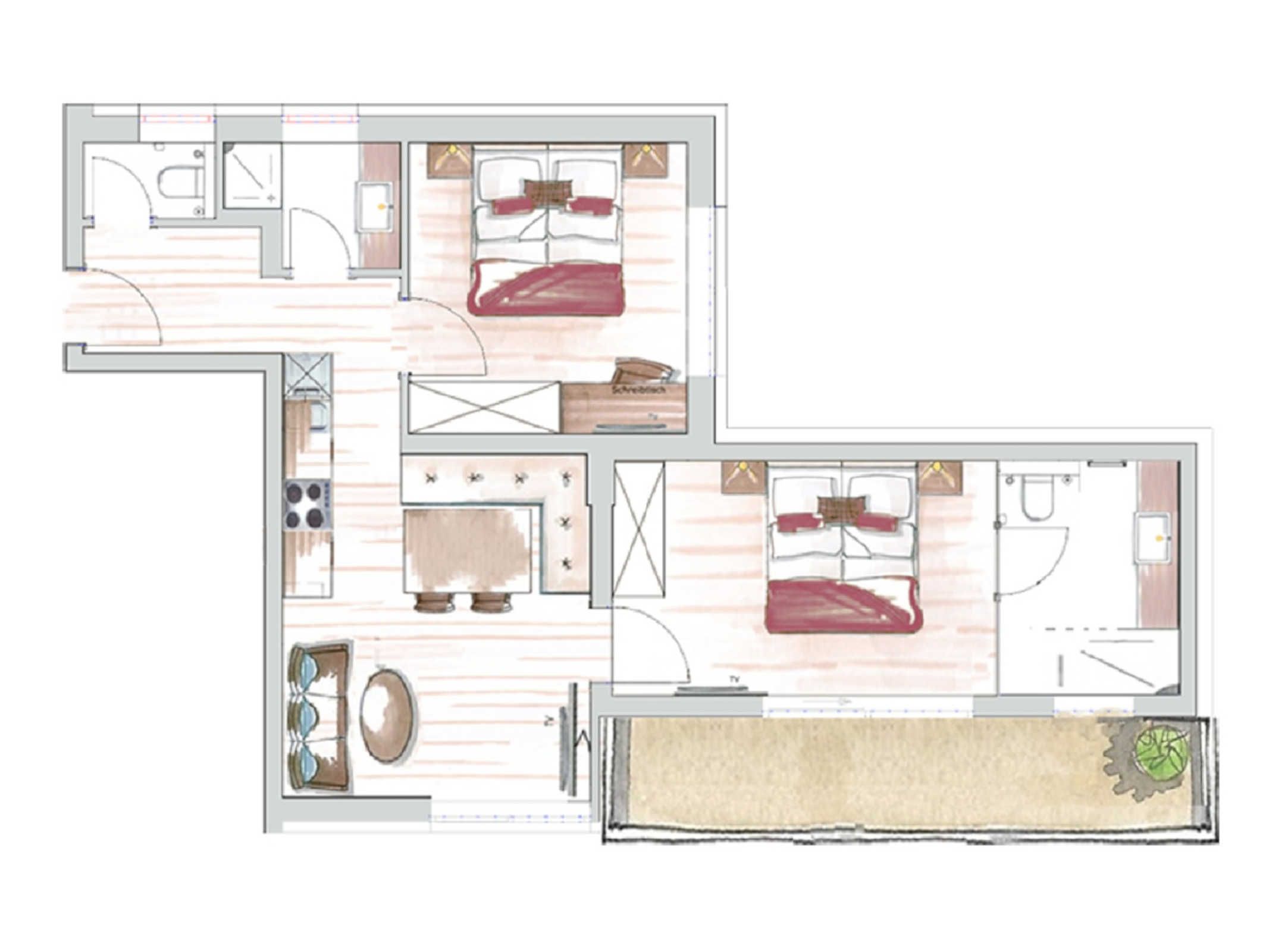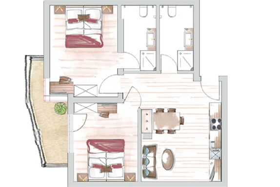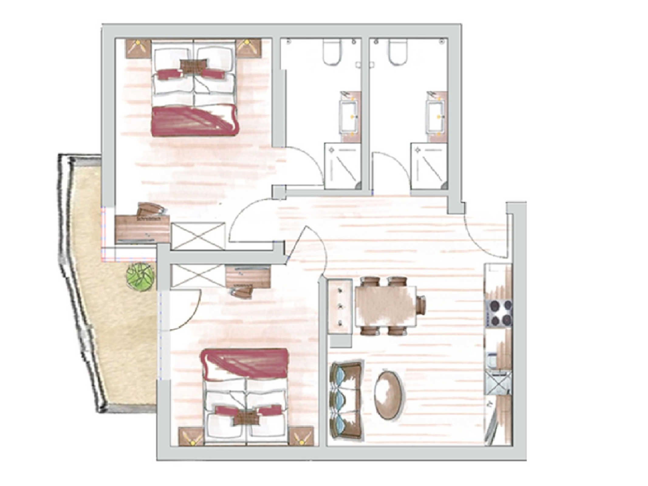 Mit zwei Schlafzimmern und zwei Bädern sind diese Ferienwohnungen für 2 Pärchen, größere Familien oder kleinere Freundesgrüppchen besonders gut geeignet. Highlights sind die besonders geräumigen Badezimmer mit XL Duschen.