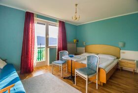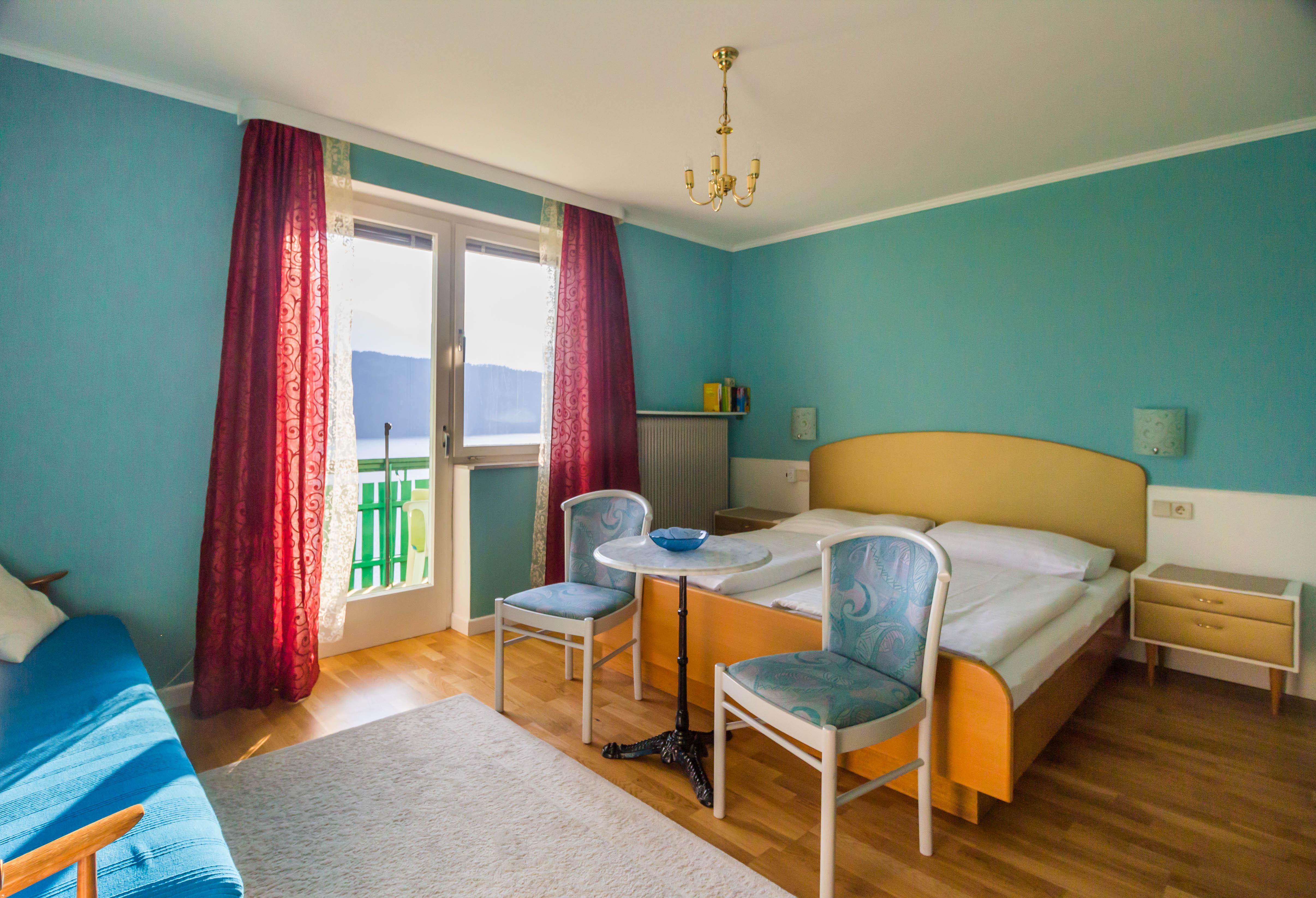 Unsere Doppelzimmer haben alle ca. 15 m², ein Doppelbett, Bad mit Dusche und WC, Ö-TV, W-LAN und einen großen Balkon bzw. eine große Terrasse mit traumhaftem Blick auf den See und die Berge.