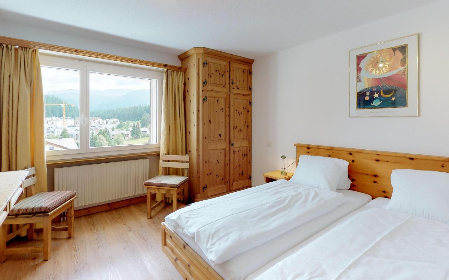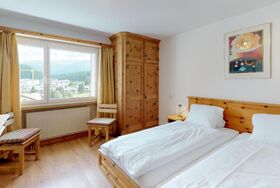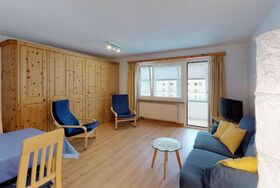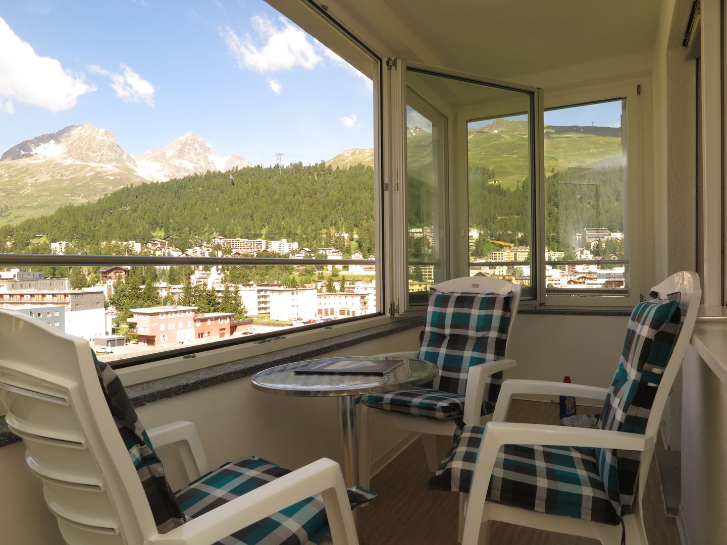 Gepflegte, schöne Ferienwohnung im 7. Stock mit wunderbarer Aussicht auf die Engadiner Berge. Wohn- /Esszimmer mit 2 Arvenklappbetten und Küche. Zusätzliche Loggia/Balkon. Doppelschlafzimmer. Bad/Dusche. Lift, Garagenplatz, Ski- und Fahrradkeller.
