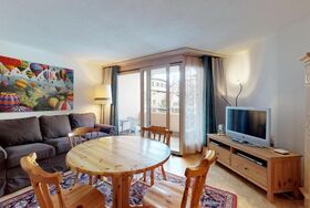 Gemütliche 1.5 - Zimmer Ferienwohnung im Herzen von Celerina. Wohn- /Esszimmer mit Kamin sowie Schlafsofa und Balkon. Separate Schlafecke mit 2 Einzelbetten. Badezimmer. Komplett ausgestattete Küche mit Kühlschrank. 1 Garagenparkplatz (enge Zufahrt, 1,90 m Höhe).