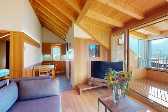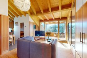 Das gemütliche, helle 2-Zimmer Ferienappartement befindet sich im obersten Geschoss. Wohn- /Esszimmer mit offener Küche. Wohnungseigene Sauna für die optimale Entspannung in Ihren Ferien.1 Doppelschlafzimmer. Dusche/WC. Das Sofa kann zu einem Schlafsofa vorbereitet werden. Auf Anfrage kann man die Wohnung für 3 Personen mieten (2 Erwachsene + 1 Kind). Dachloggia mit herrlichem Ausblick über Celerina und die Engadiner Berge. 1 Tiefgaragenplatz. Ski- und Fahrrad Raum in Gemeinschaft.