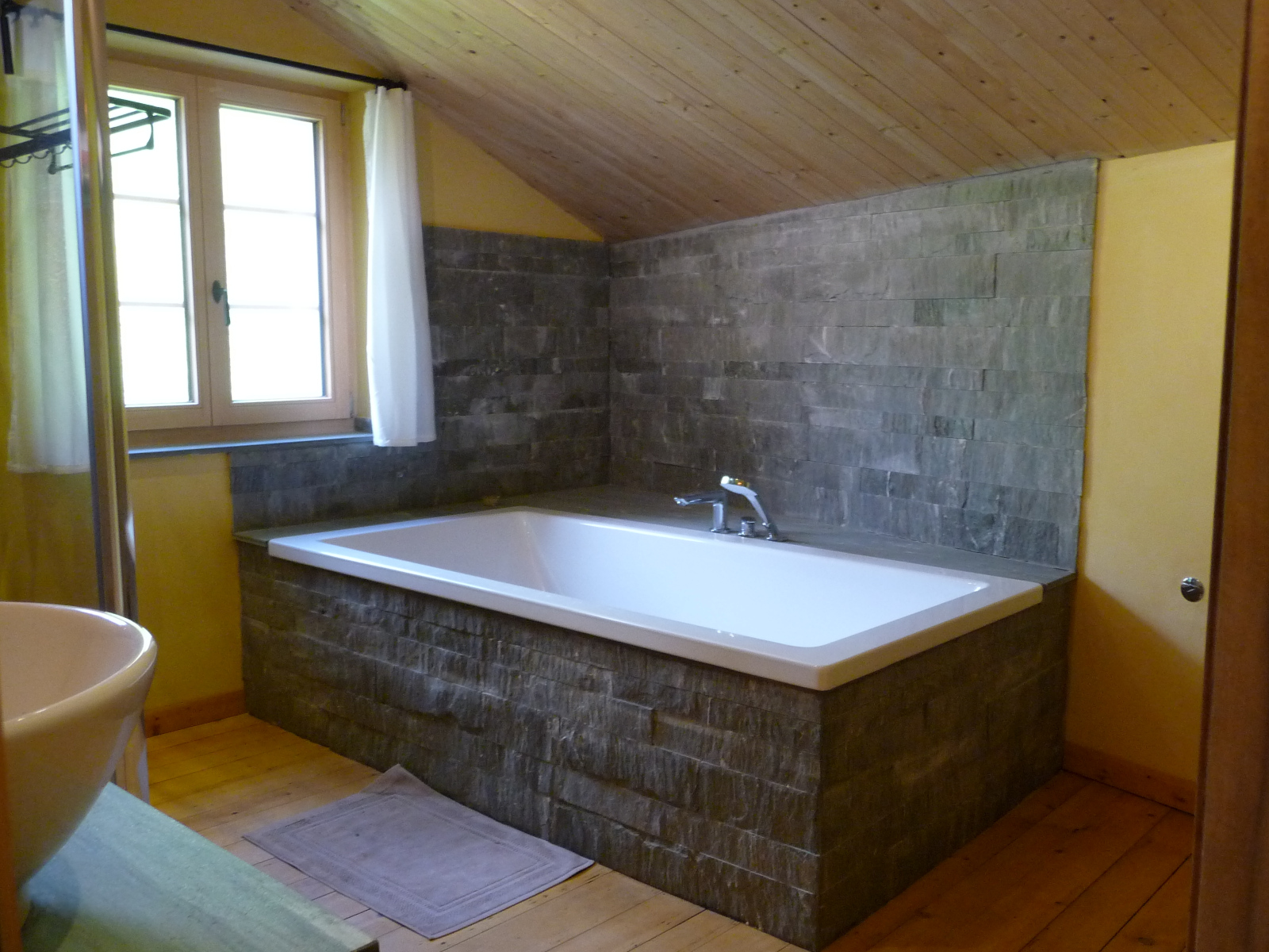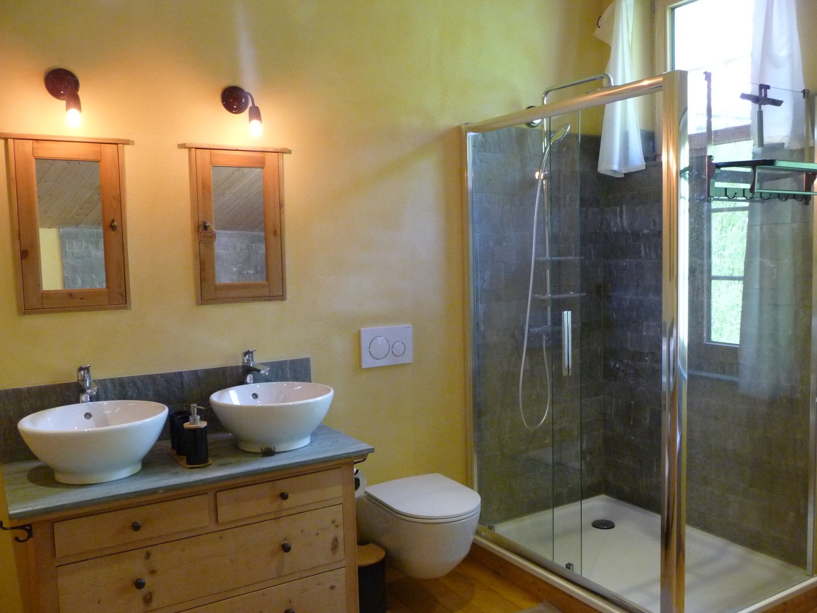 Das grosszügiges Badezimmer im OG verfügt über eine Badewanne, eine Duschkabine zwei Lavabo und ein WC. Im EG hat es ein WC/Lavabo. Frotteewäsche ist vorhanden und im Preis inbegriffen.