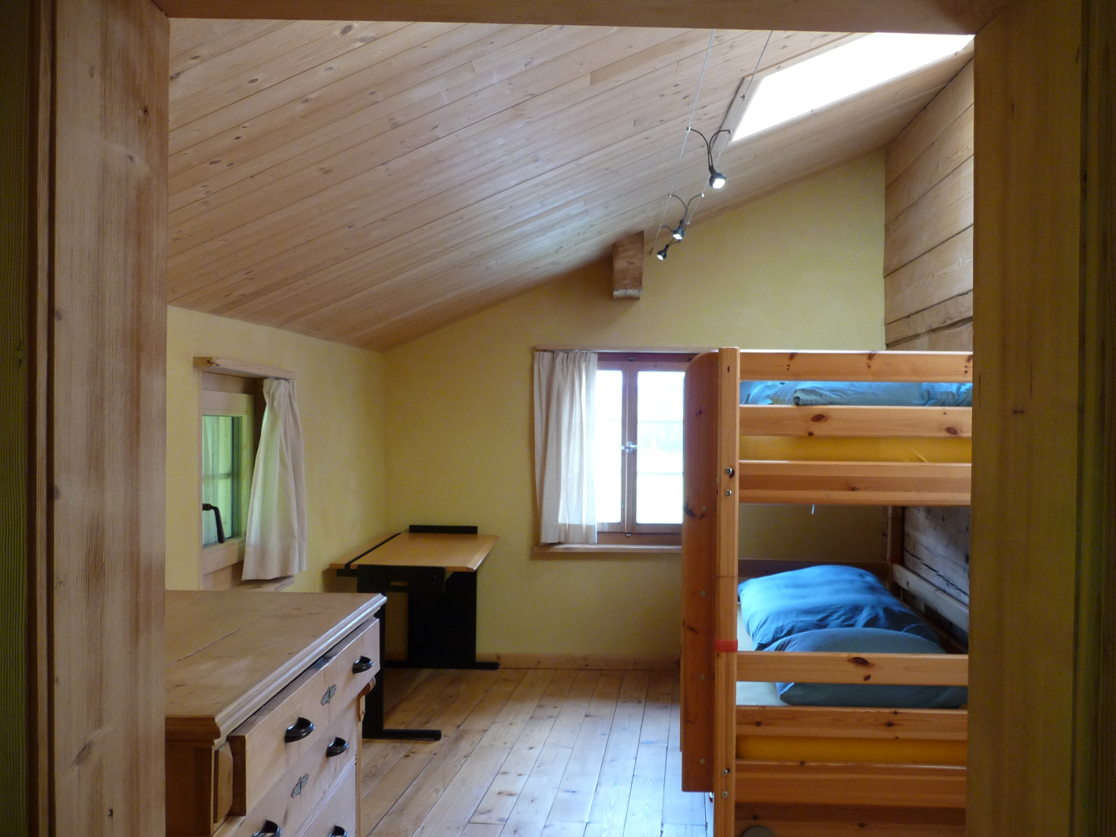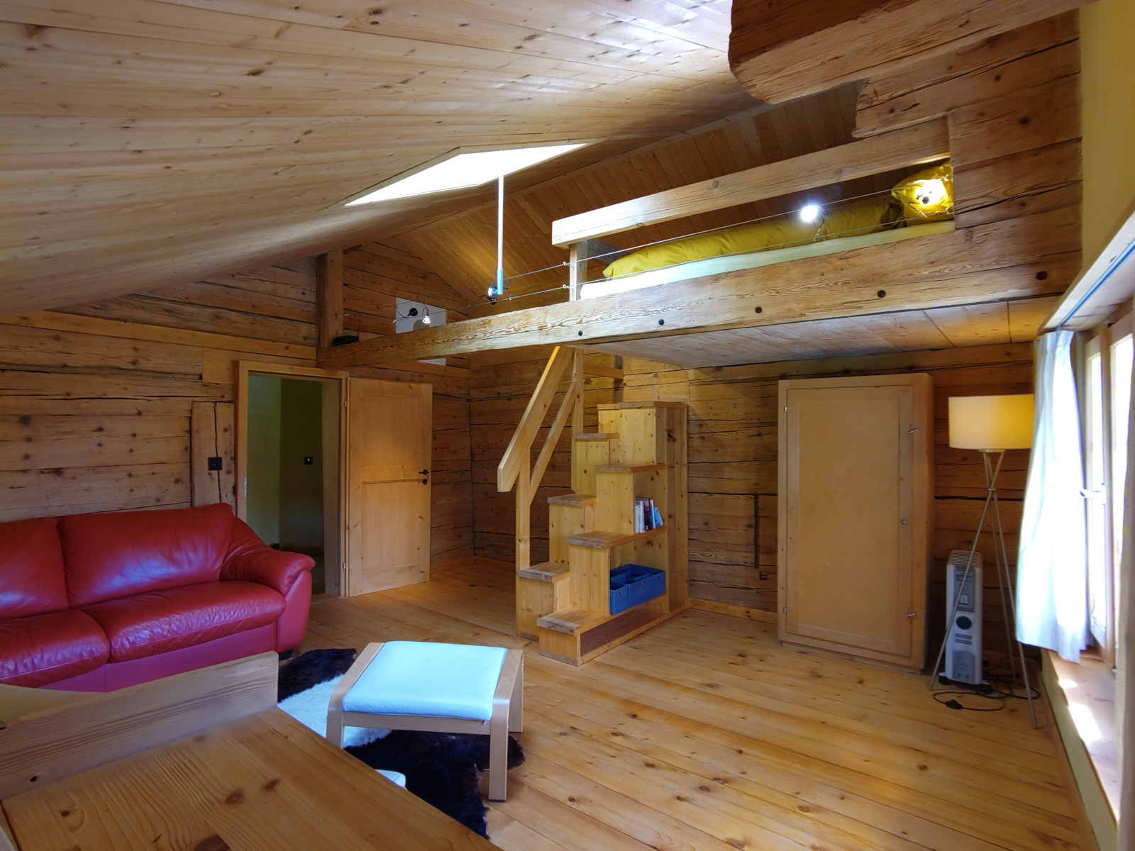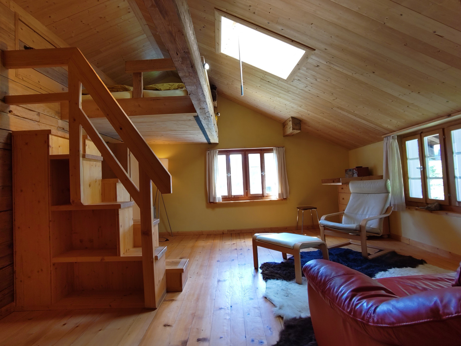 Das Haus verfügt über zwei Schlafzimmer. Ein grosses Schlafzimmer mit Galerie-Doppelbett, Tisch, Schrank, Komode und Schlafsofa. Ein kleines Schafzimmer mit Kajutenbett, Komode und Schreibtisch Wohnbereich: