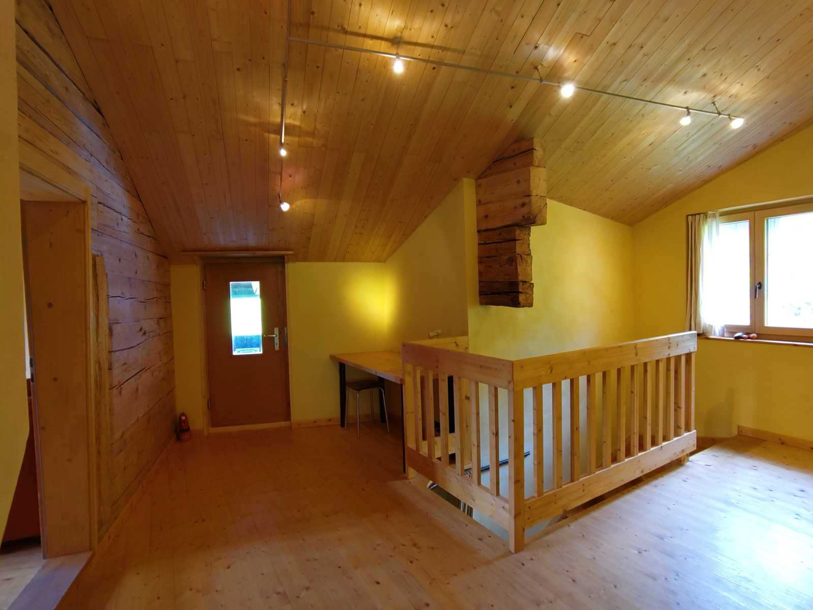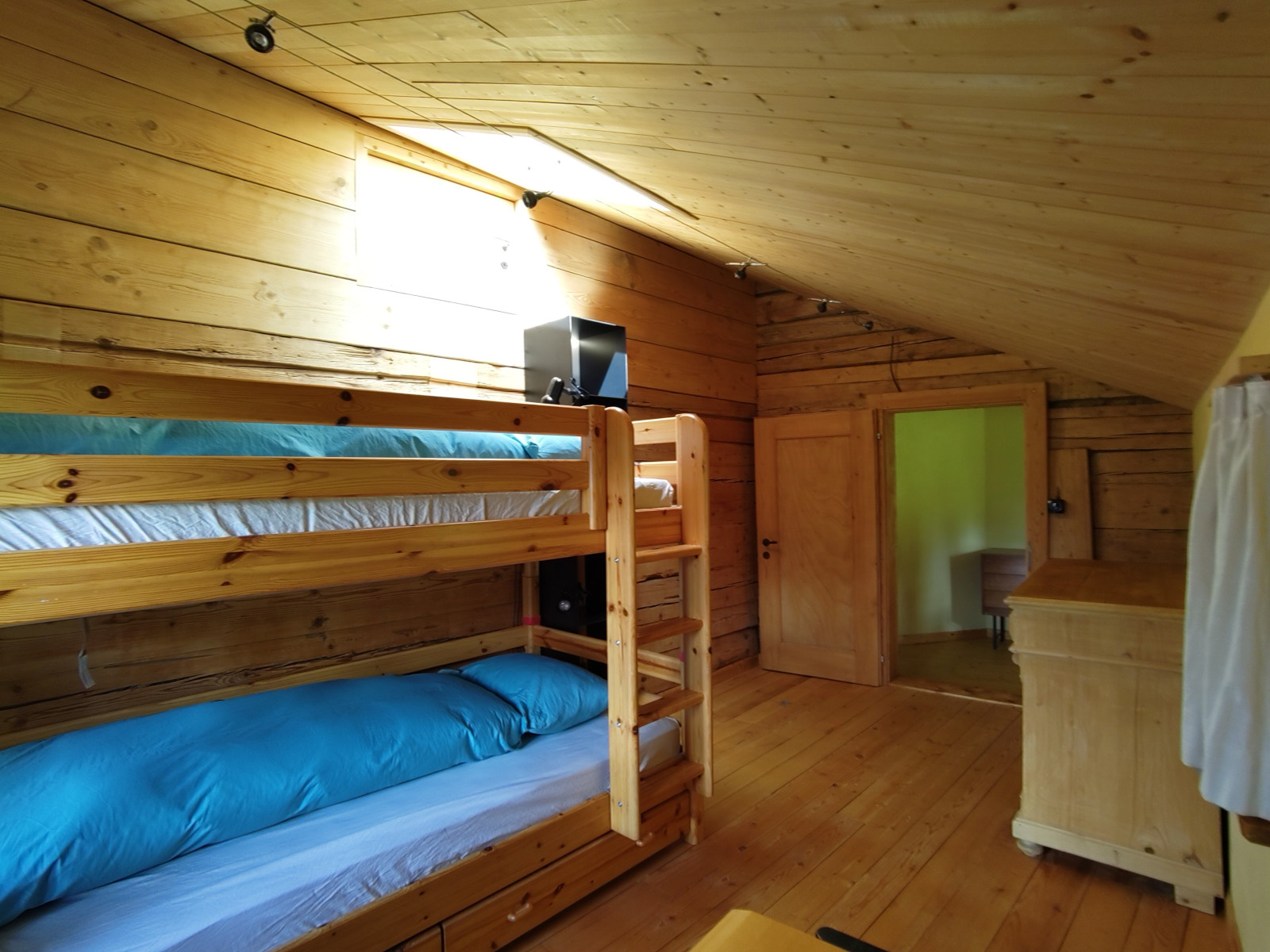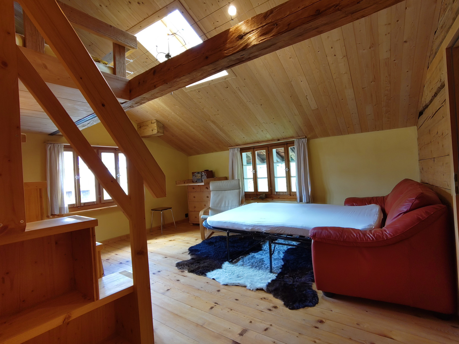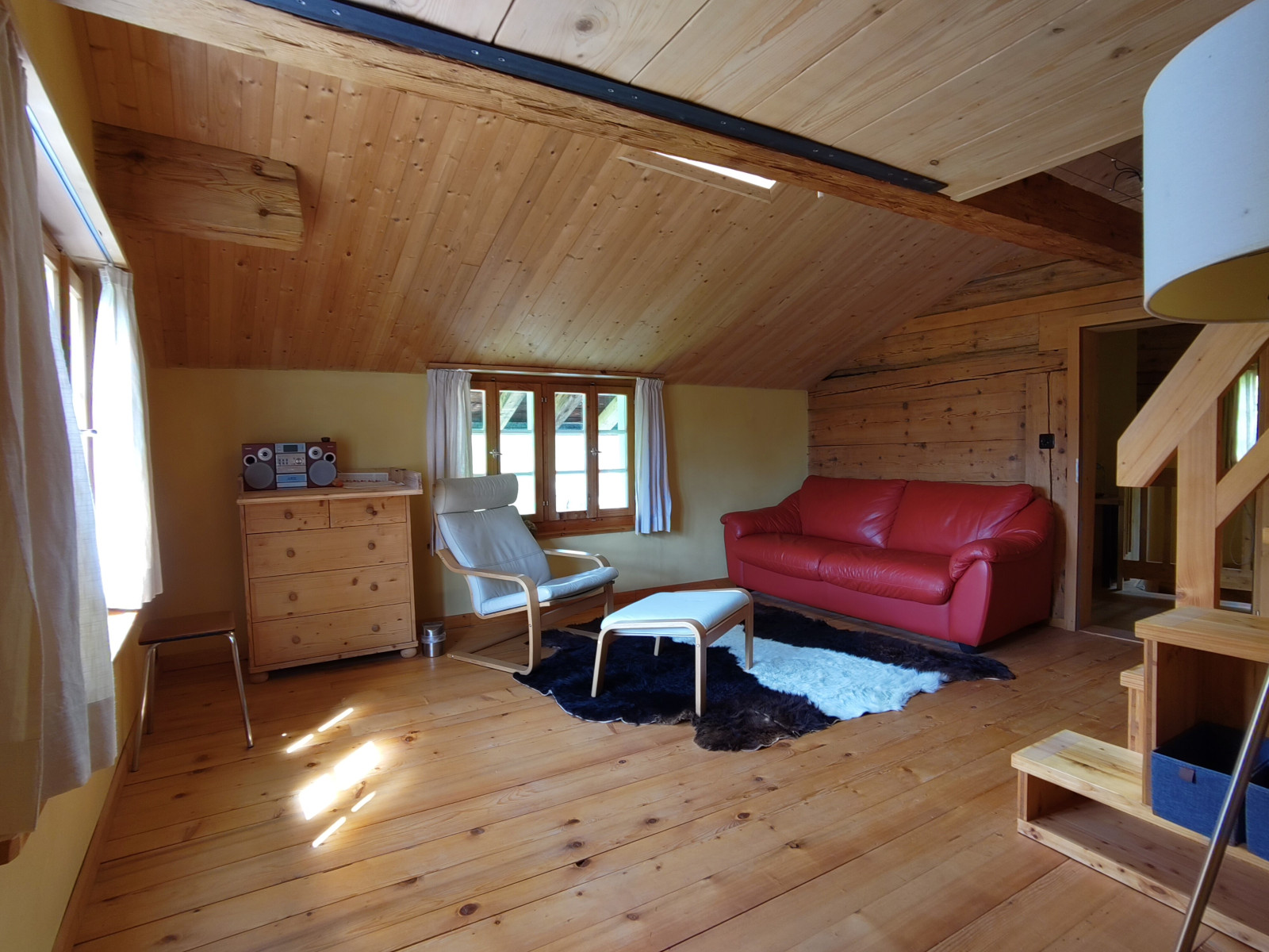 Das Haus verfügt über zwei Schlafzimmer. Ein grosses Schlafzimmer mit Galerie-Doppelbett, Tisch, Schrank, Komode und Schlafsofa. Ein kleines Schafzimmer mit Kajutenbett, Komode und Schreibtisch Wohnbereich:
