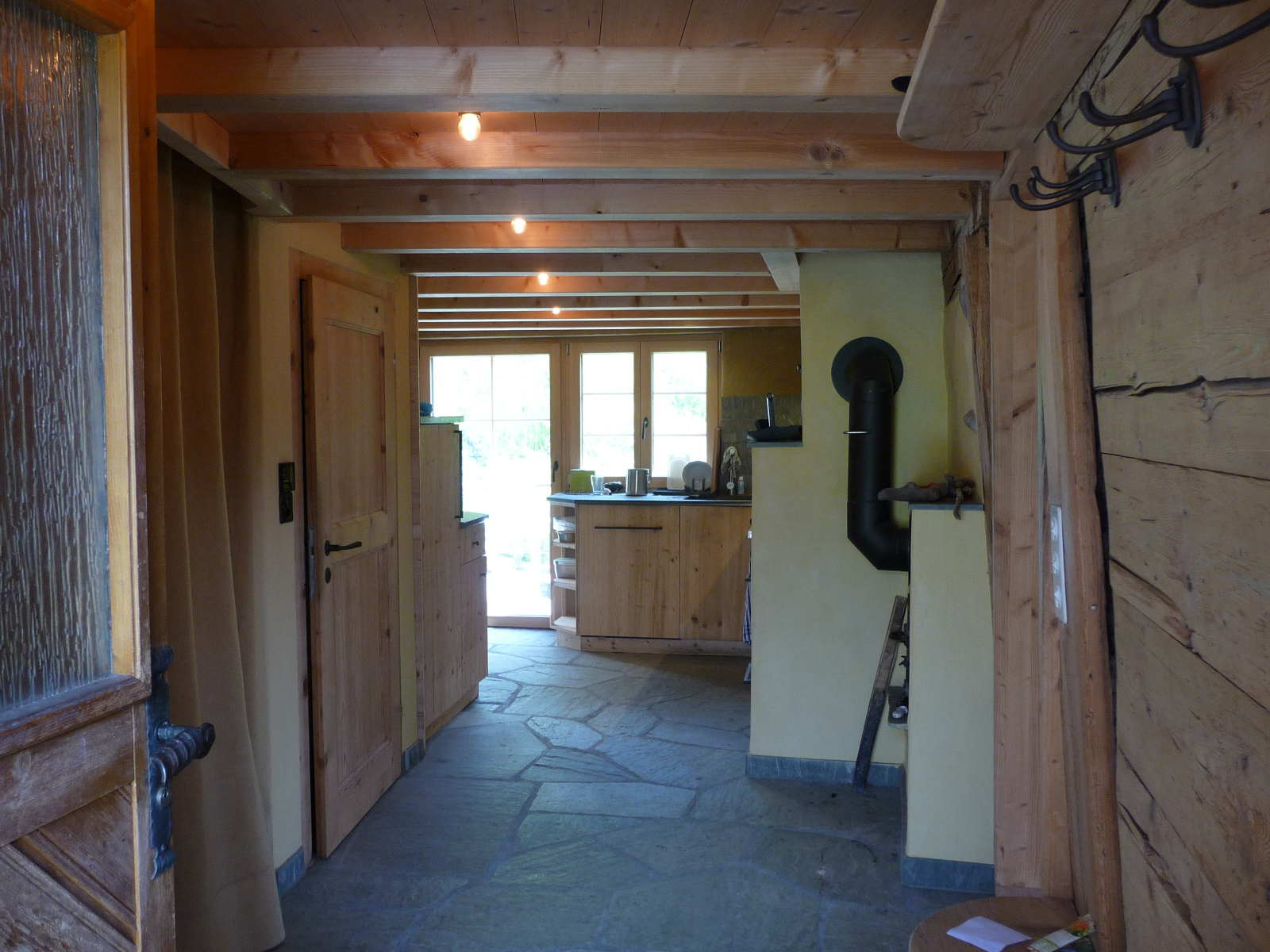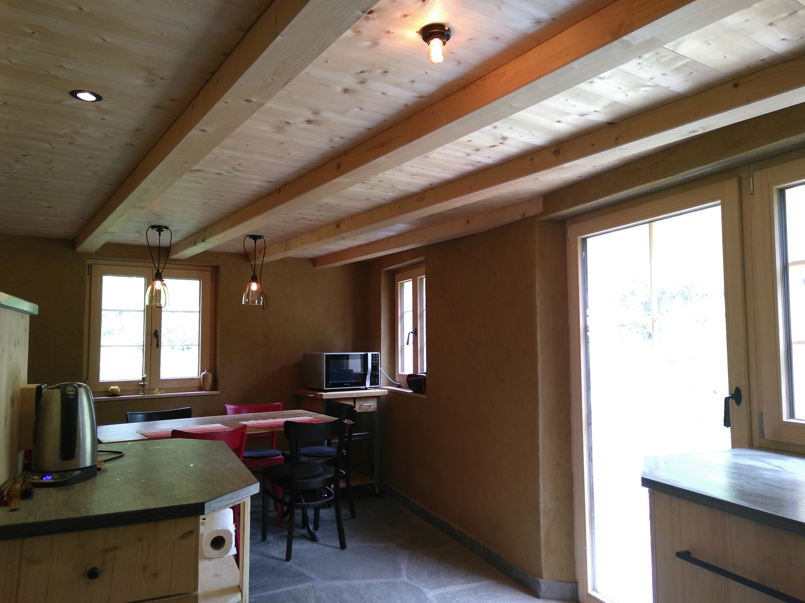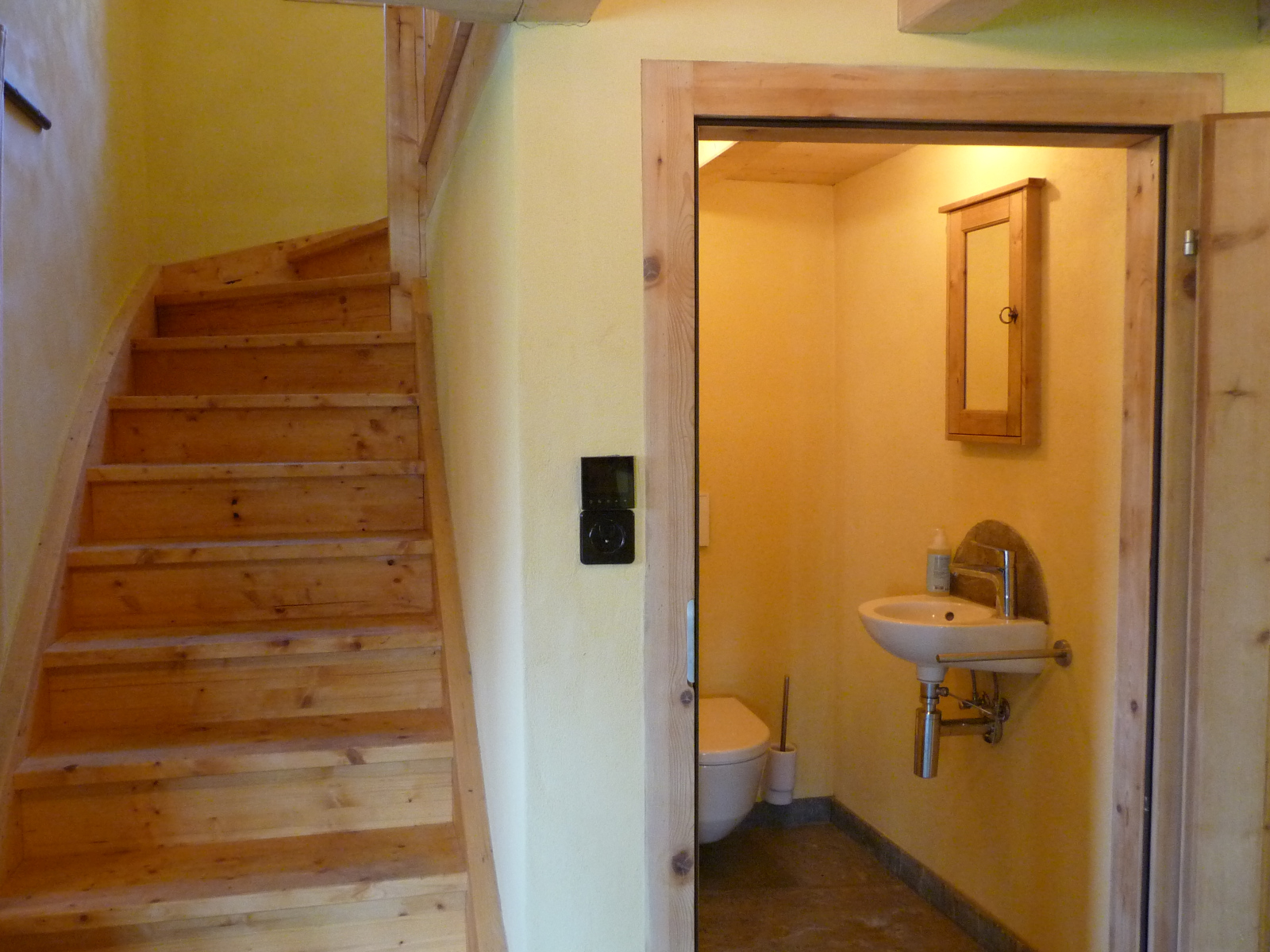 Die Küche ist komplett ausgestattet und verfügt über einen Glaskeramik Kochherd mit Backofen, einem Holzherd, einem grossen Kühlschrank einer Geschirrspülmaschine und zwei edelstahl Kaffekochern in mittlerer Grösse. Küchenwäsche ist vorhanden und im Preis inbegriffen. Badezimmer: