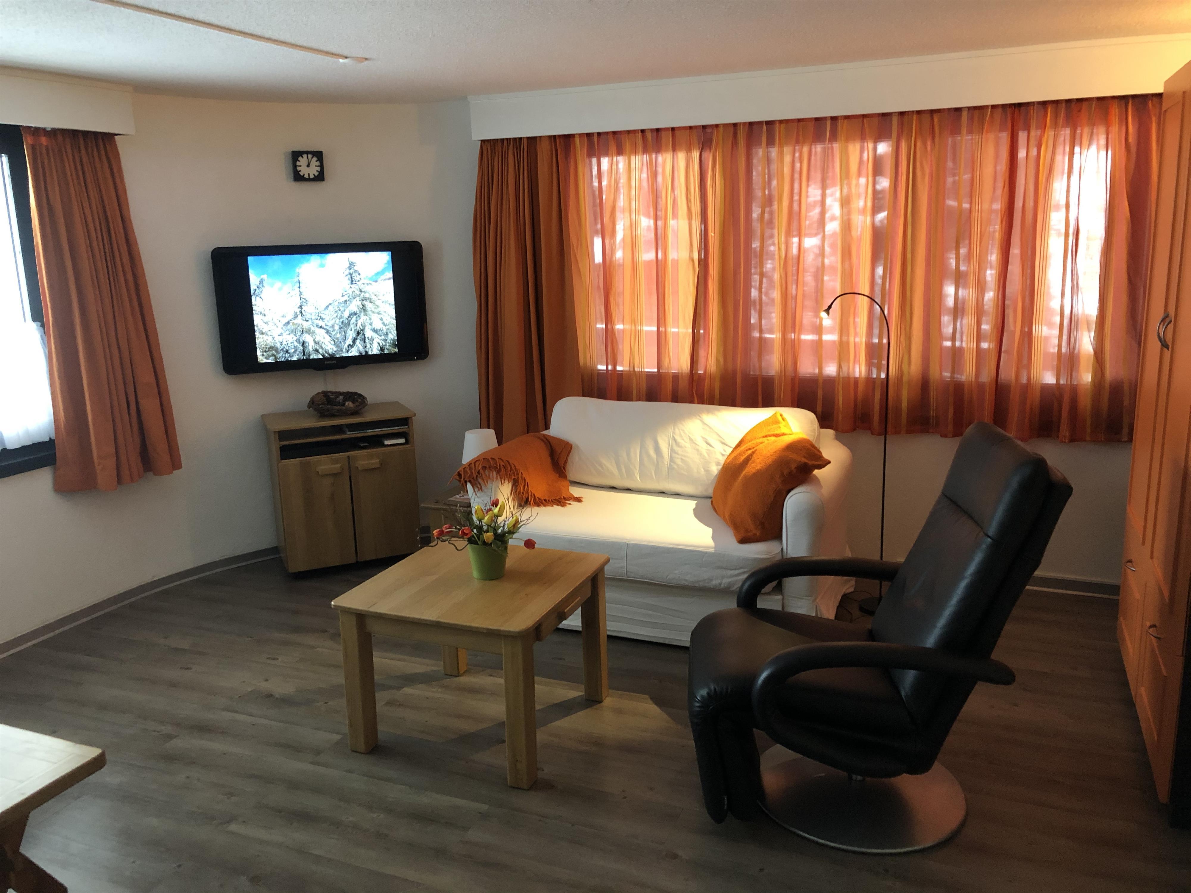 Die Einzimmerwohnung/Studio im Erdgeschoss, mit Südterrasse verfügt über eine komfortable Wohnküche, 1 Wandklappbett für 2 Personen, 1 Sitzecke mit Schlafsofa, Internet-TV, Haarföhn, Dusche/WC. Nichtraucherhaus. Parkplatz in der Nähe vom Haus.