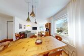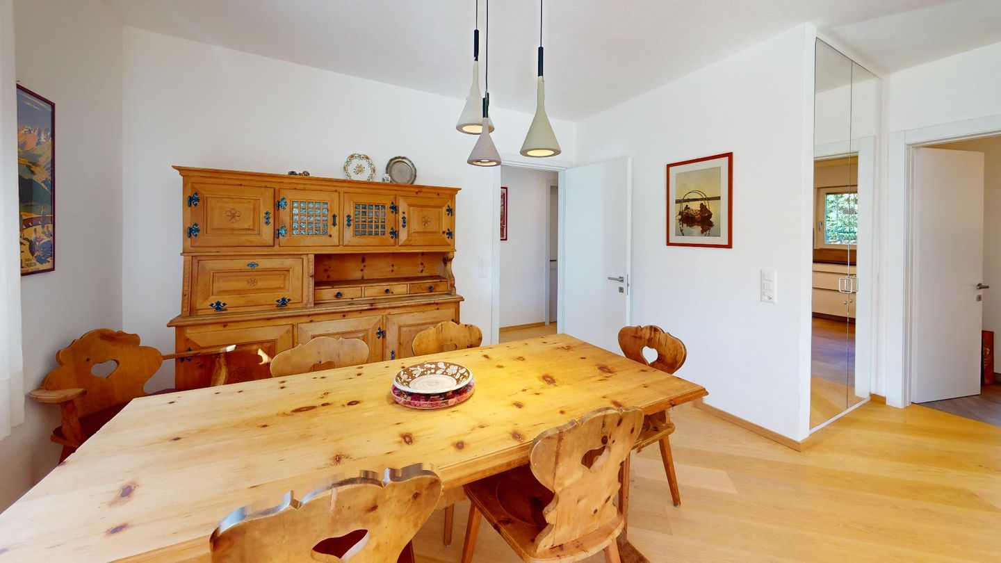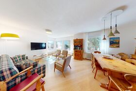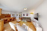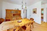 Diese stilvoll eingerichtete und lichtdurchflutete 3.5-Zimmer-Ferienwohnung im 1. Obergeschoss überzeugt durch ihre moderne Ausstattung, die angenehme Wohnatmosphäre und eine attraktive Aussicht auf die umliegende Landschaft. Der offene Wohn- und Essbereich lädt mit warmen Farben und geschmackvollem Interieur zum Verweilen ein. Die gut ausgestattete Küche bietet alles, was man für entspannte Kochmomente im Urlaub benötigt – funktional, modern und bestens integriert in den Wohnraum.