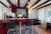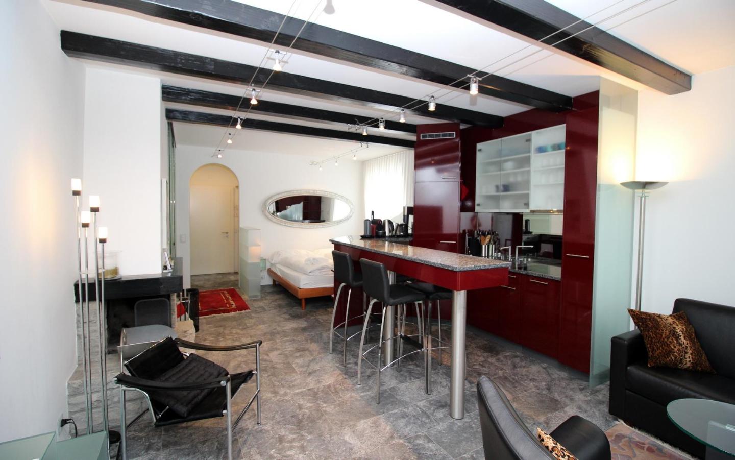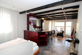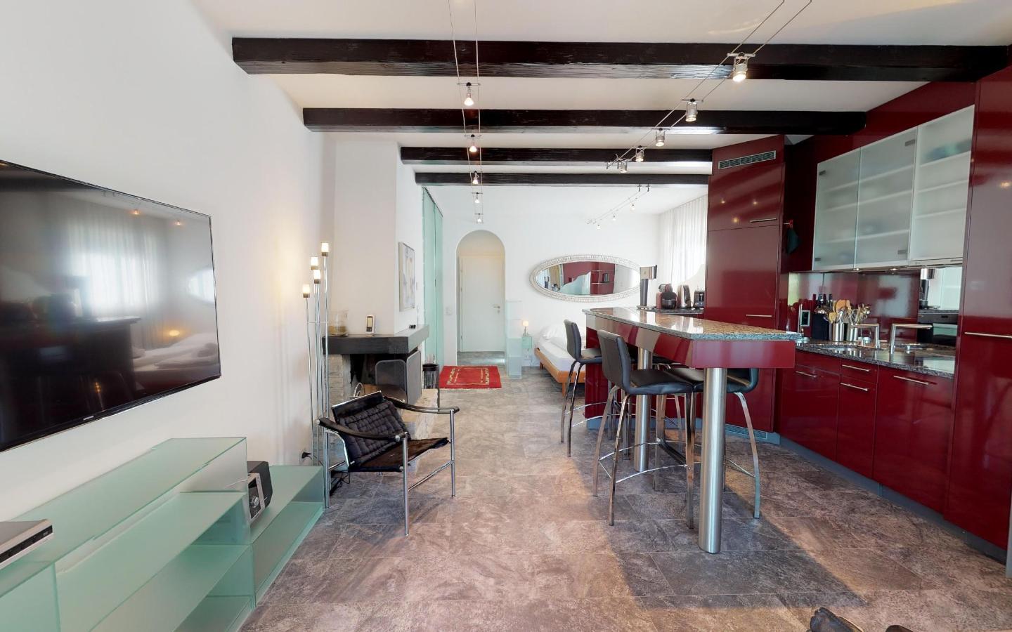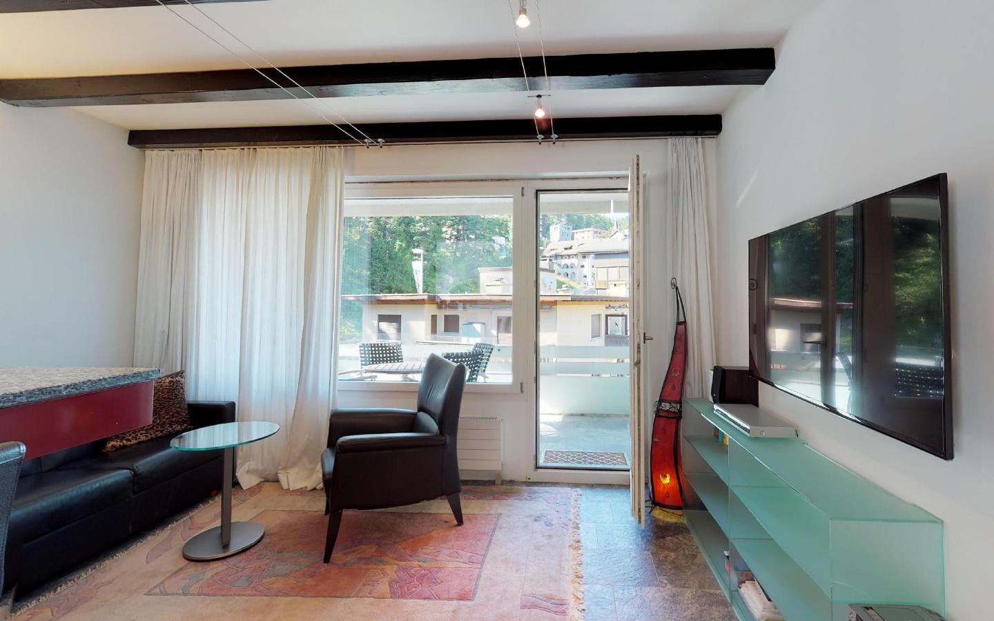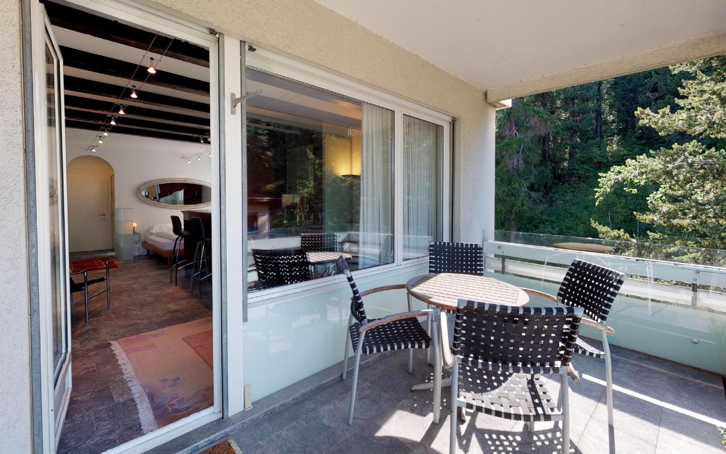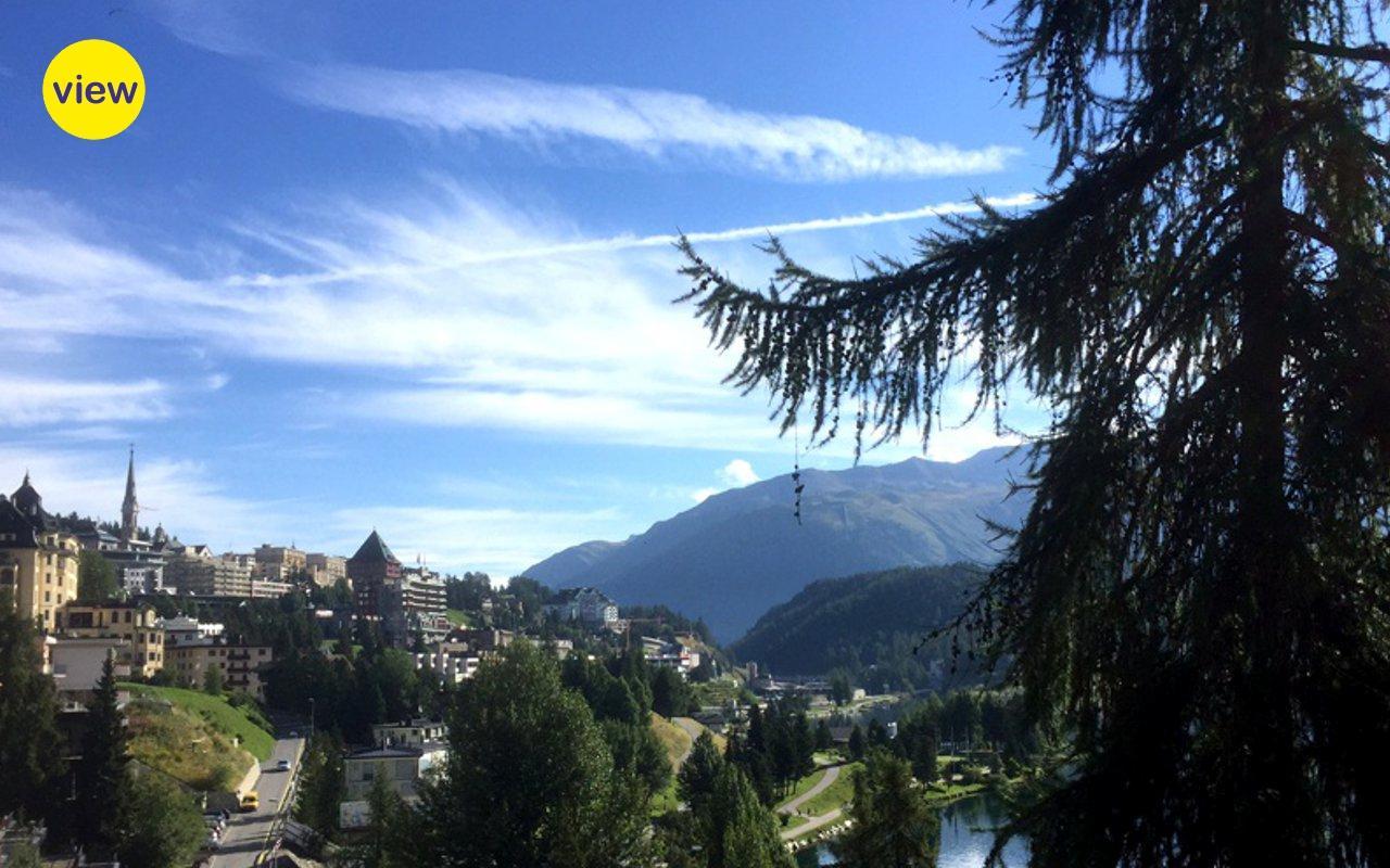 Renovierte, gemütliche 1.5 - Zimmer Ferienwohnung. Wohnzimmer mit Kamin und Schlafecke mit Doppelbett. Separates Badezimmer. Offene gut eingerichtete Bar-Küche. Balkon mit Panoramablick auf St. Moritz-Dorf (Palace-Hotel). Lift und Aussenparkplatz.