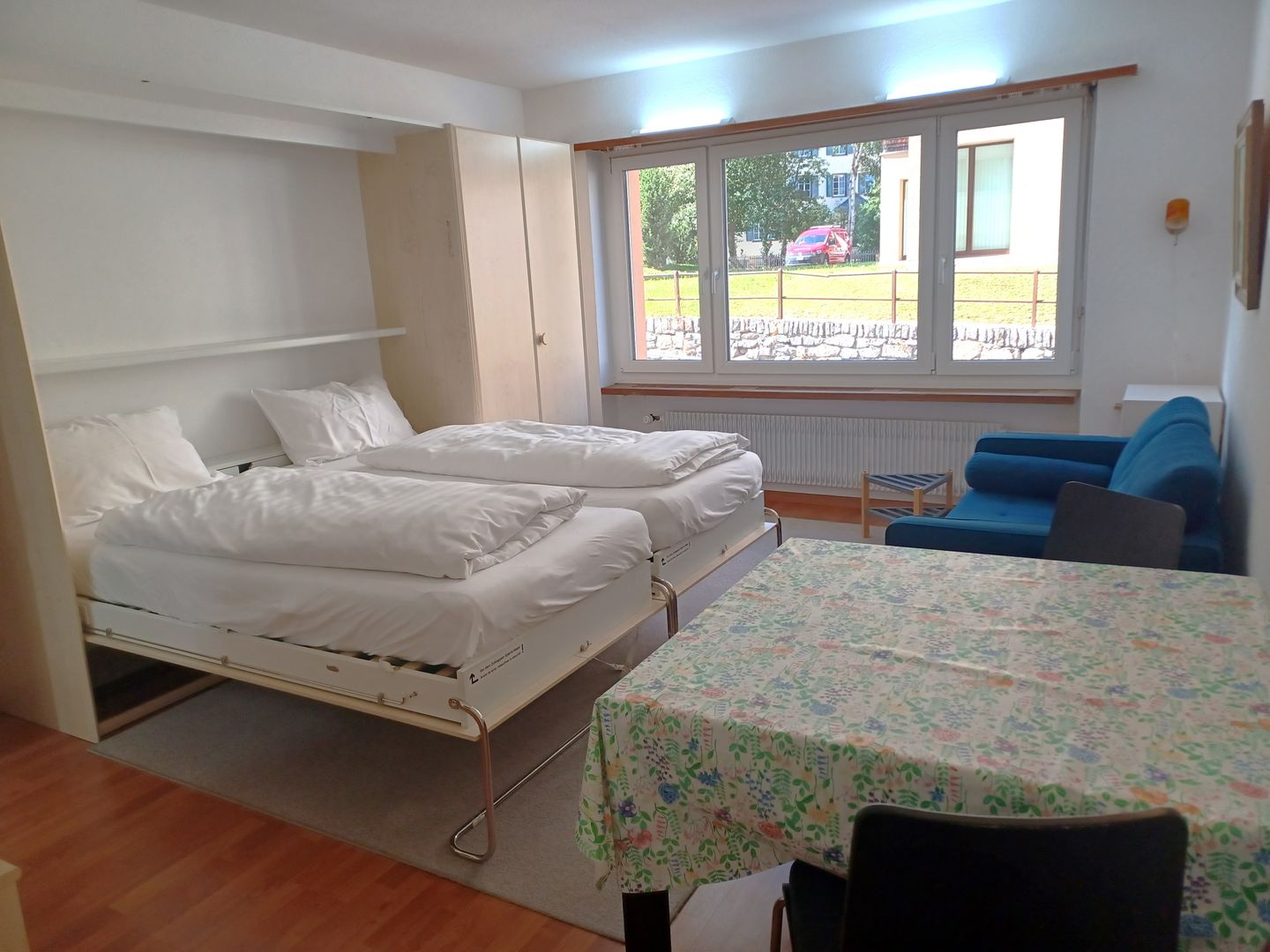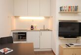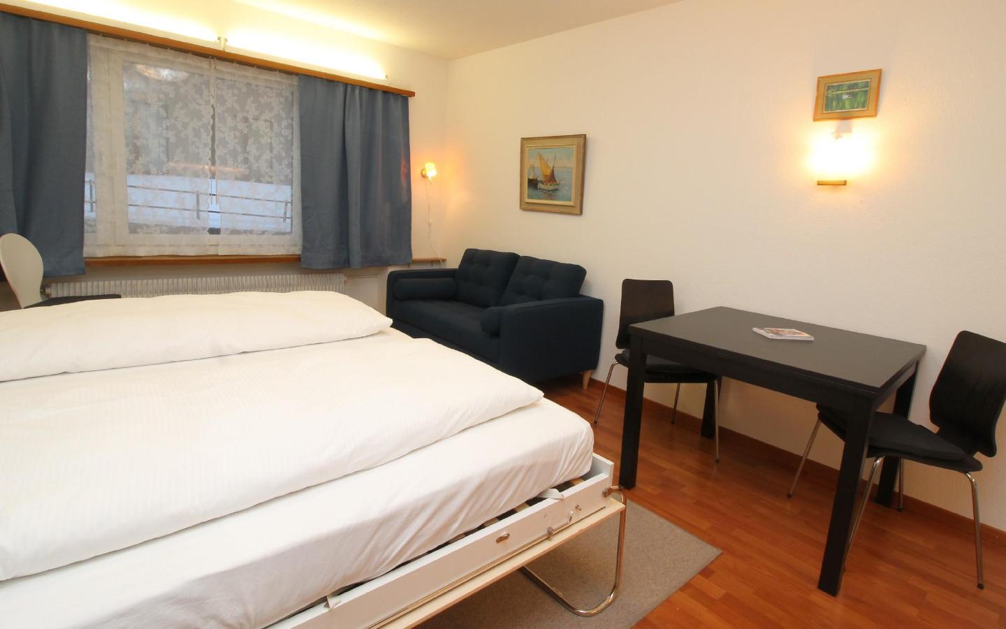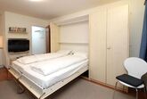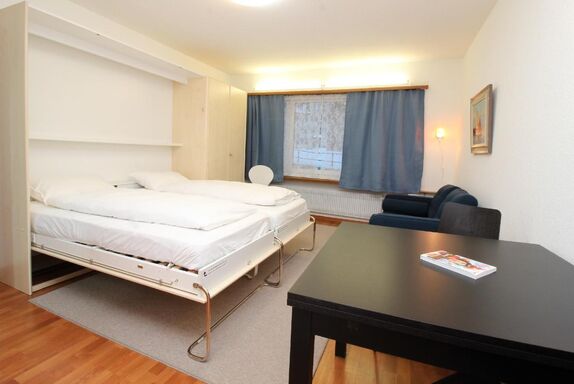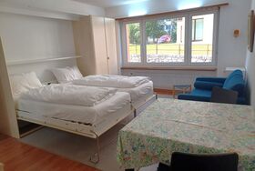 Renoviertes, nettes Studio im 1. Stock. Zirka 28 m2. Wohn-/ Esszimmer mit Schrankbetten, Offene Küche ohne GS, Dusche, WC. Lift.