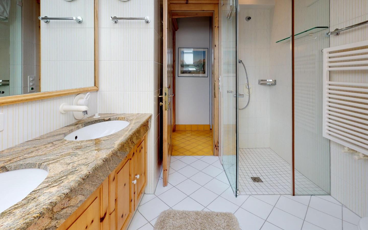 Grosszügiges Entreé mit Gästetoilette. Wohnraum mit Kamin und Terrasse. Küche mit Zugang zum Esszimmer. Schlafzimmer mit Bad/DU. Oberer Stock: 3 Schlafzimmer mit zwei Bad/DU. 1 Garagenplatz.