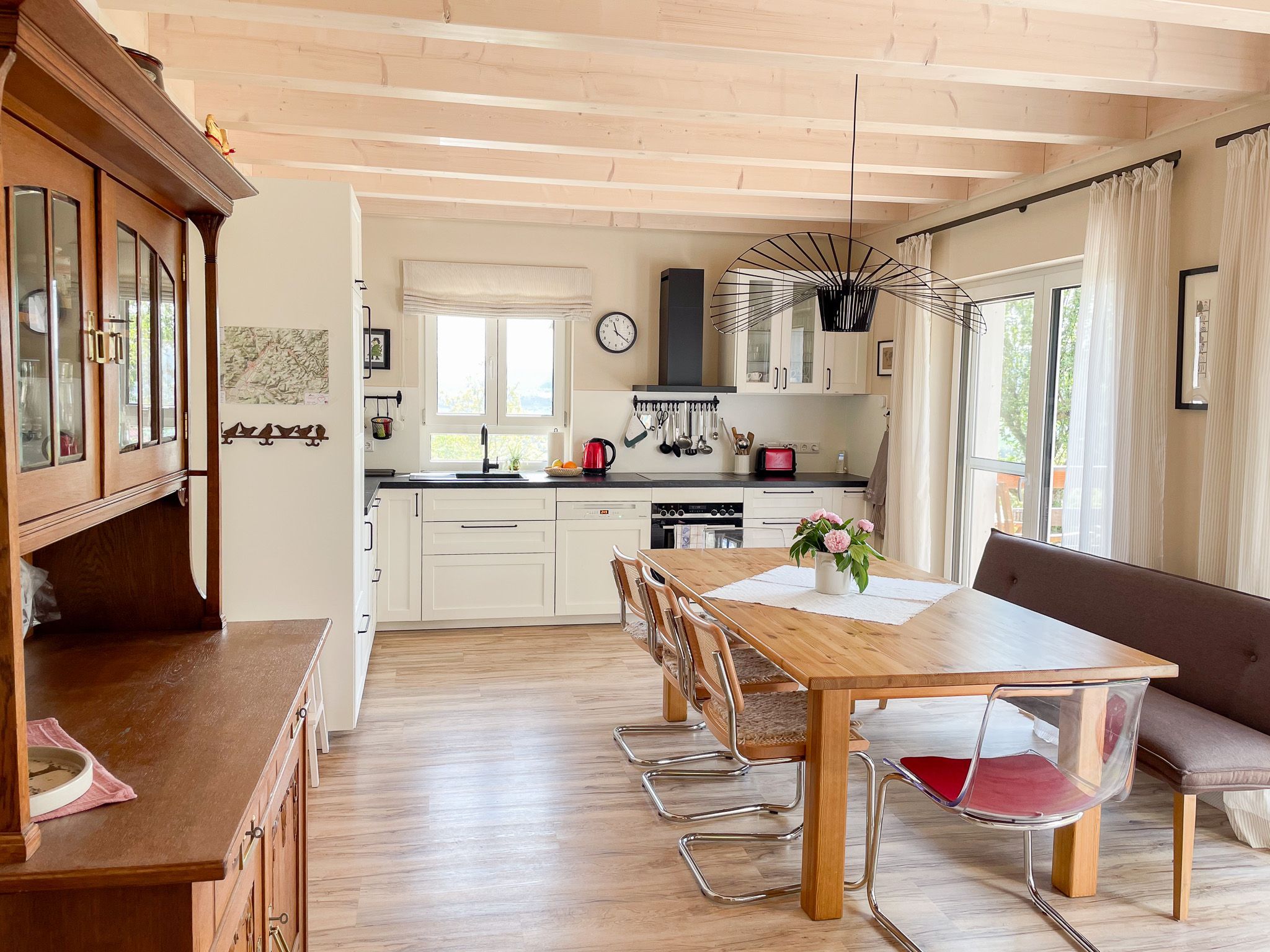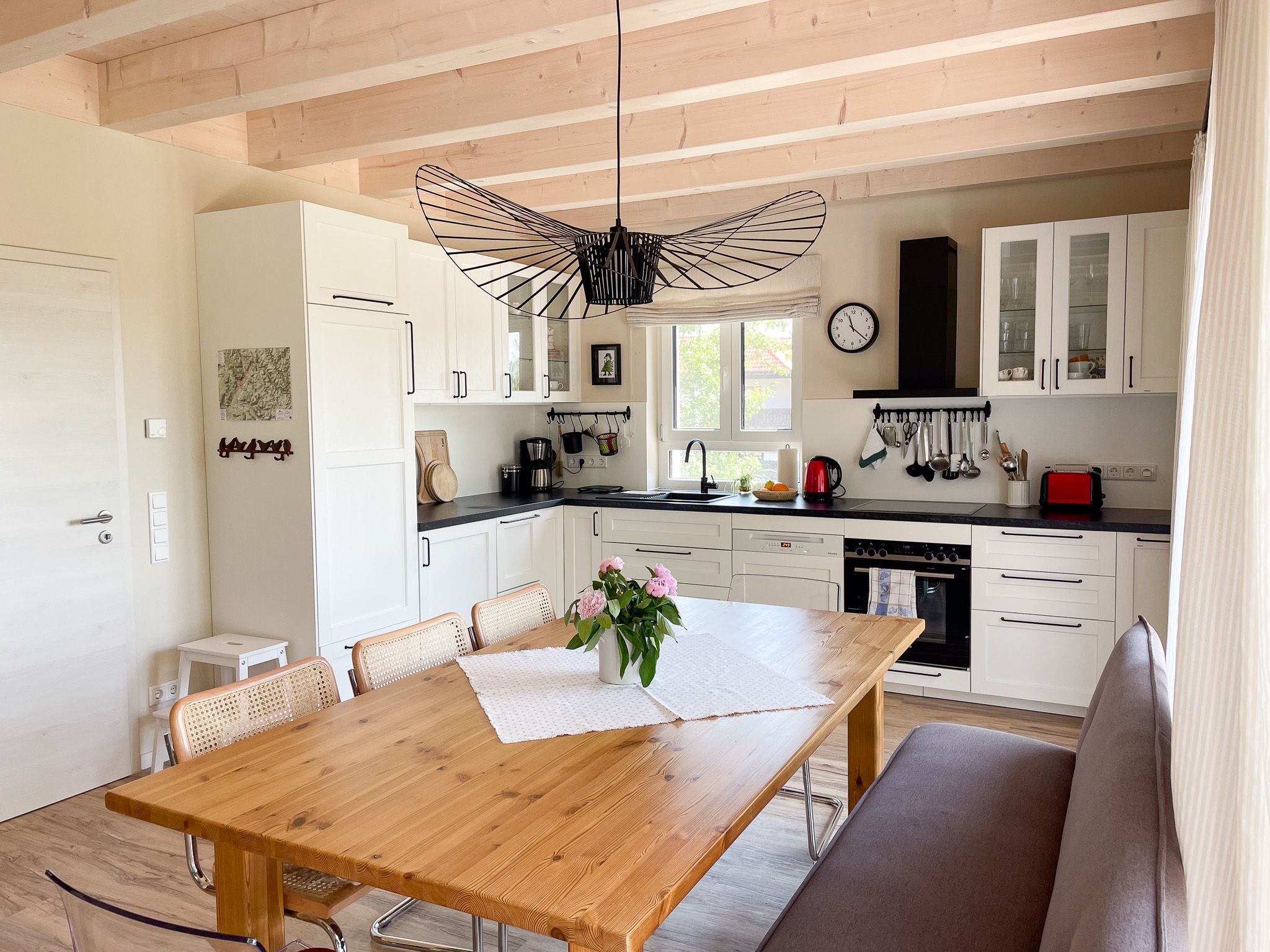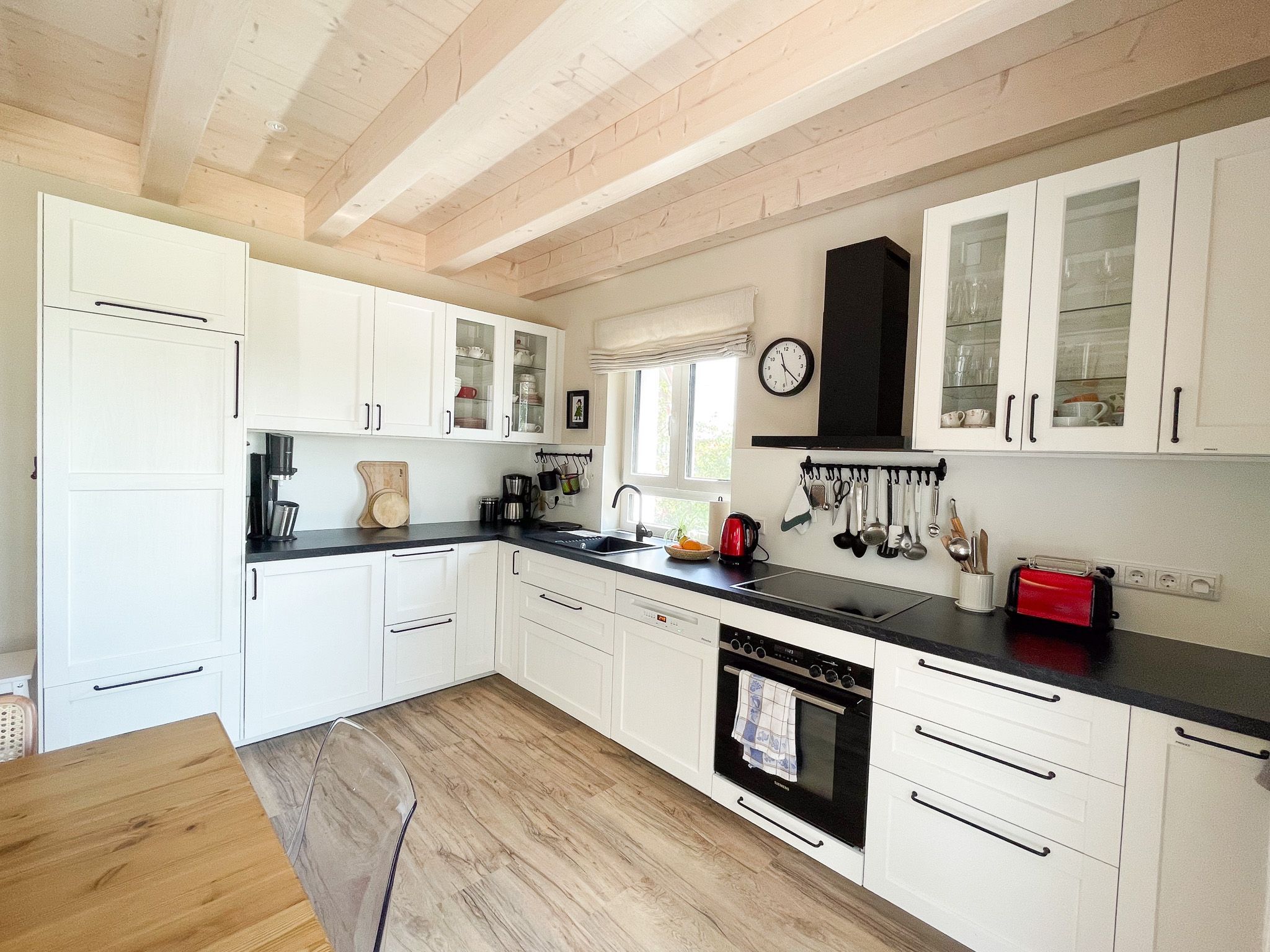 Ausstattung Küche: Induktionsherd, Backofen, Geschirrspülmaschine, Kühlschrank mit Gefrierfach, Kaffeemaschine, Milchschäumer, Toaster, Wassersprudler, Wasserkocher, Eierkocher, Handrührer, Mixer, Waschmaschine
