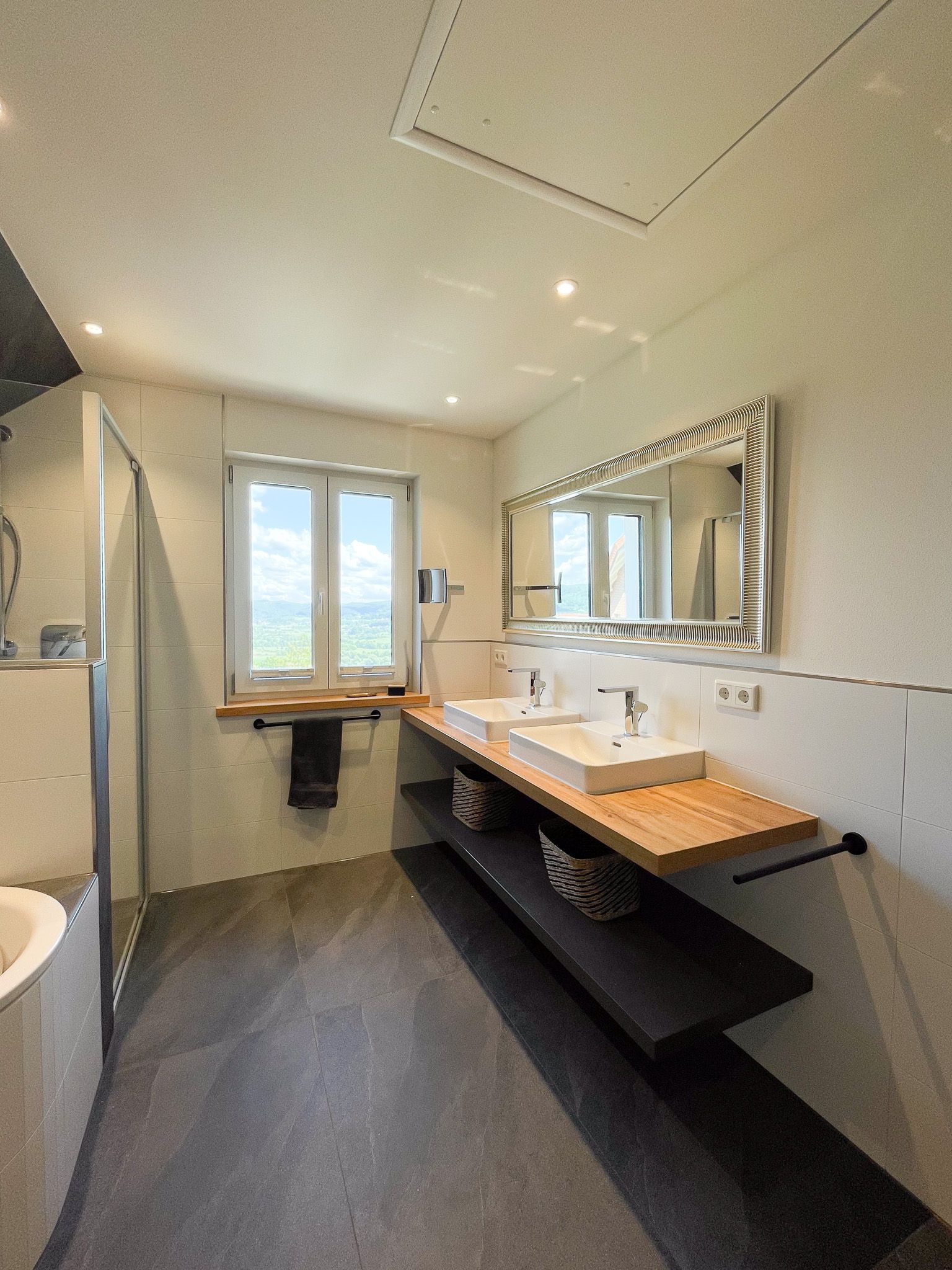 Ausstattung Bad OG: Badewanne, Dusche, WC, 2 Waschbecken, Handtuchheizung, Haartrockner, Kosmetikspiegel, Kinderhocker,