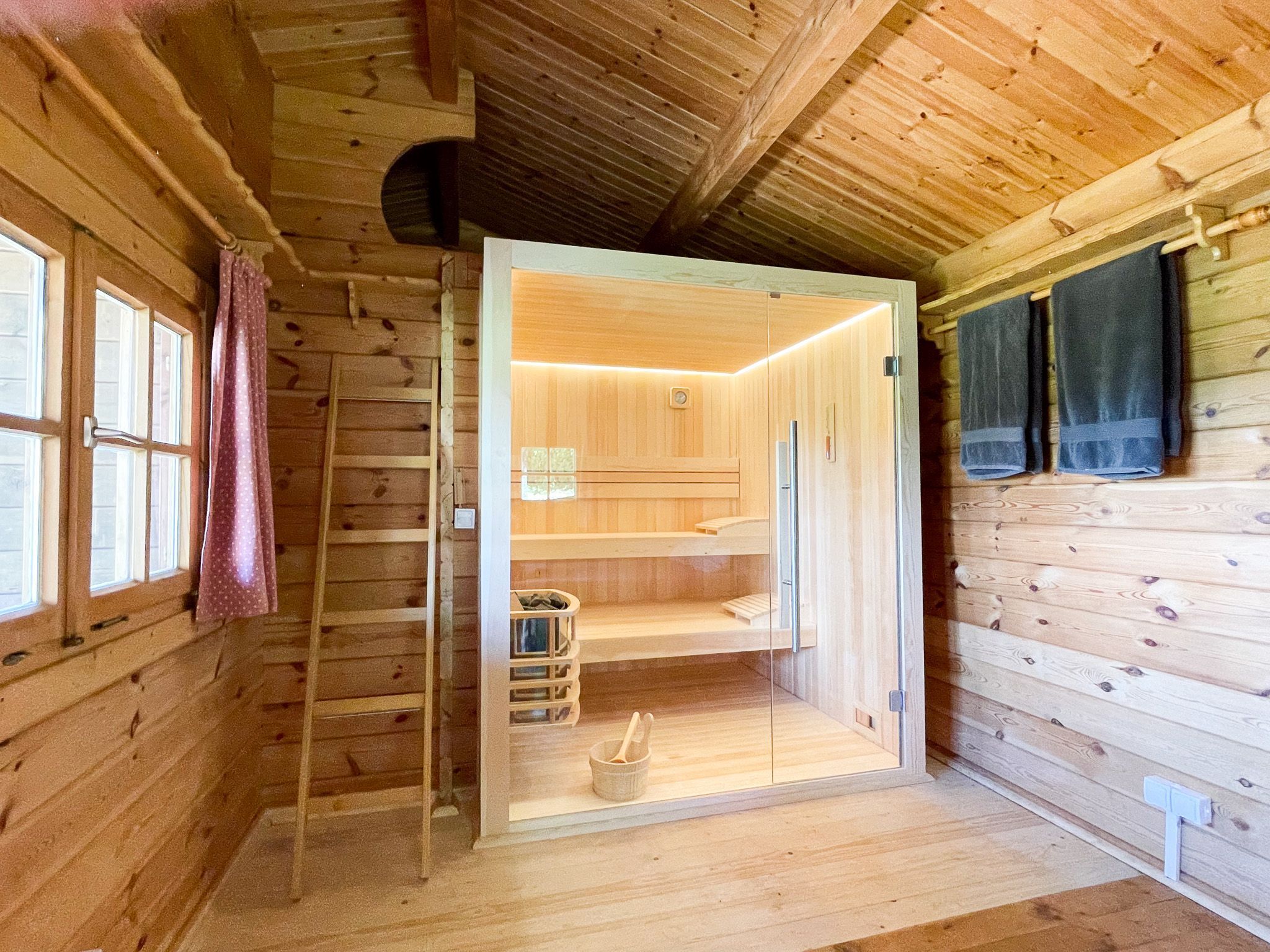Im kleinen Holzhäuschen auf dem Gelände wurde eine finnische Sauna eingebaut, im Häuschen gibt es eine Liege zum Ruhen sowie nochmals eine Waschmöglichkeit und ein WC.